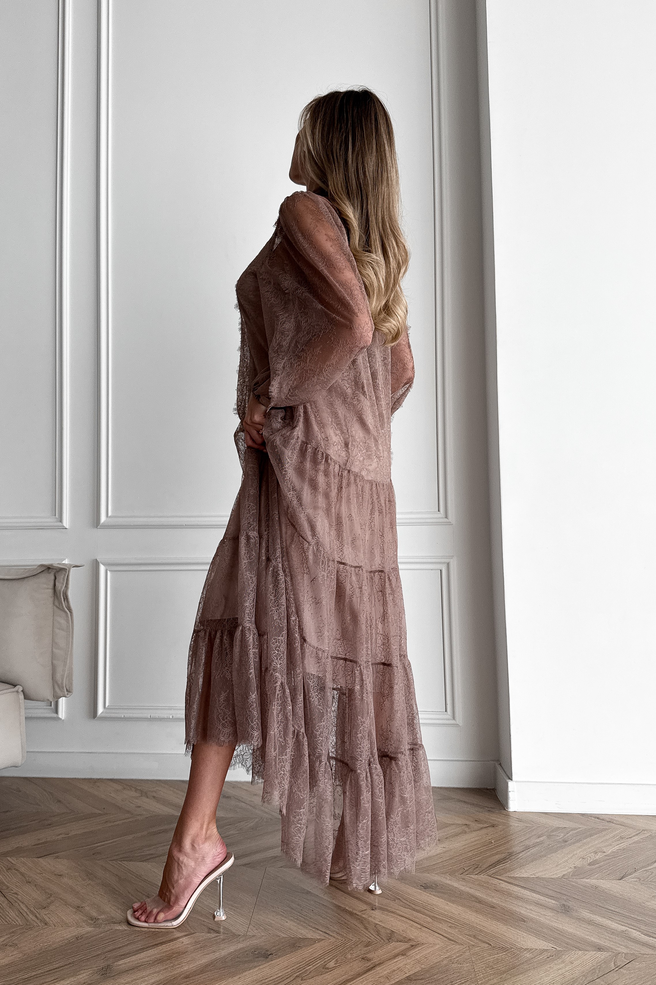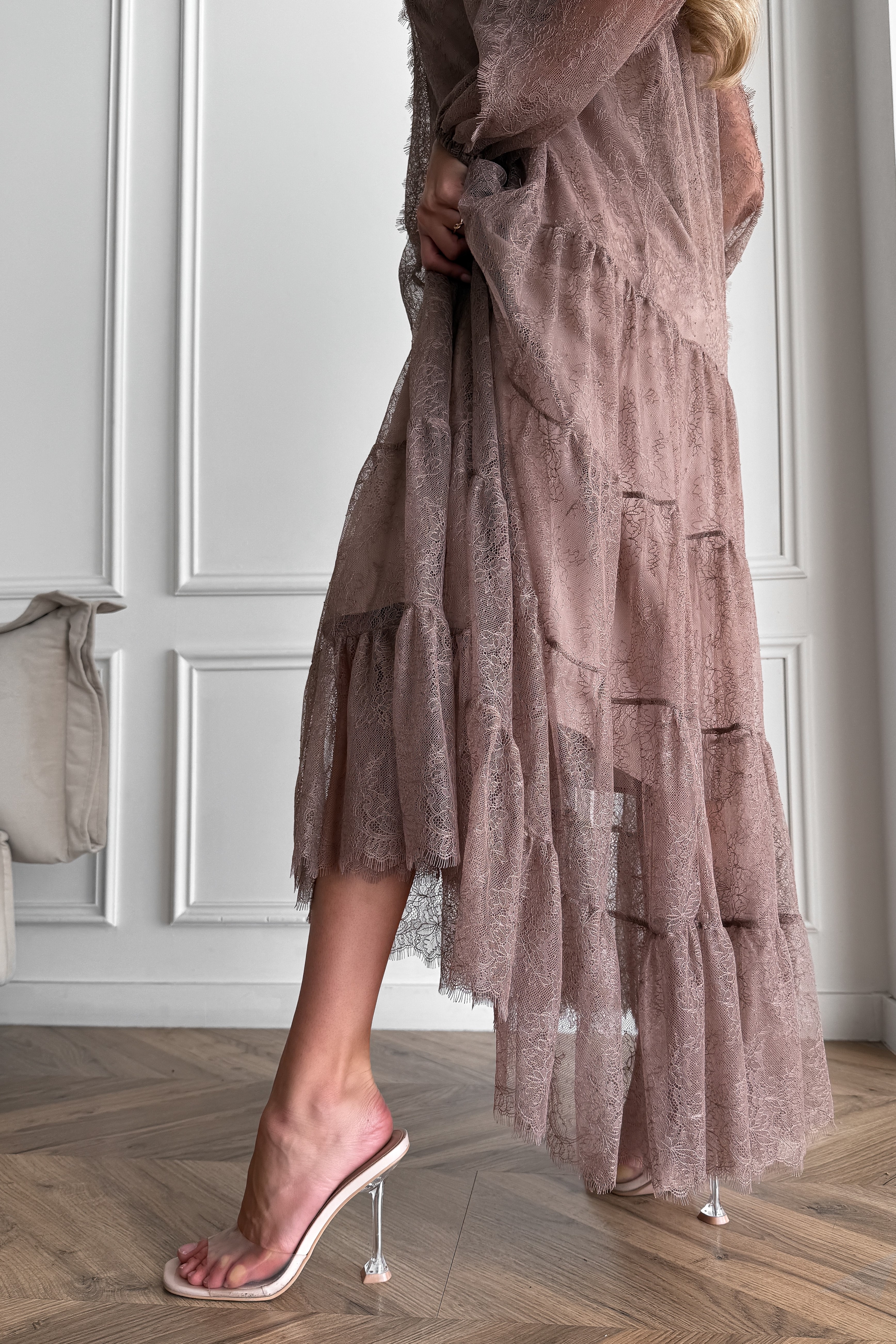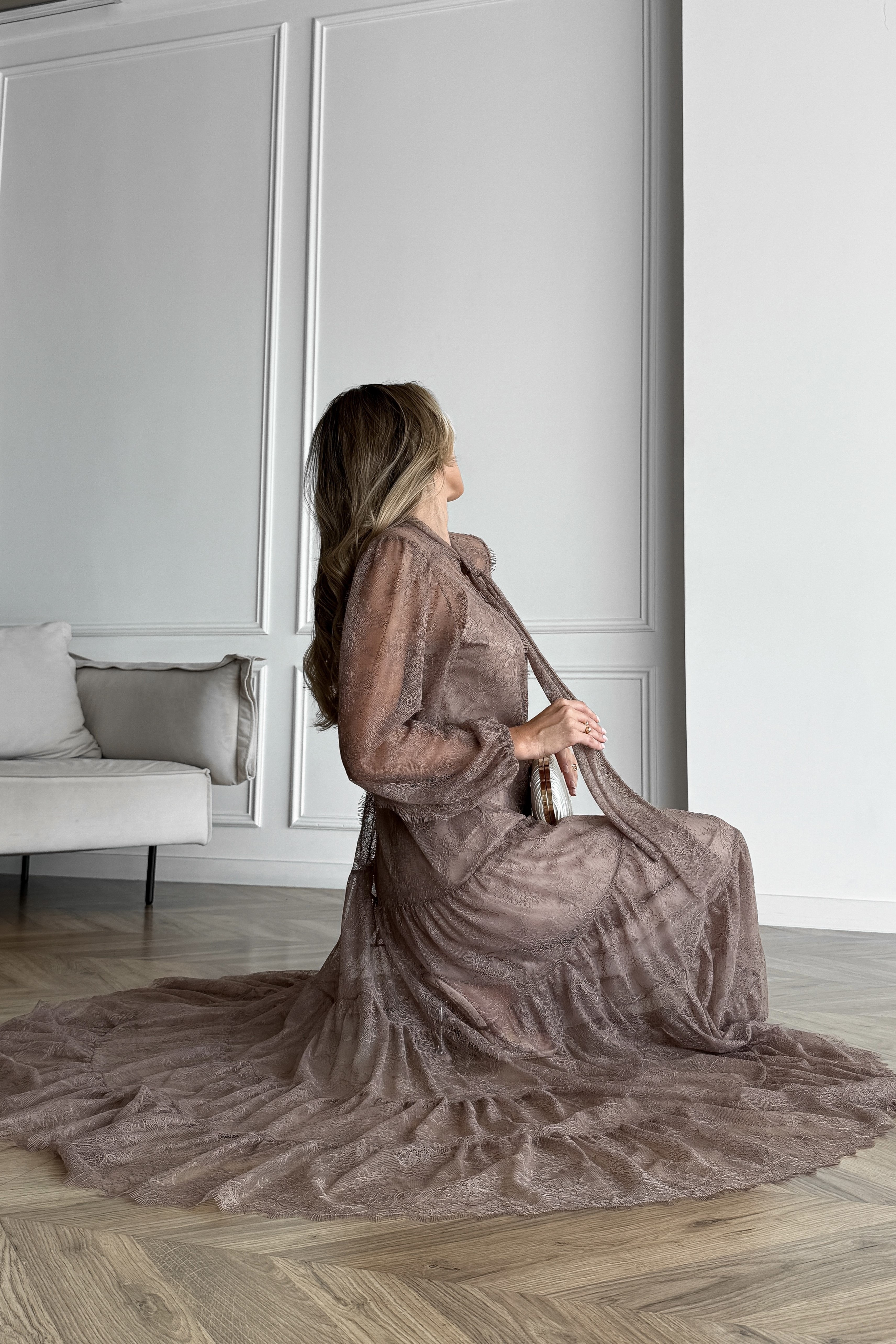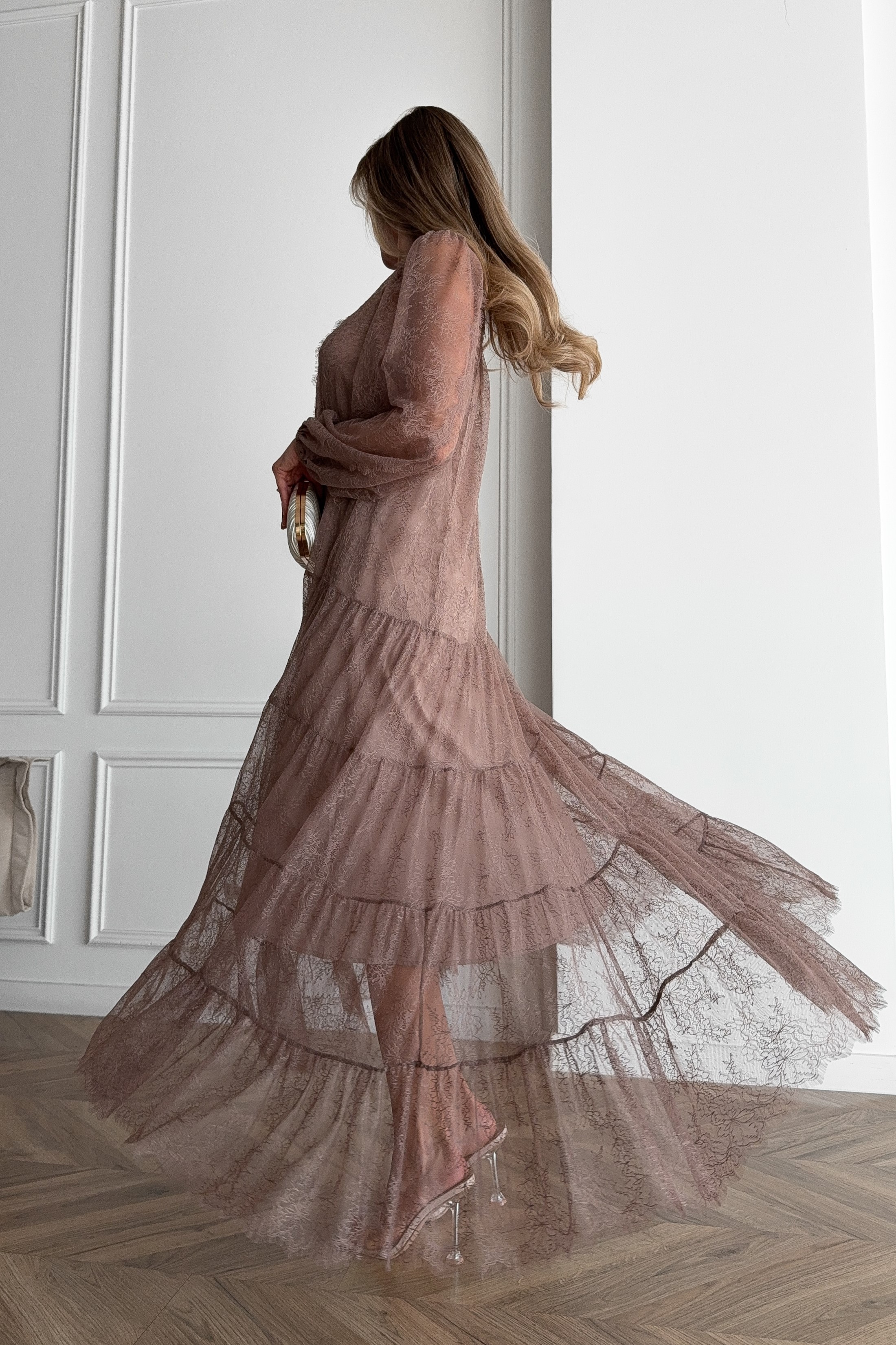 Lace long dress of a free silhouette, with a beige dress cover on straps