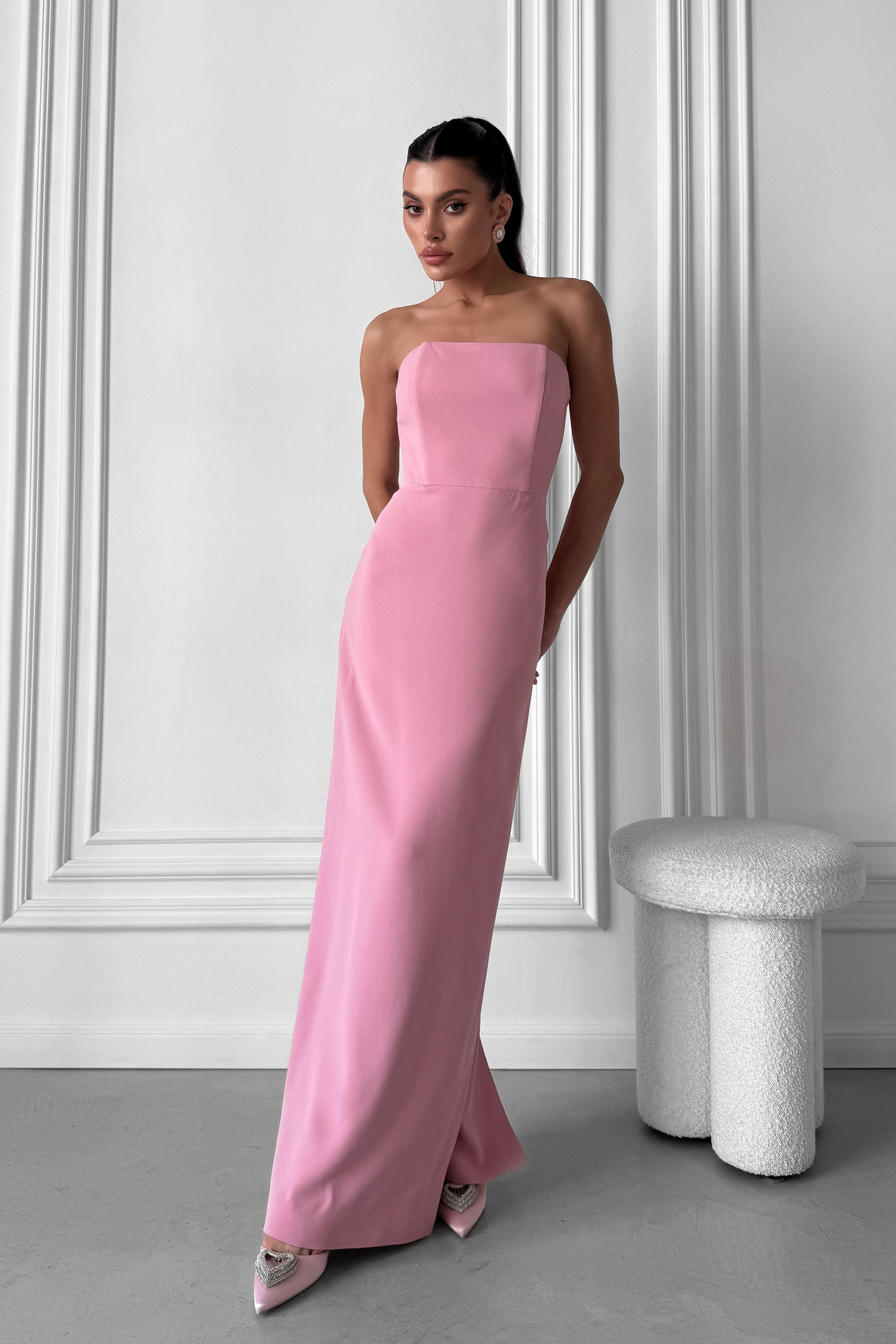 - With a corset, a long, straight, floor-length skirt, a slit in the back, and a concealed back closure
