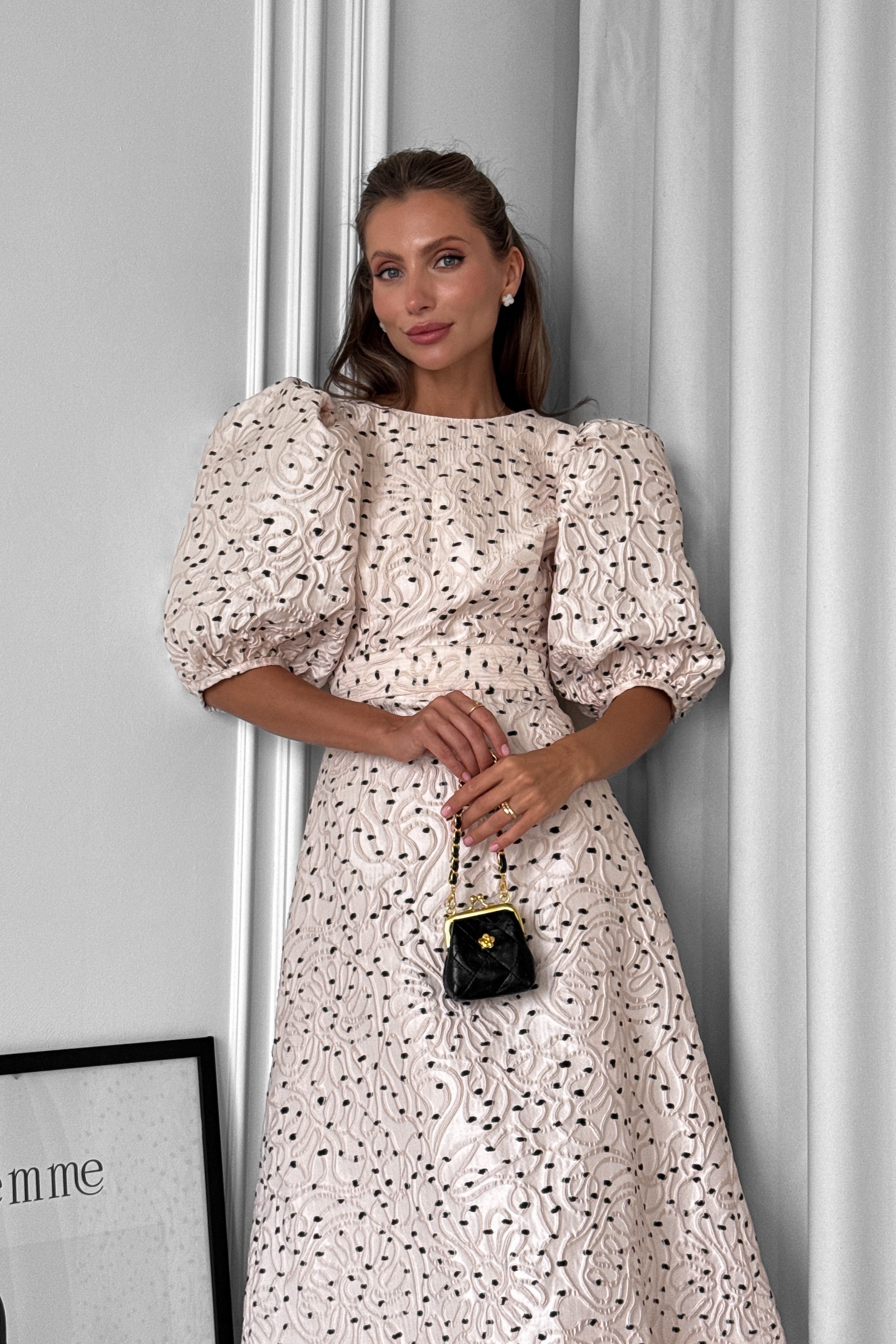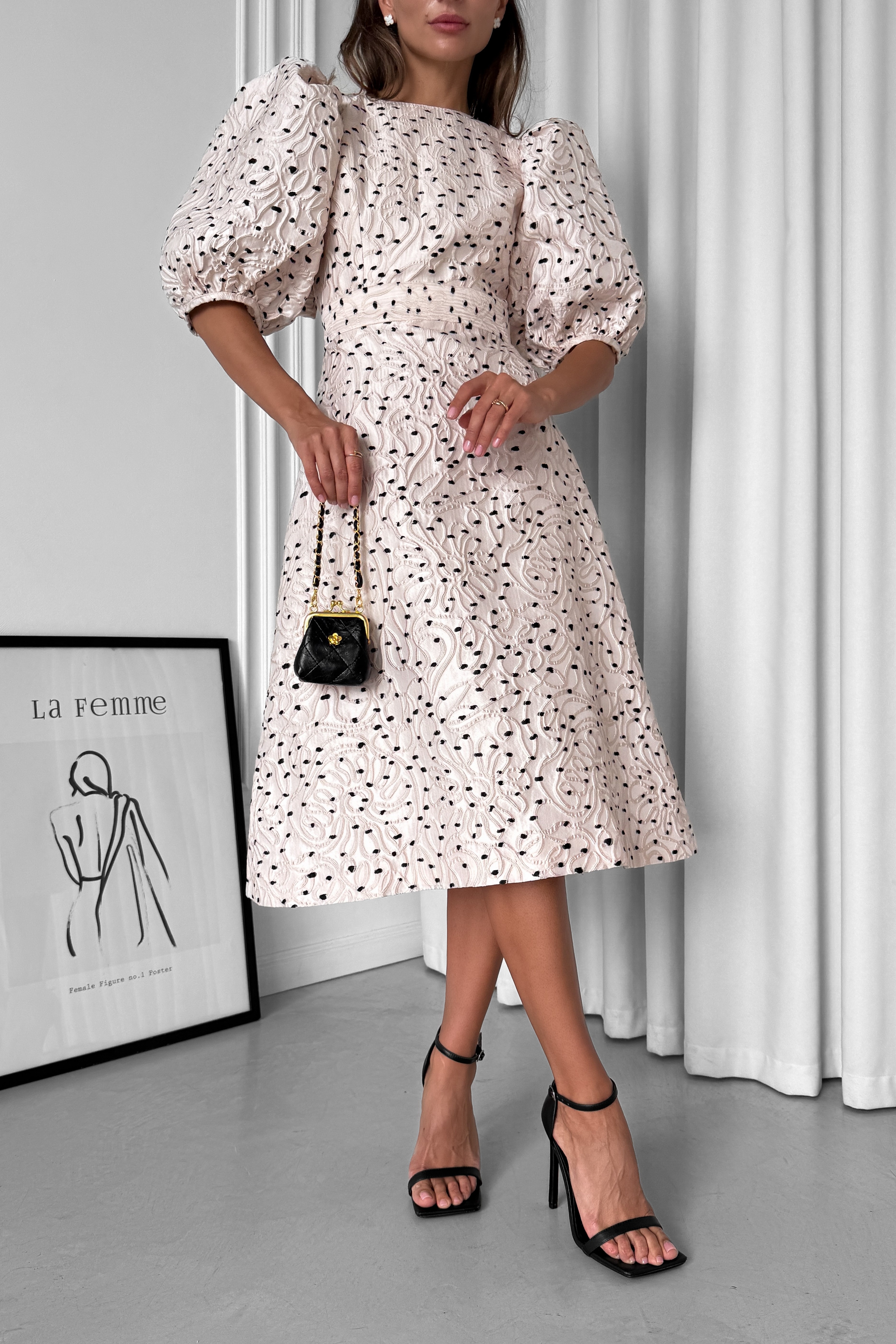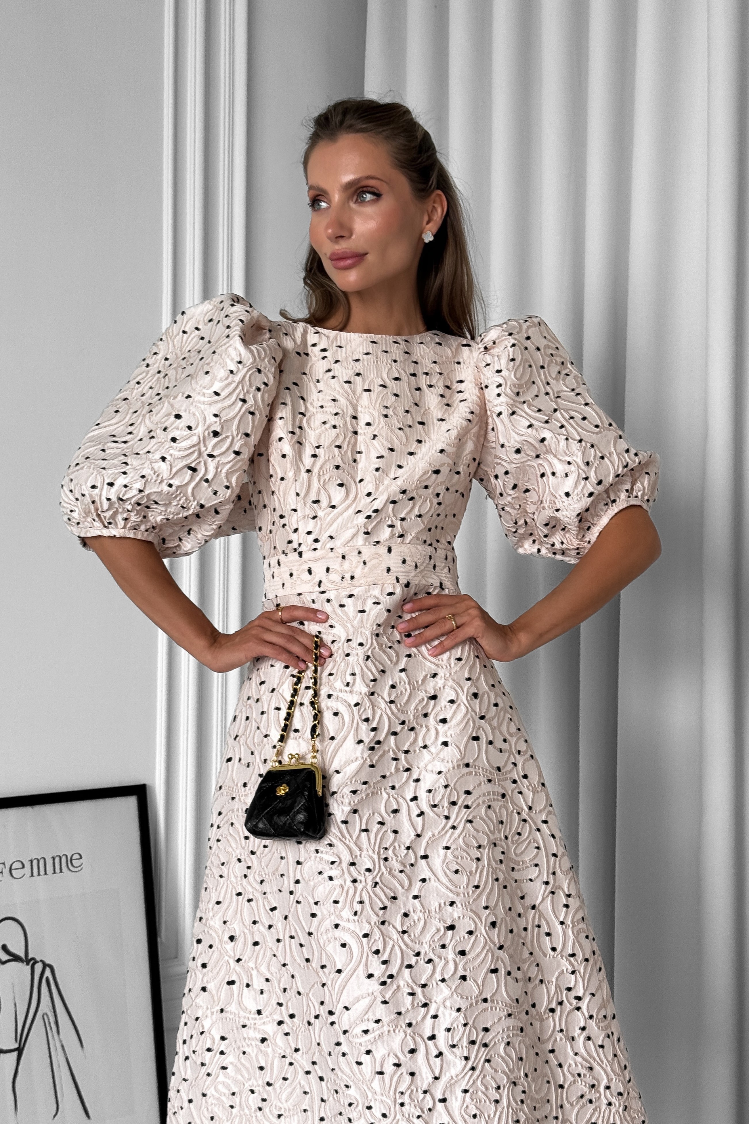 - Halter neckline, A-line skirt, open back, bow detail at the back, puff sleeves