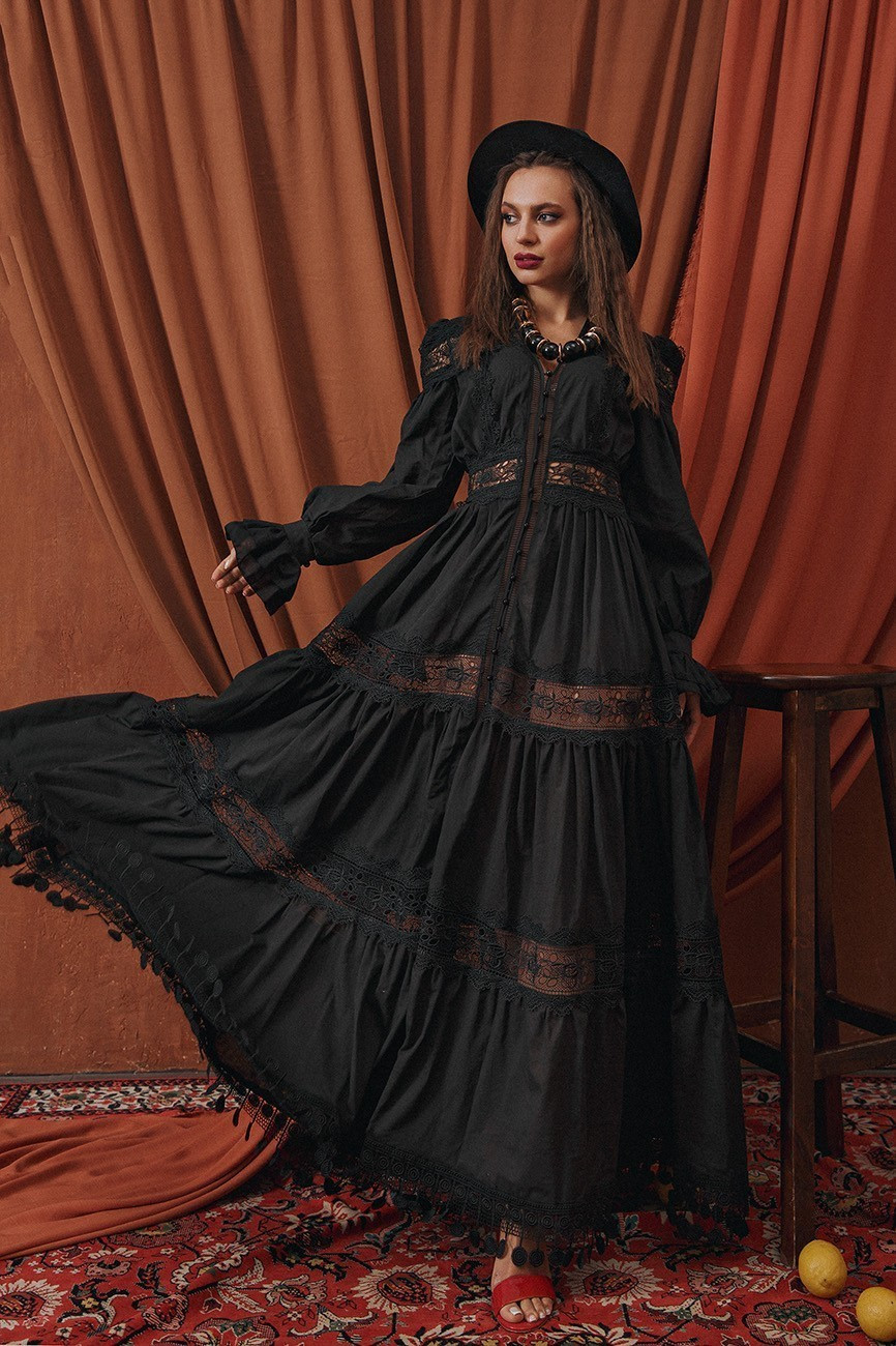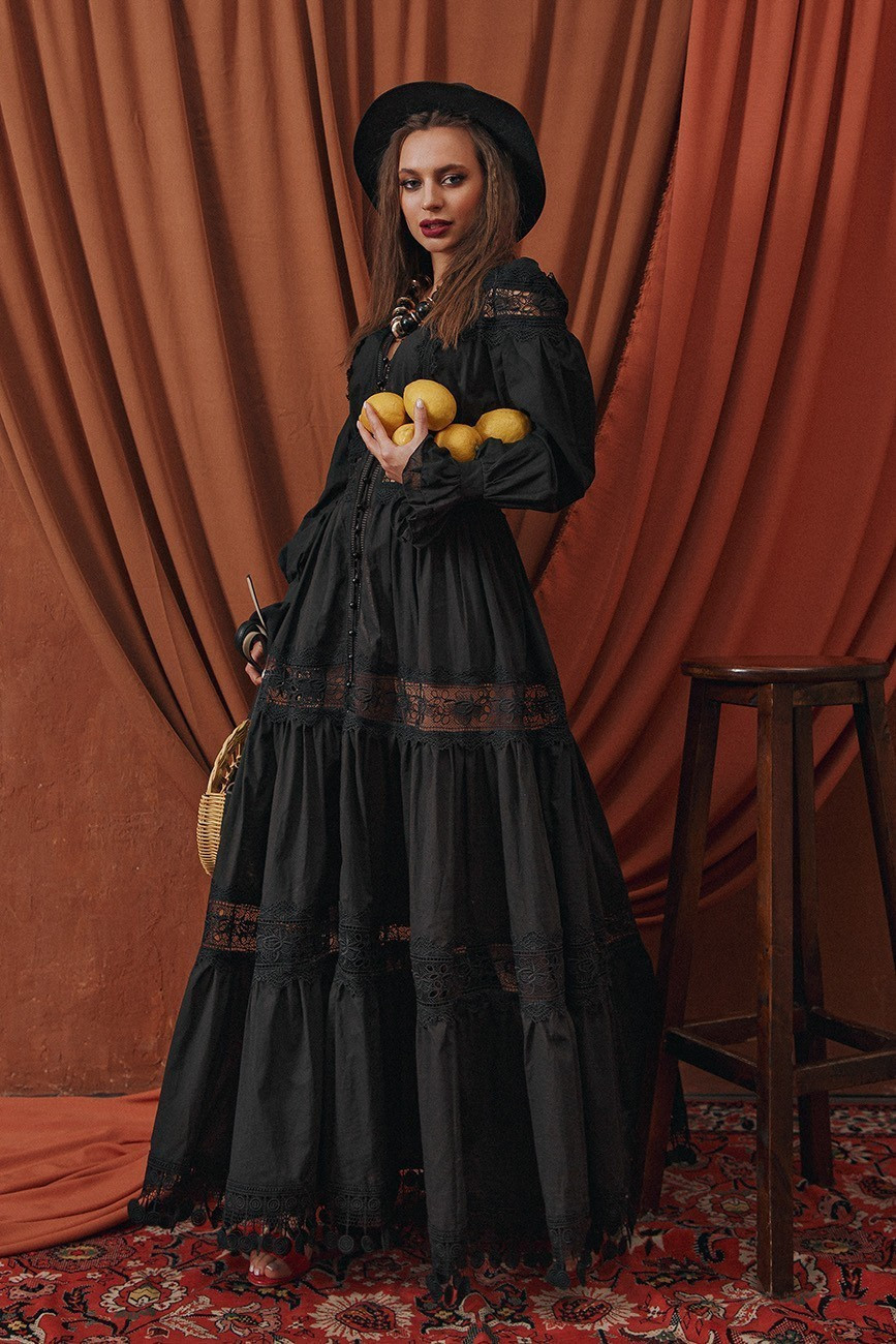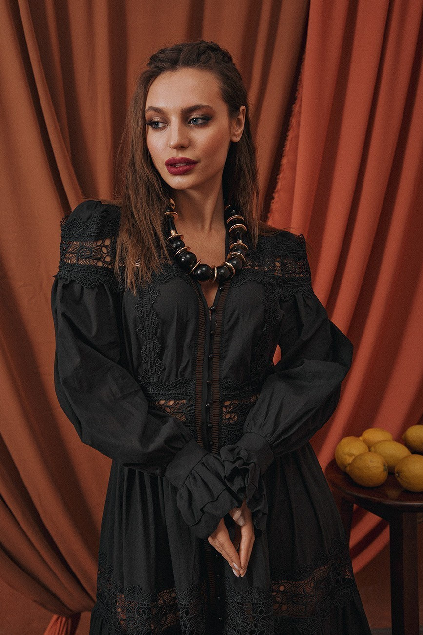 Elegant cotton dress adjacent silhouette, with lush skirt, with lace – incredible and feminine. Lace inserts add special luxury and uniqueness to your image. A short beige lift is attached.