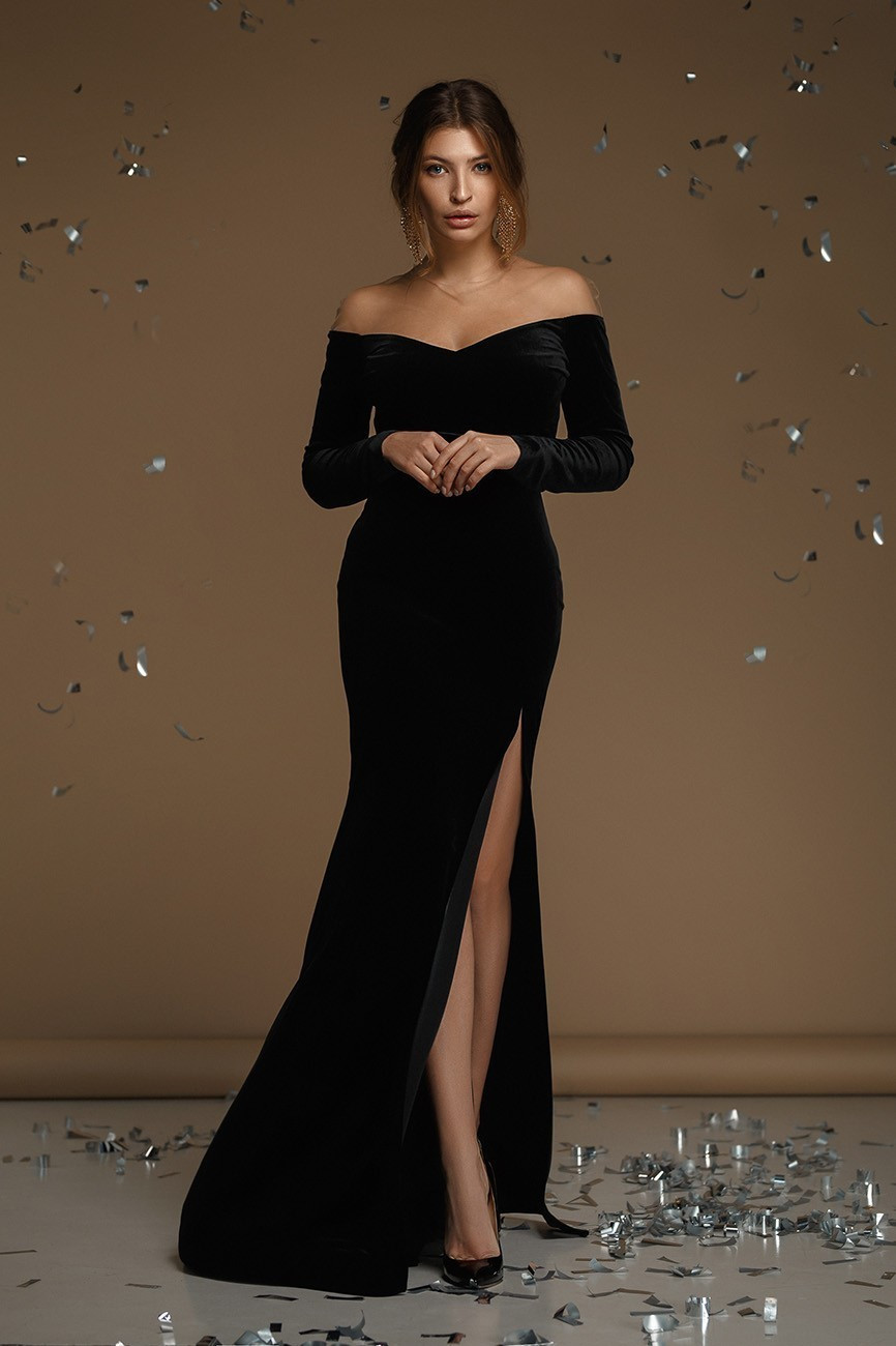 Luxurious velvet dress fish in the floor with a net on the shoulders.