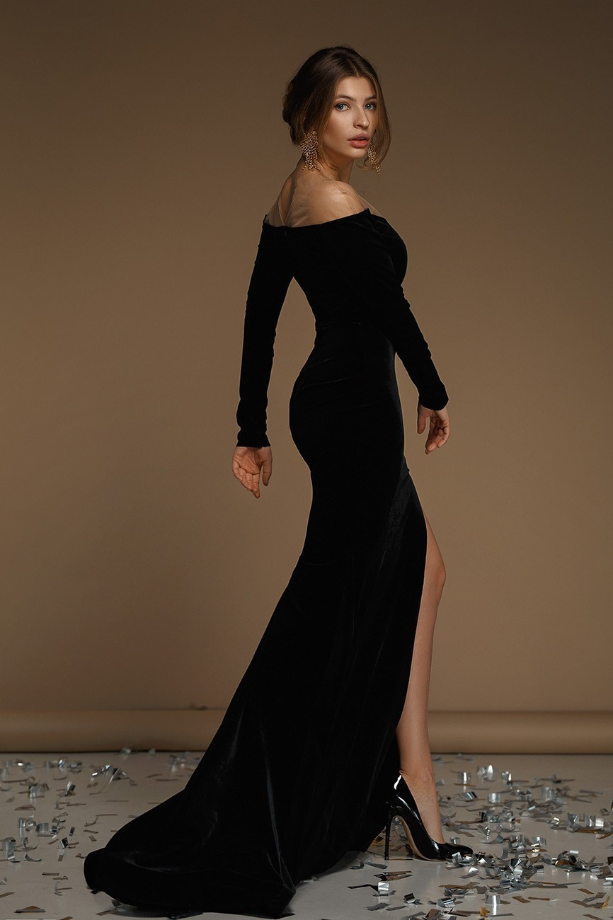 Shape: with a shaped cut cleavage, with a net on the shoulders, in the floor, skirt fish, with a small plume, with a cut on the leg.