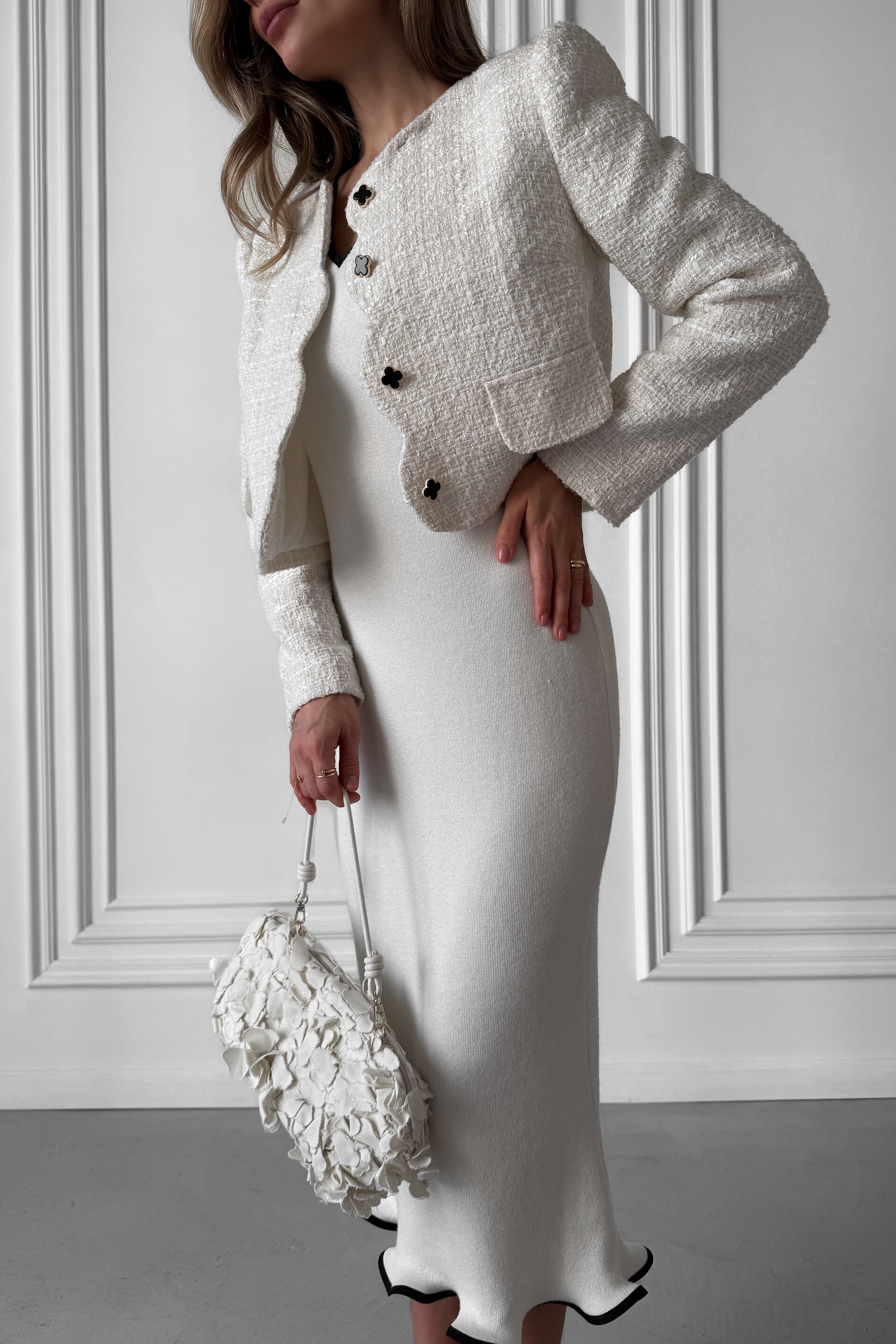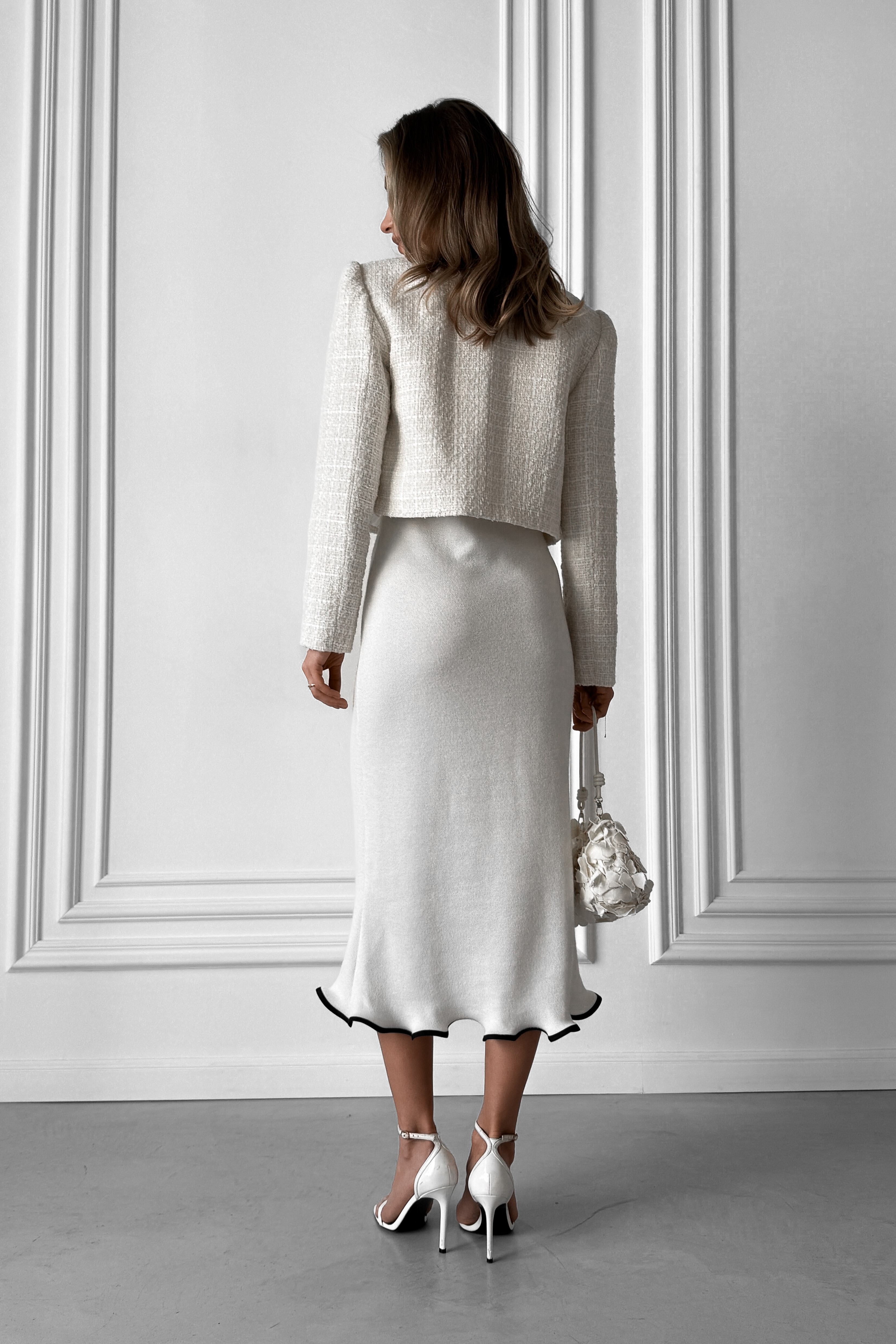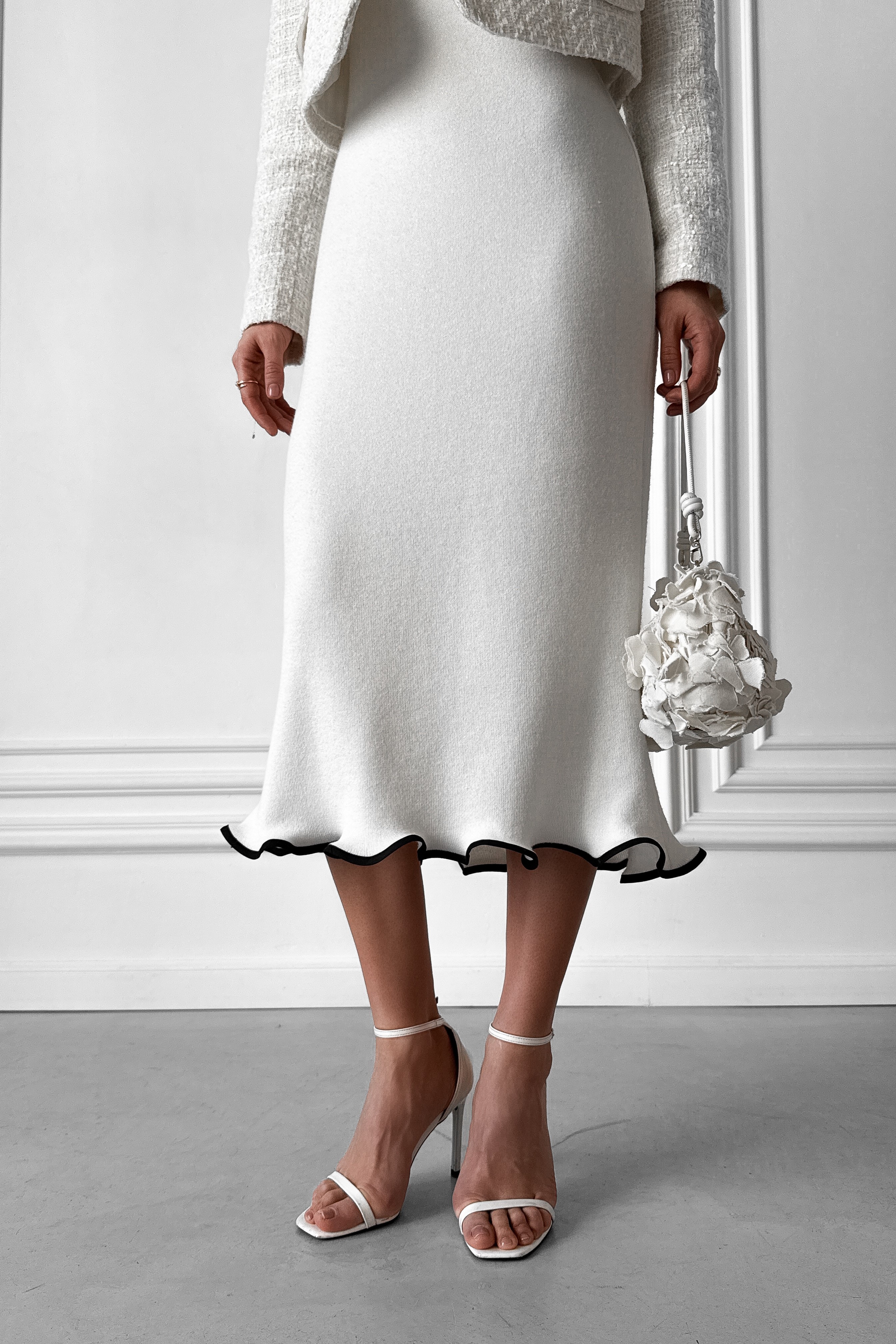Knitted white midi dress without sleeves, with a wave at the bottom