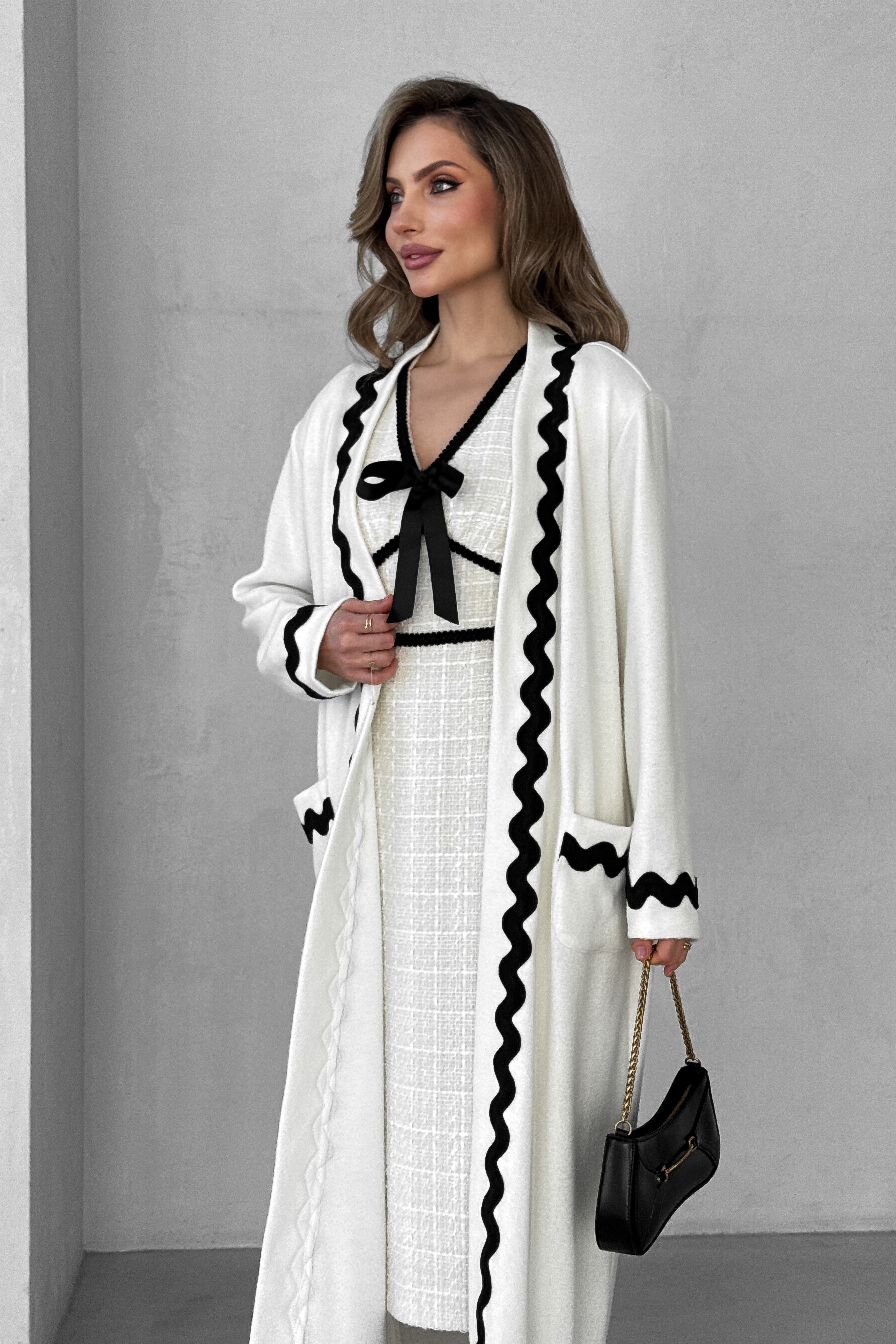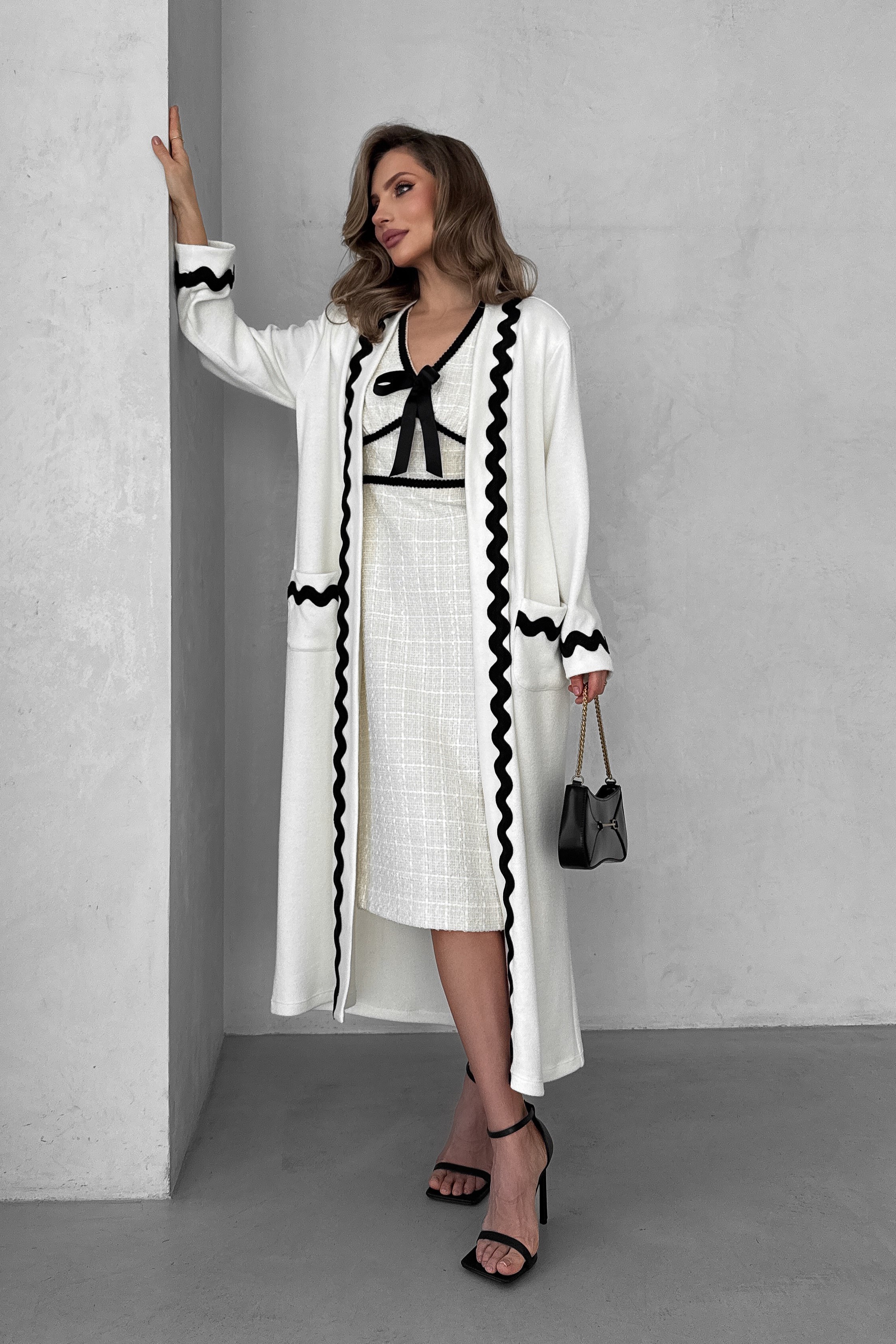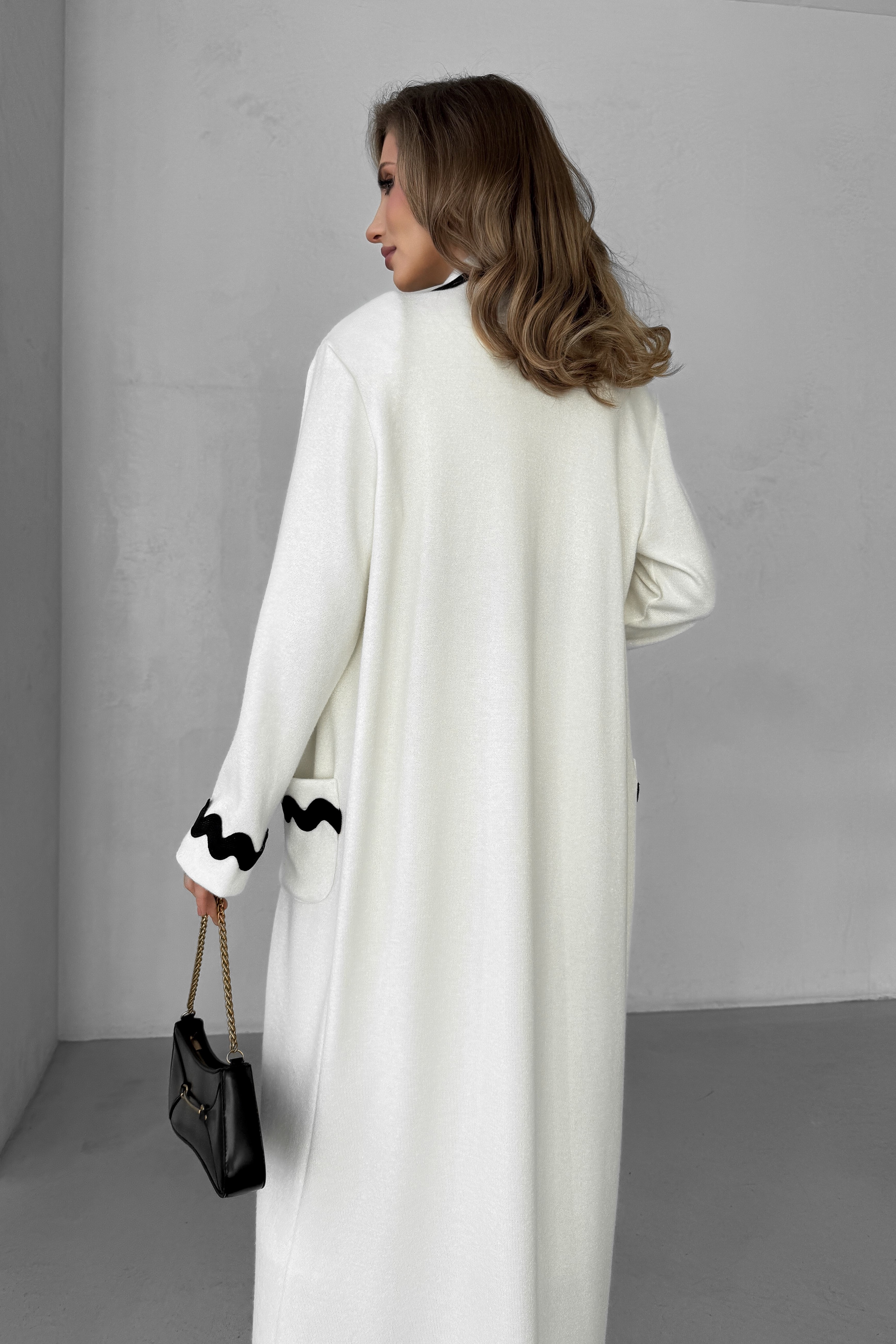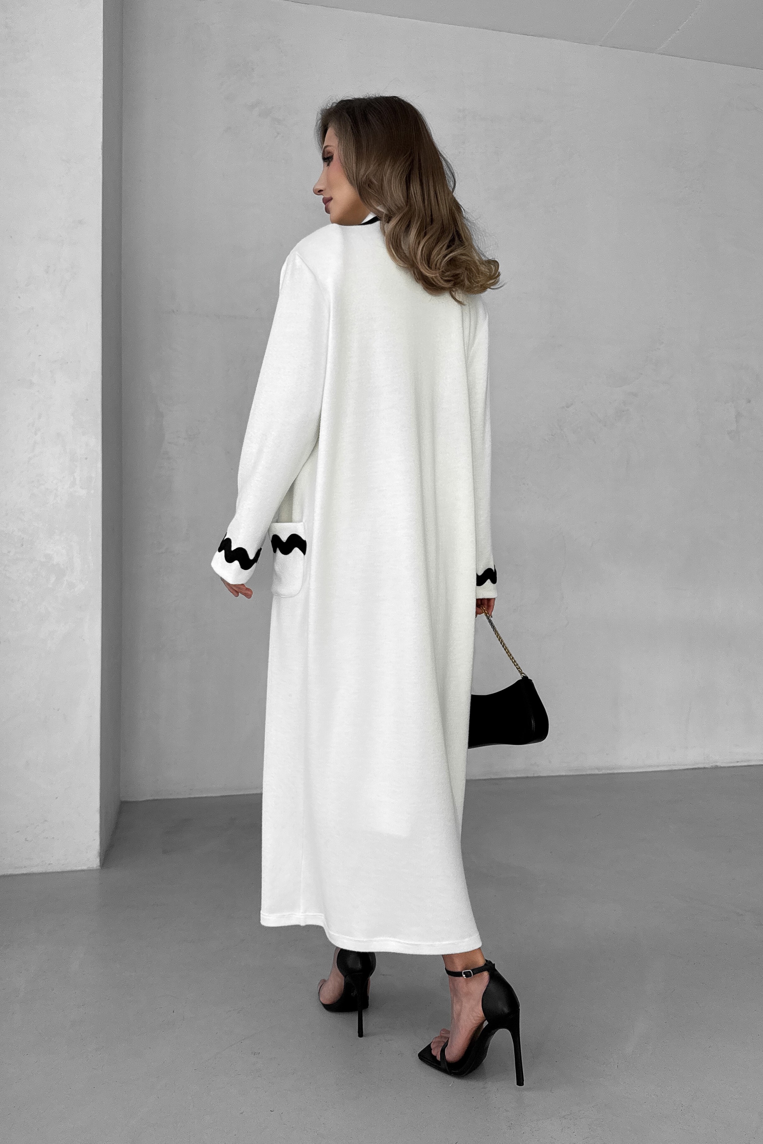 - No collar, long sleeves, below the knees, no fastening, with shoulders down