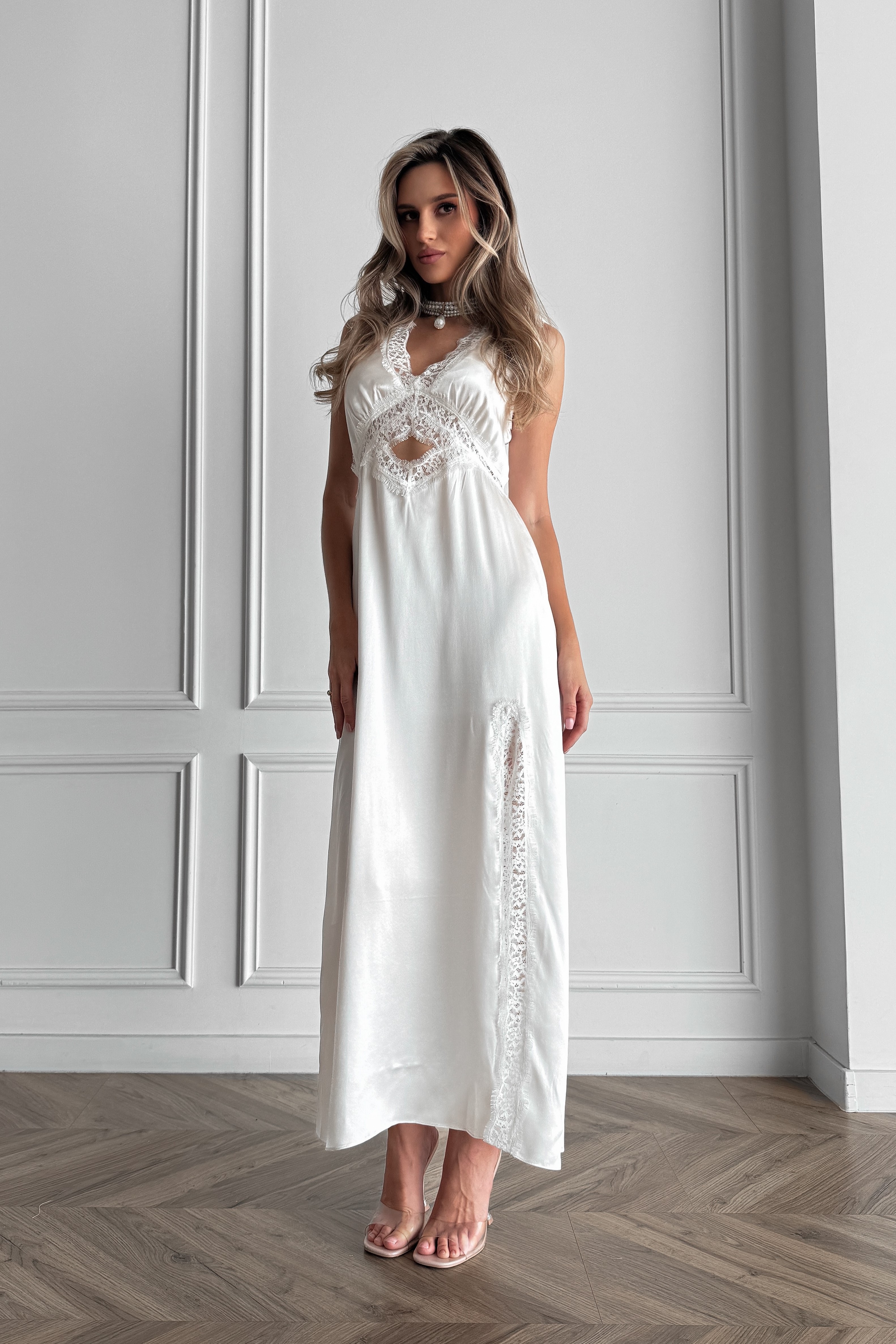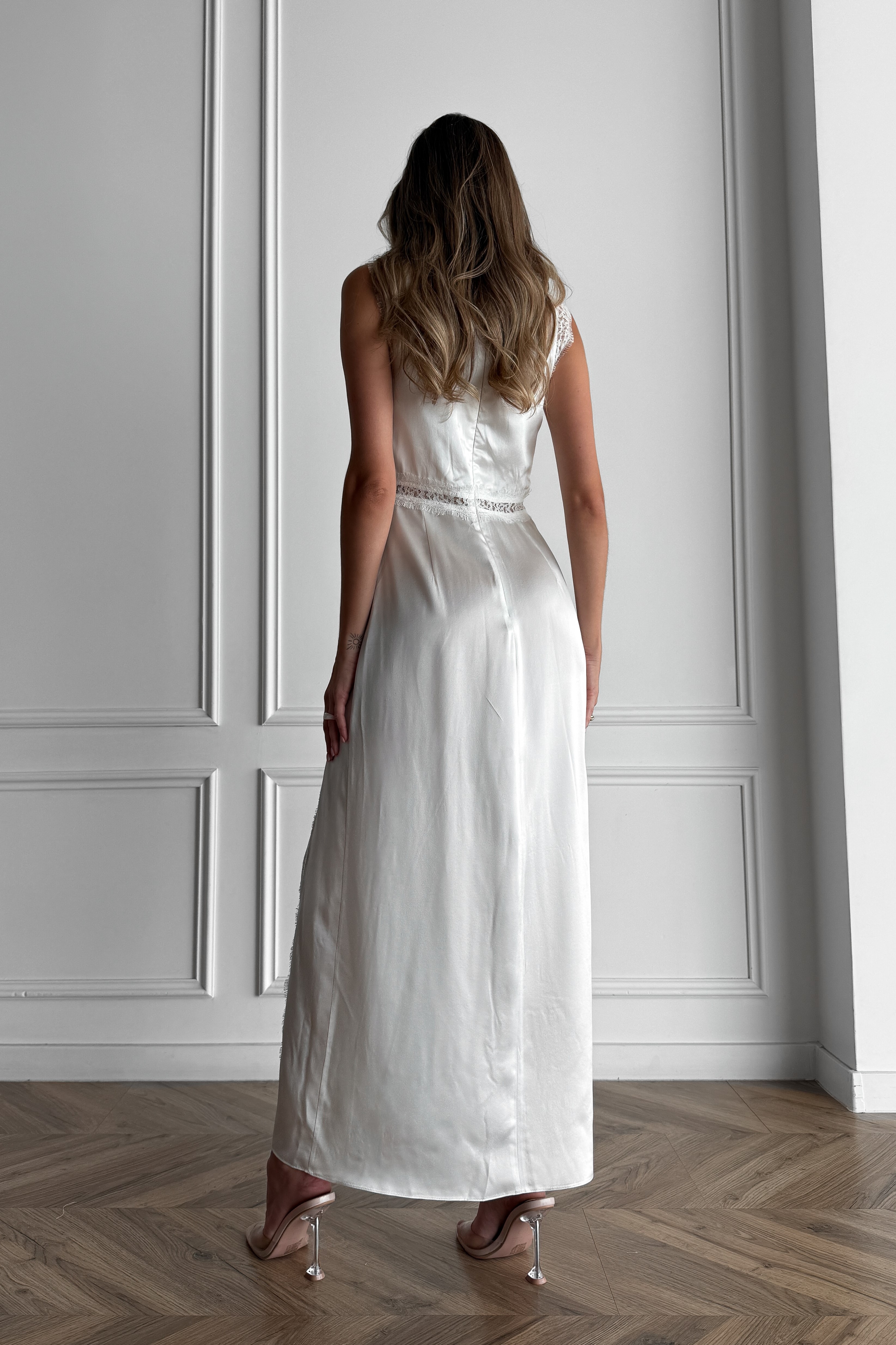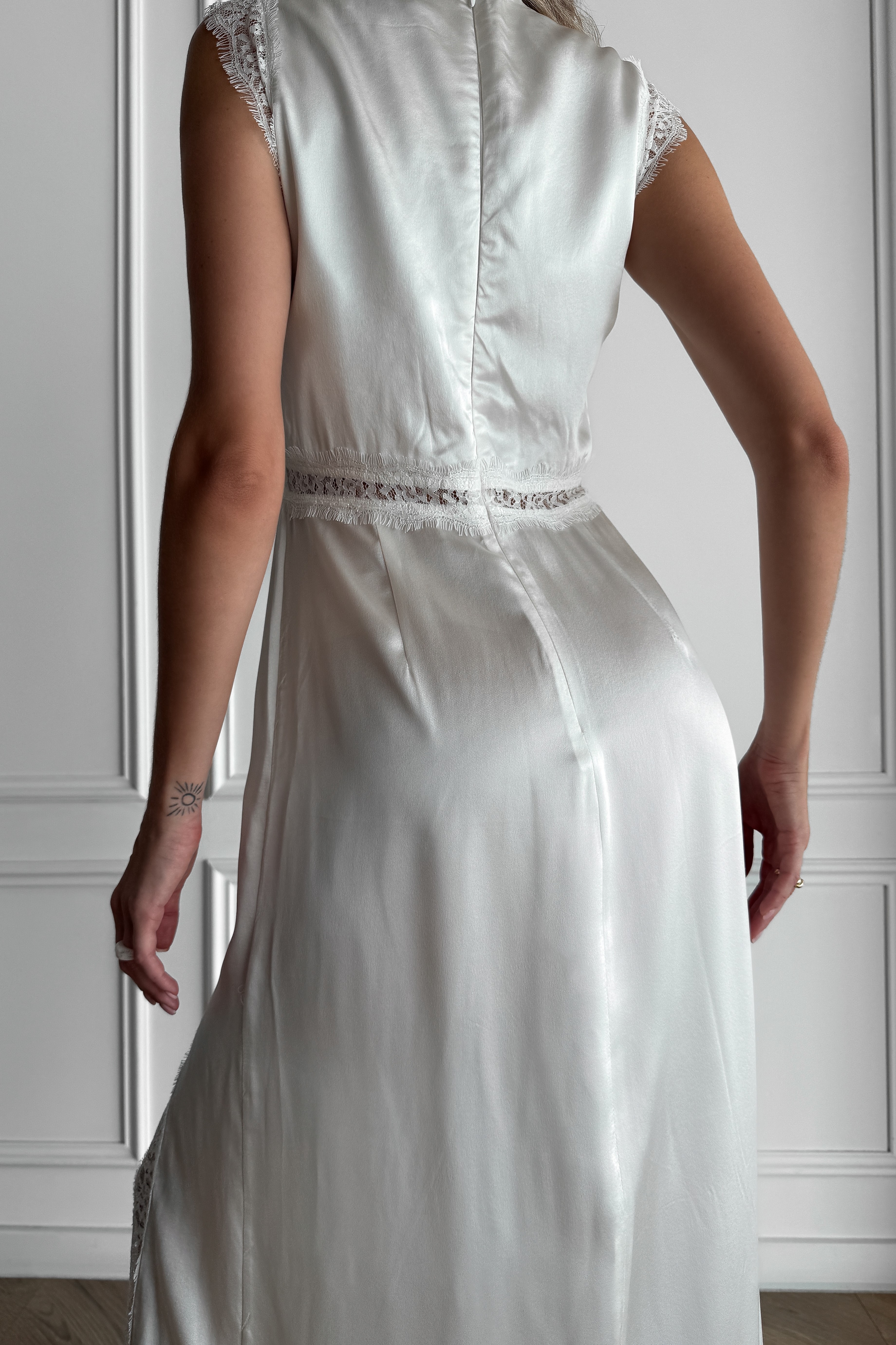 Long dress in lingerie style made of natural silk, with a slit on the leg, with lace