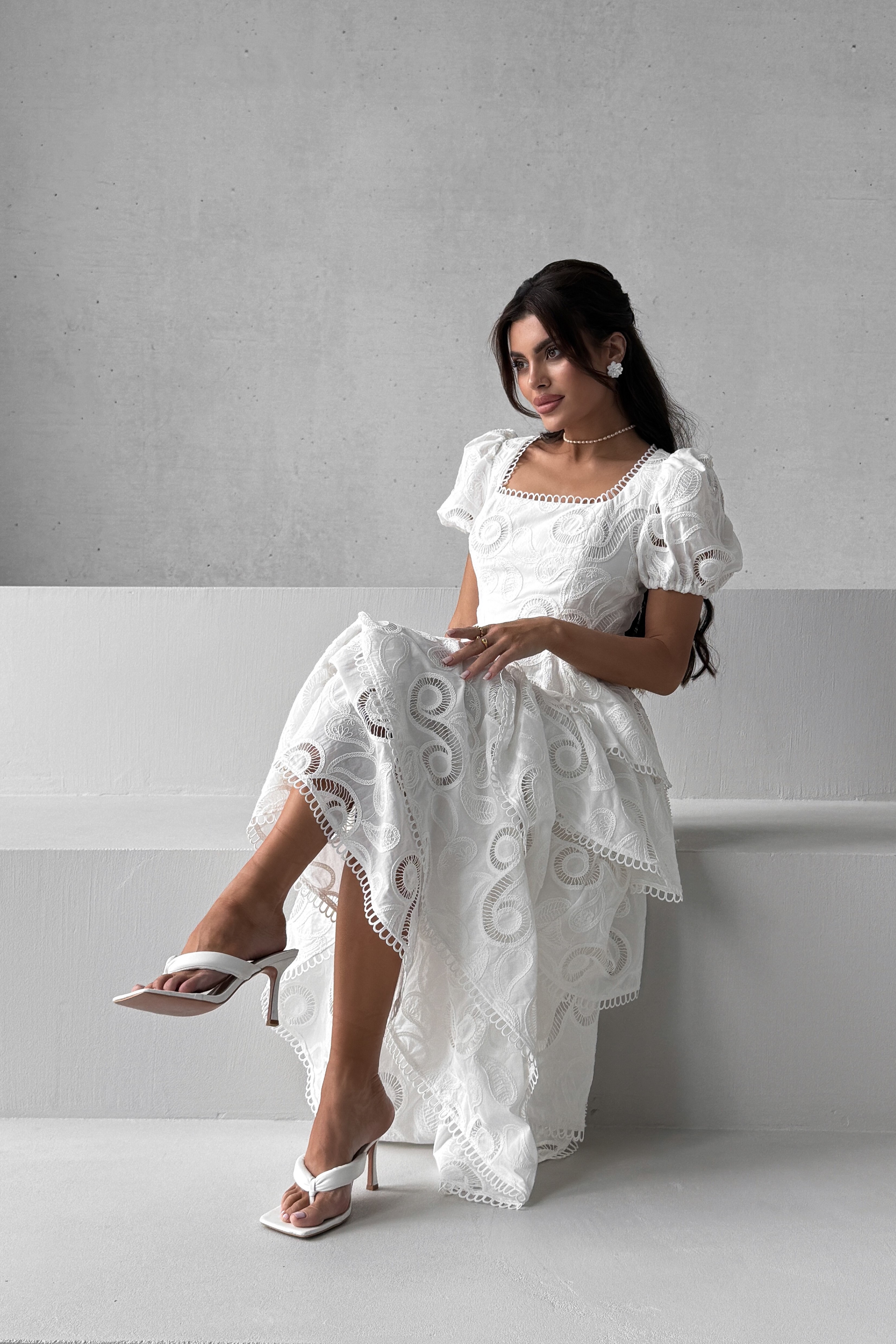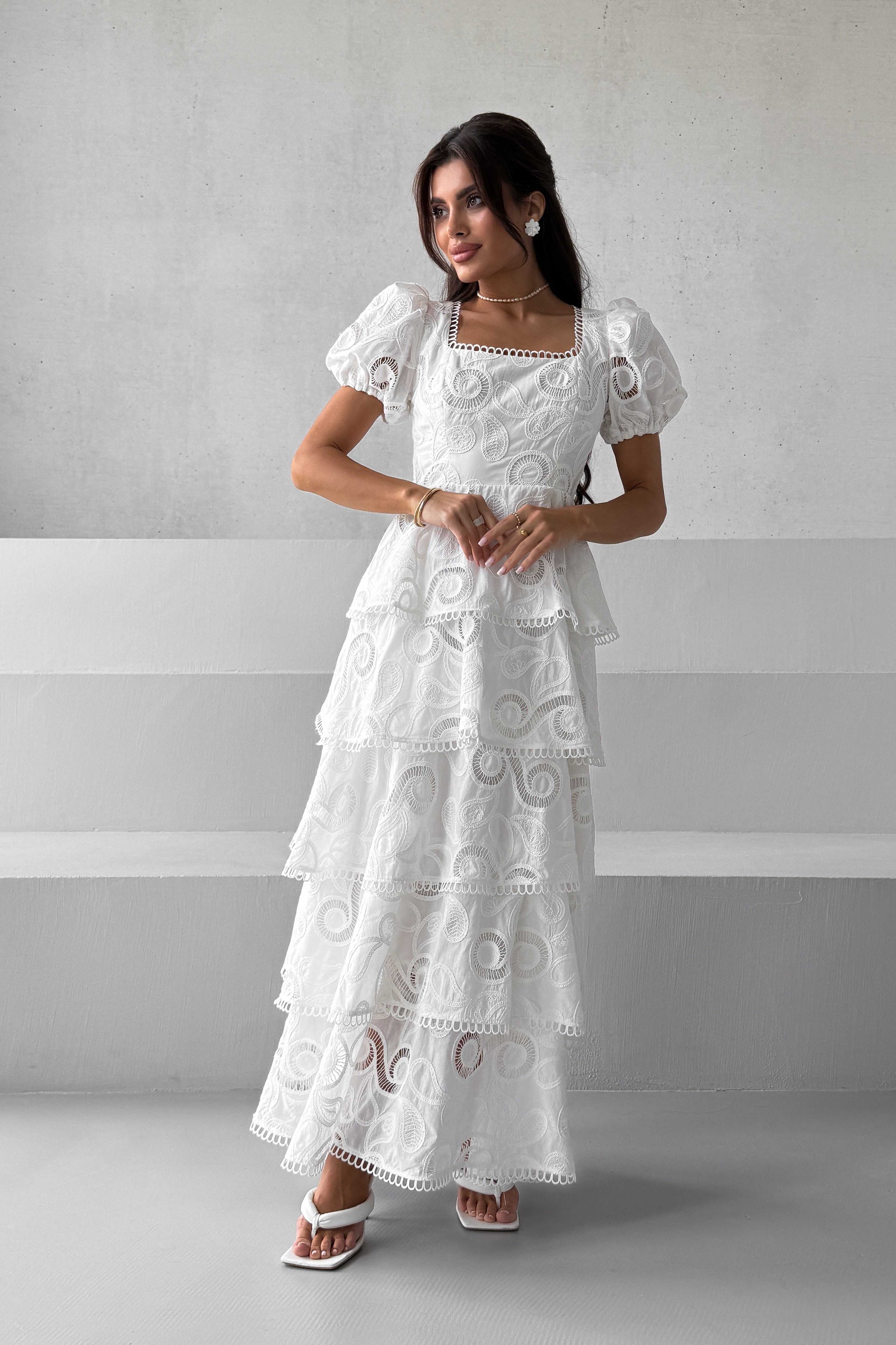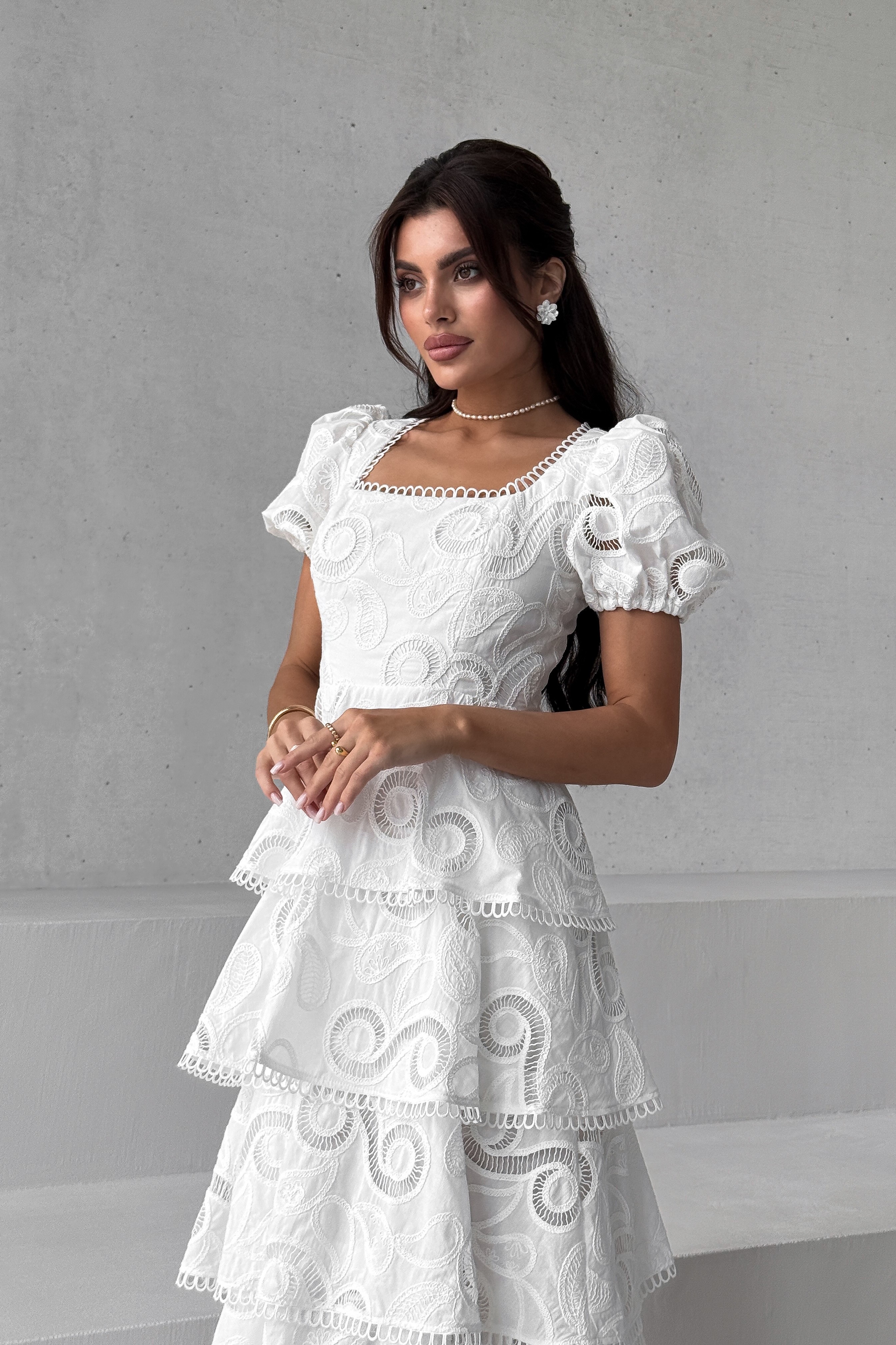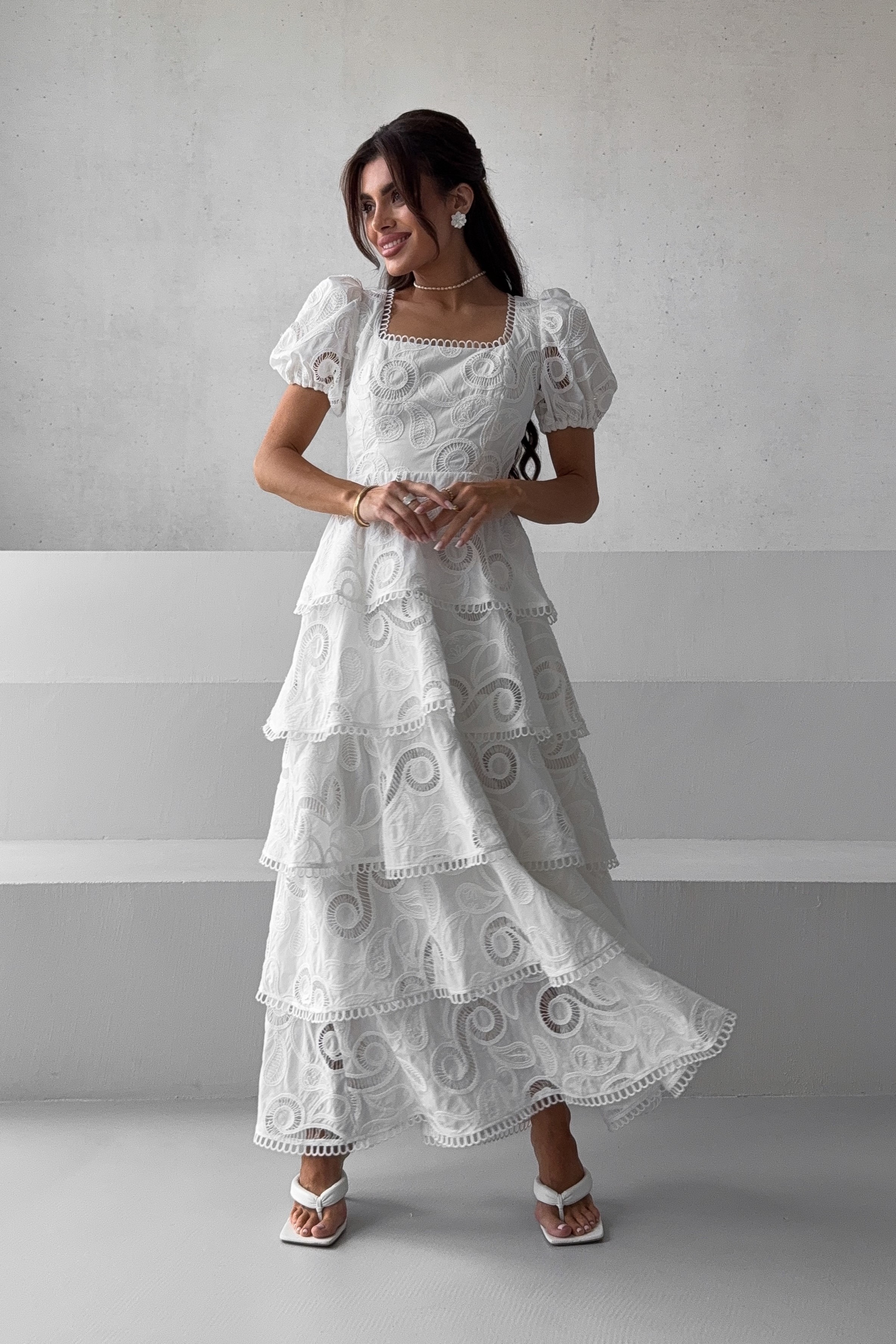 - With a square neckline, short puff sleeves, A-line skirt, tiers, ankle length