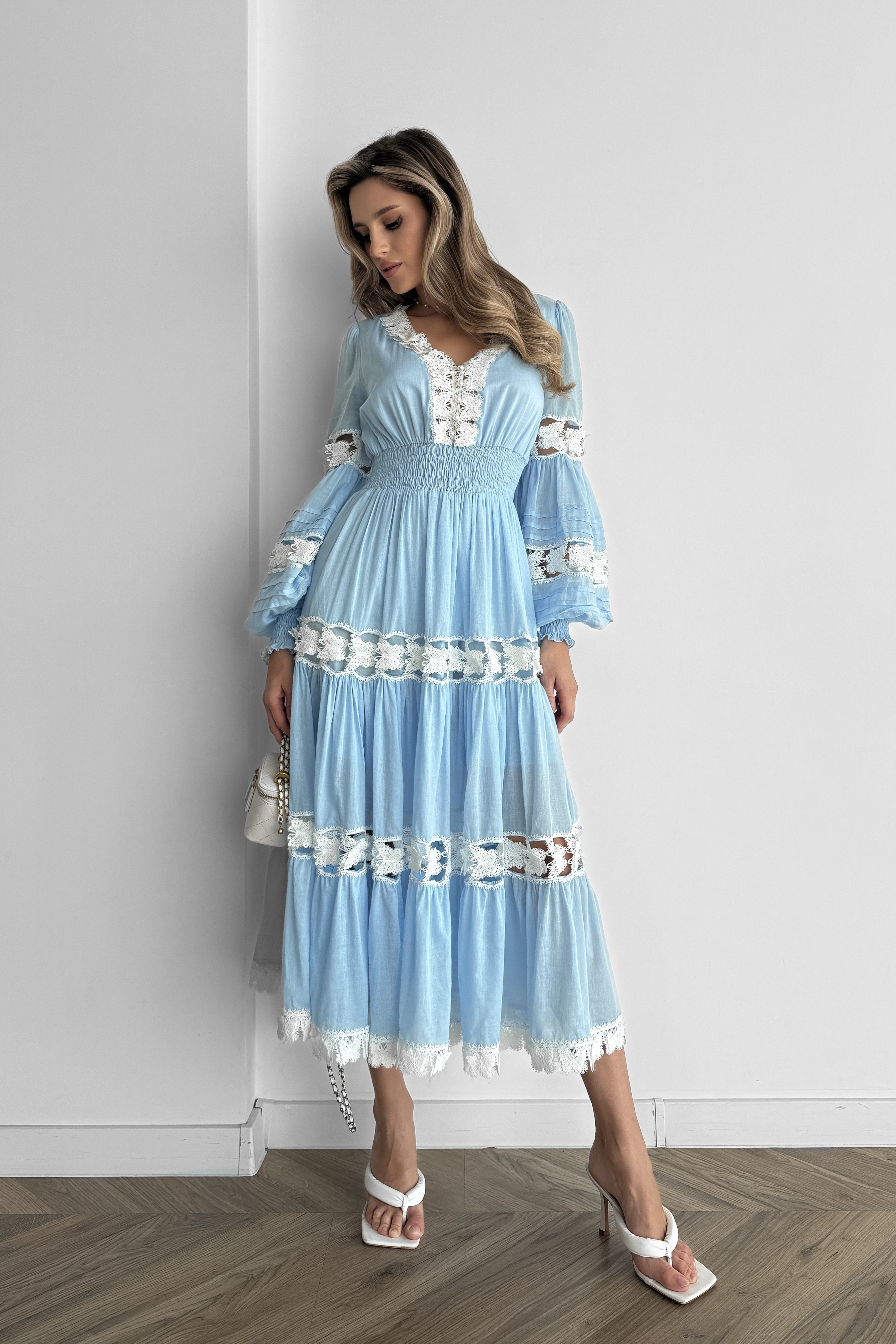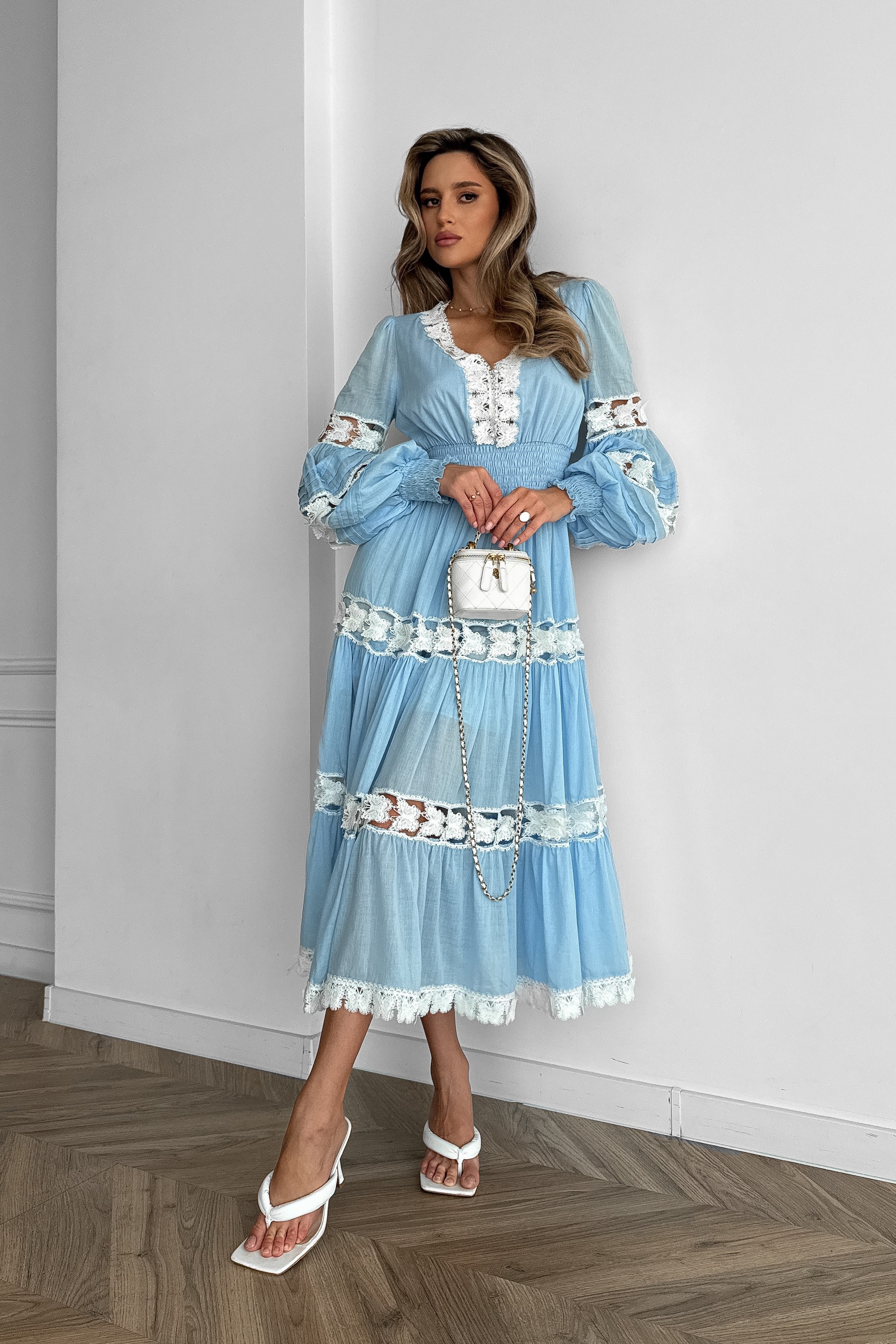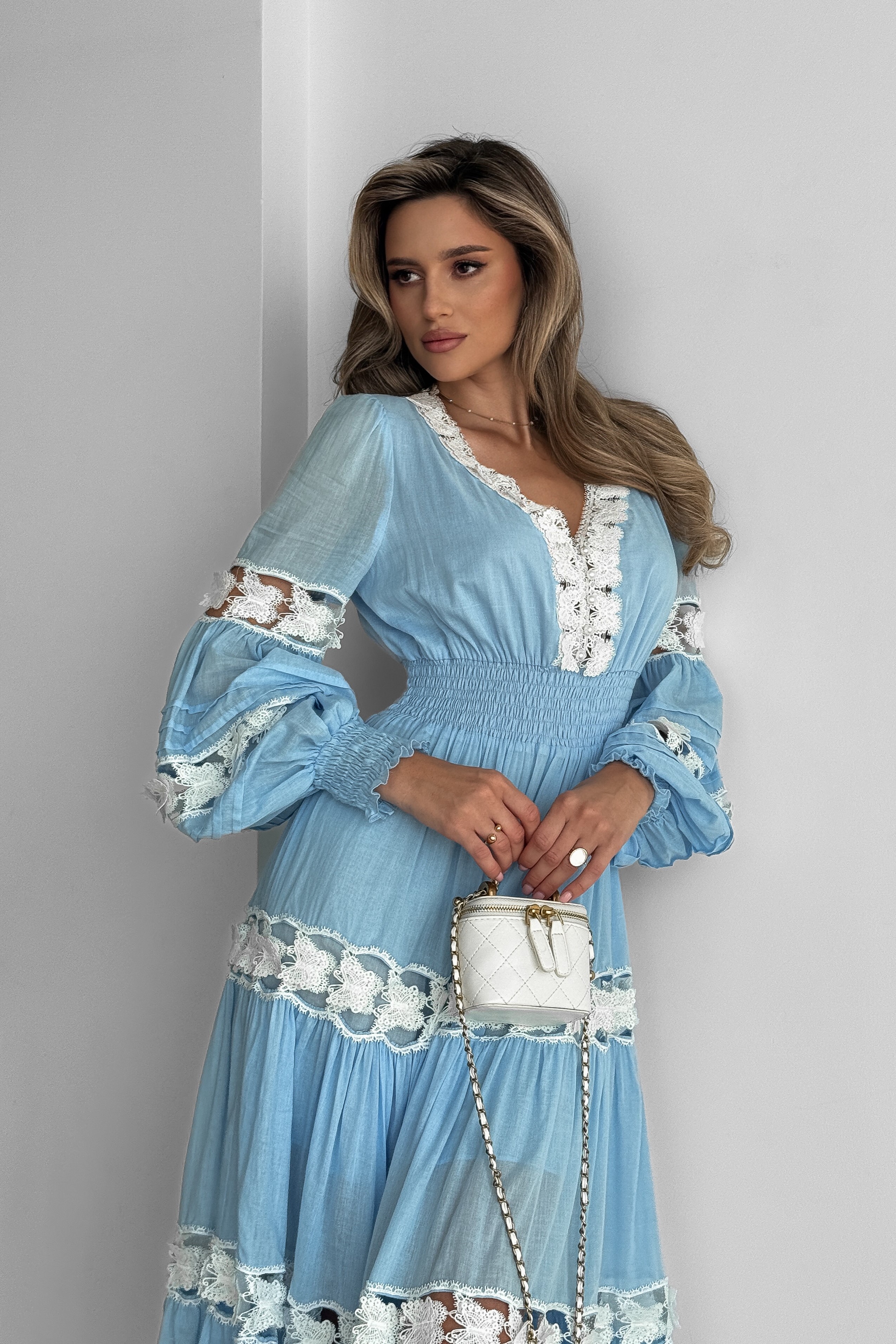 - With a sharp neckline, with a waistband and elastic cuffs, with long sleeves, with a full skirt