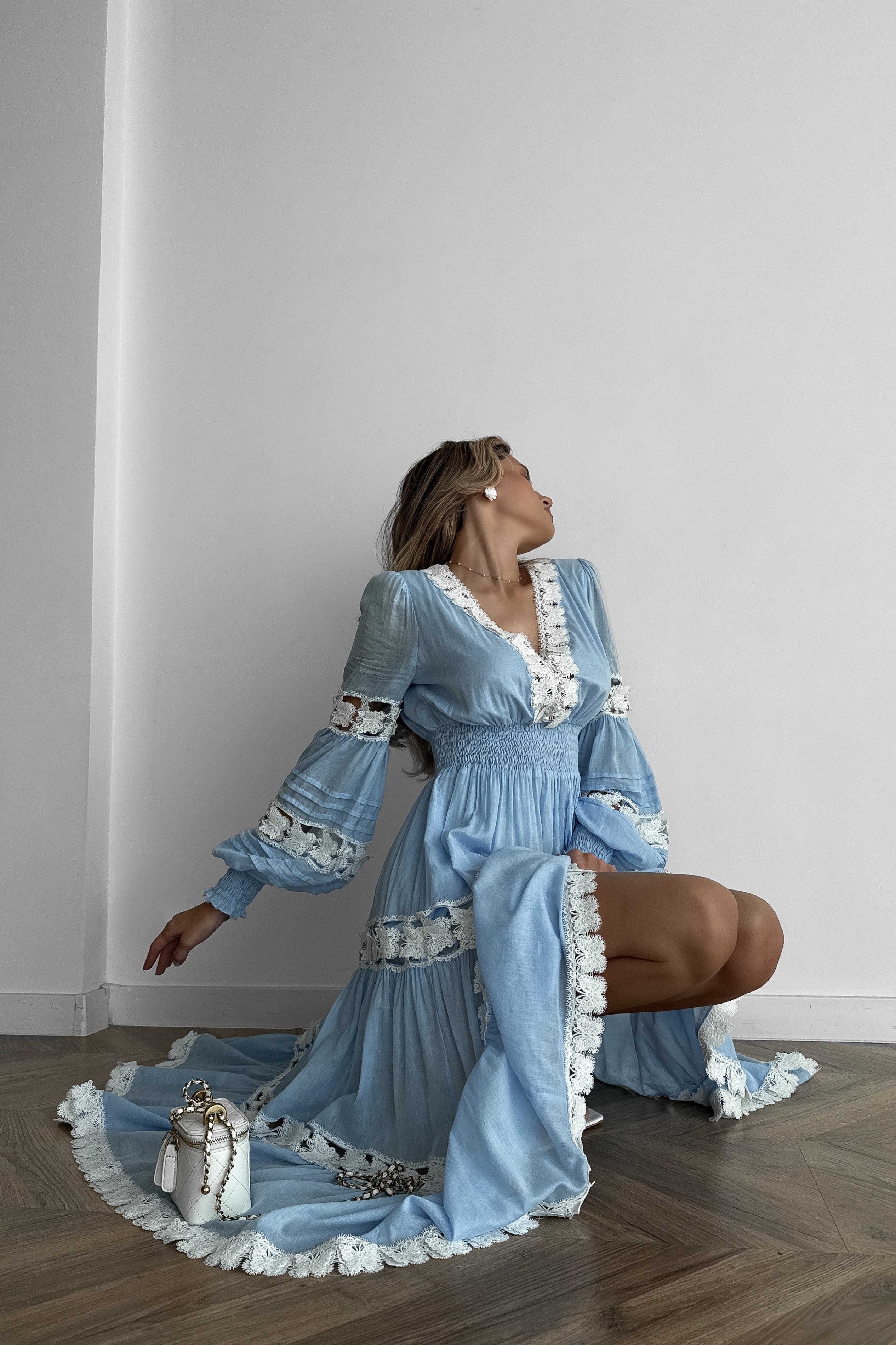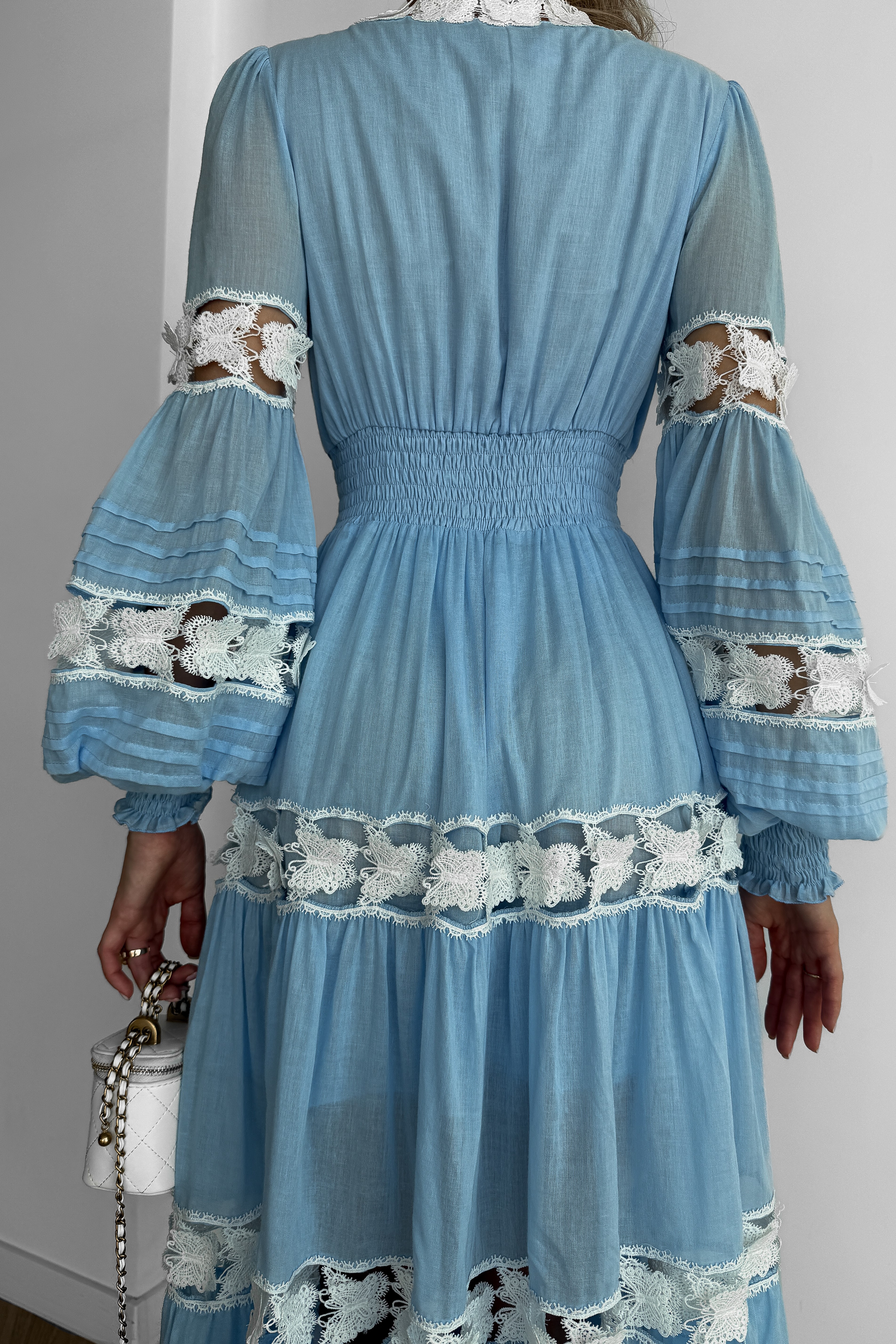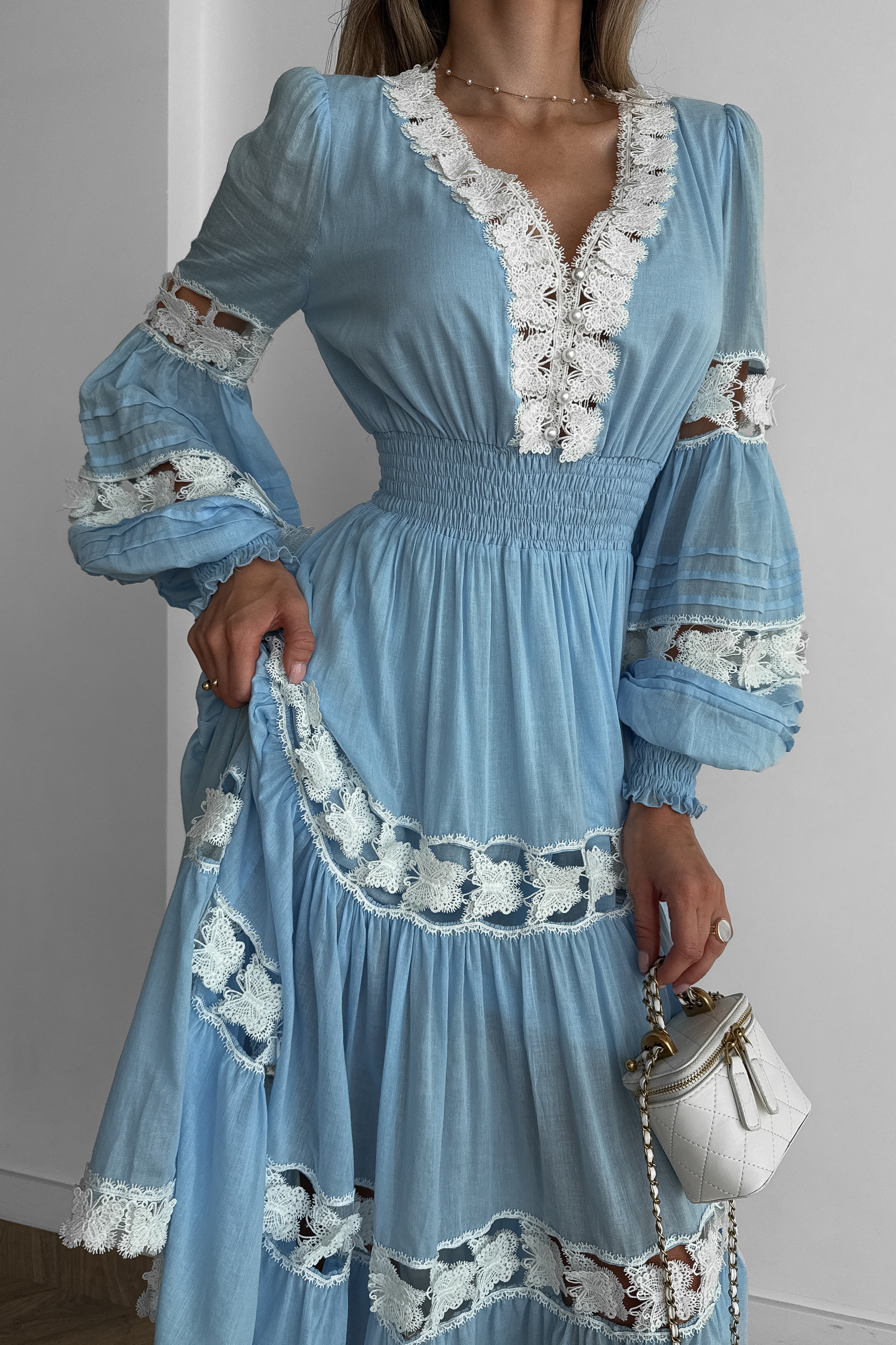 - With a sharp neckline, with a waistband and elastic cuffs, with long sleeves, with a full skirt