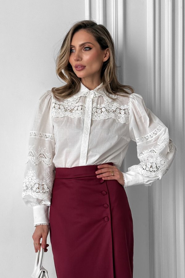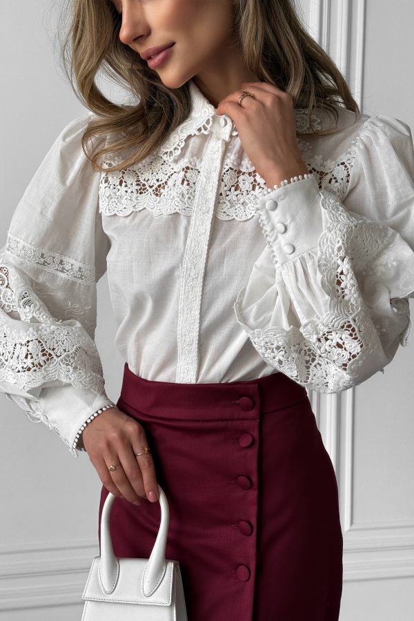 7 500 грн SKU: 1078Хлопковая белая блуза с кружевом и кружевным воротником, с коричневыми пуговицами Блуза свободного силуэта С кружевным воротником и манжетами, с длинными широкими рукавами, с кружевными вставками С застежкой спереди на пуговицы Состав ткани: 100% хлопок Цвет: теплый белый Длина блузы: 62-65 см Длина рукава: 64-65 см -