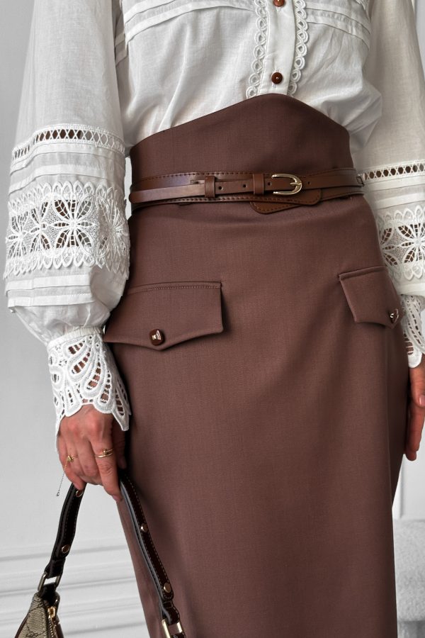 7 500 грн SKU: 1077Юбка карандаш с фигурным поясом и клапанами, из итальянской костюмной ткани Юбка прилегающего силуэта С высокой талией, с декоративными клапанами, с фигурным поясом С потайной молнией и шлицей на спинке Состав ткани: 97% шерсть, 3% эластан Состав подкладки: 100% вискоза Цвет: шоколадный Длина юбки: 68-70 см