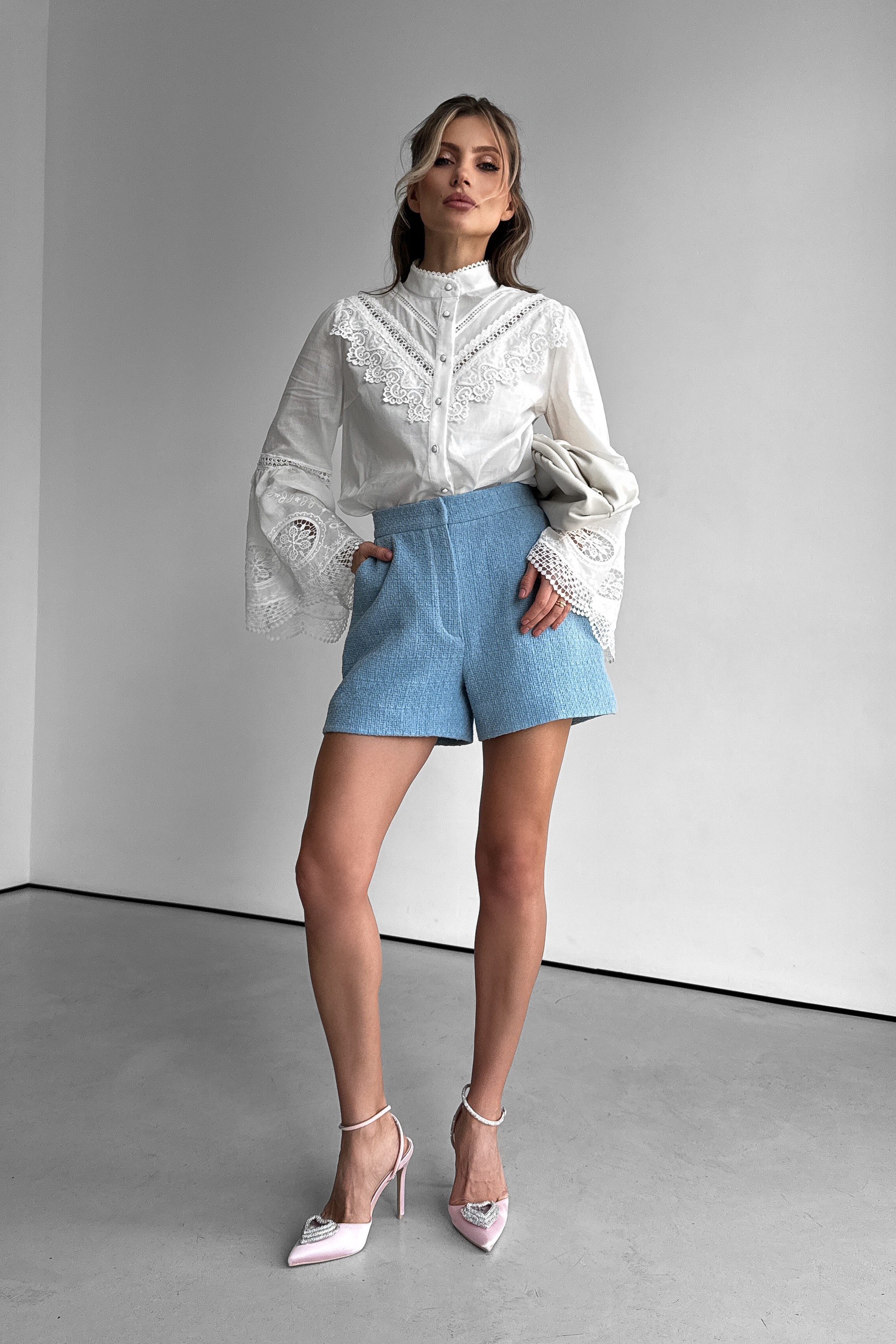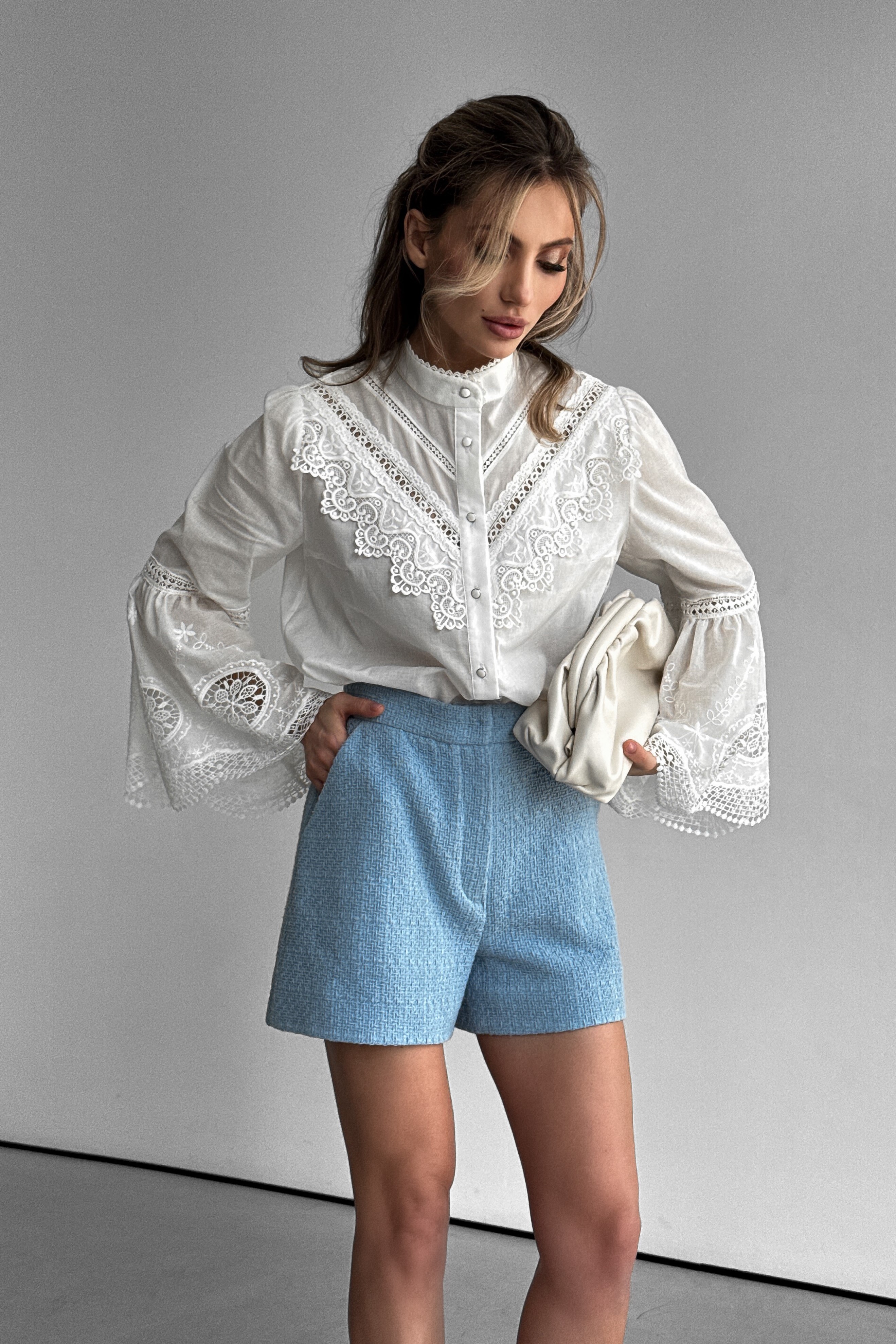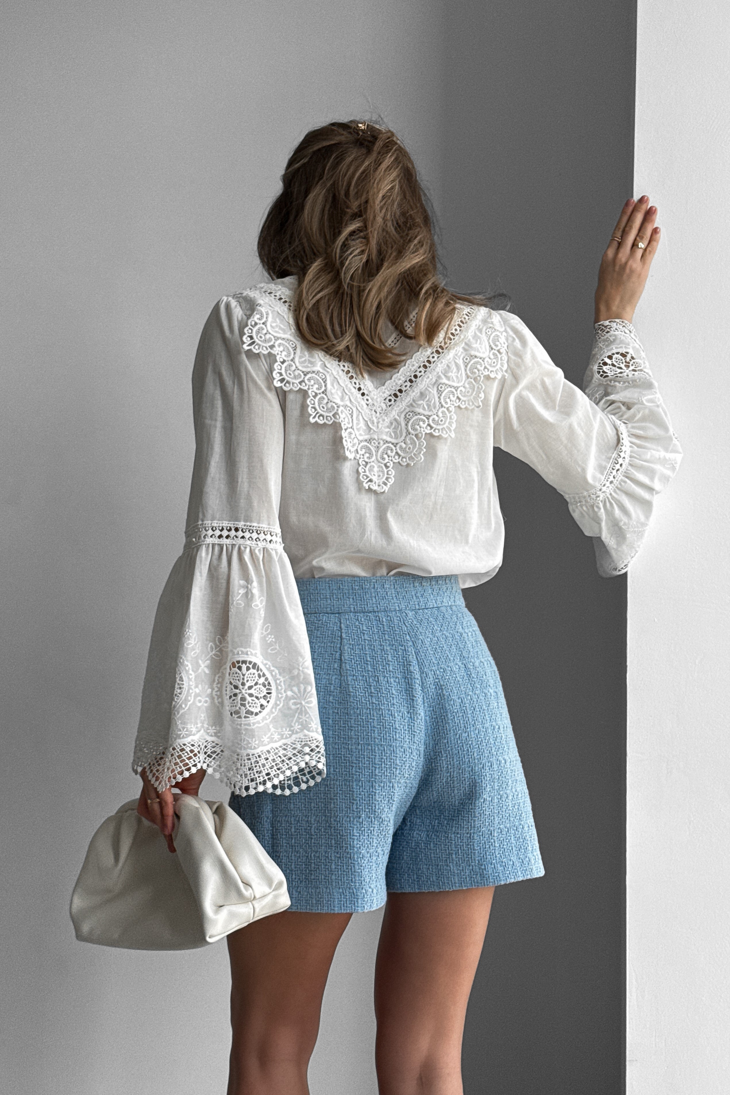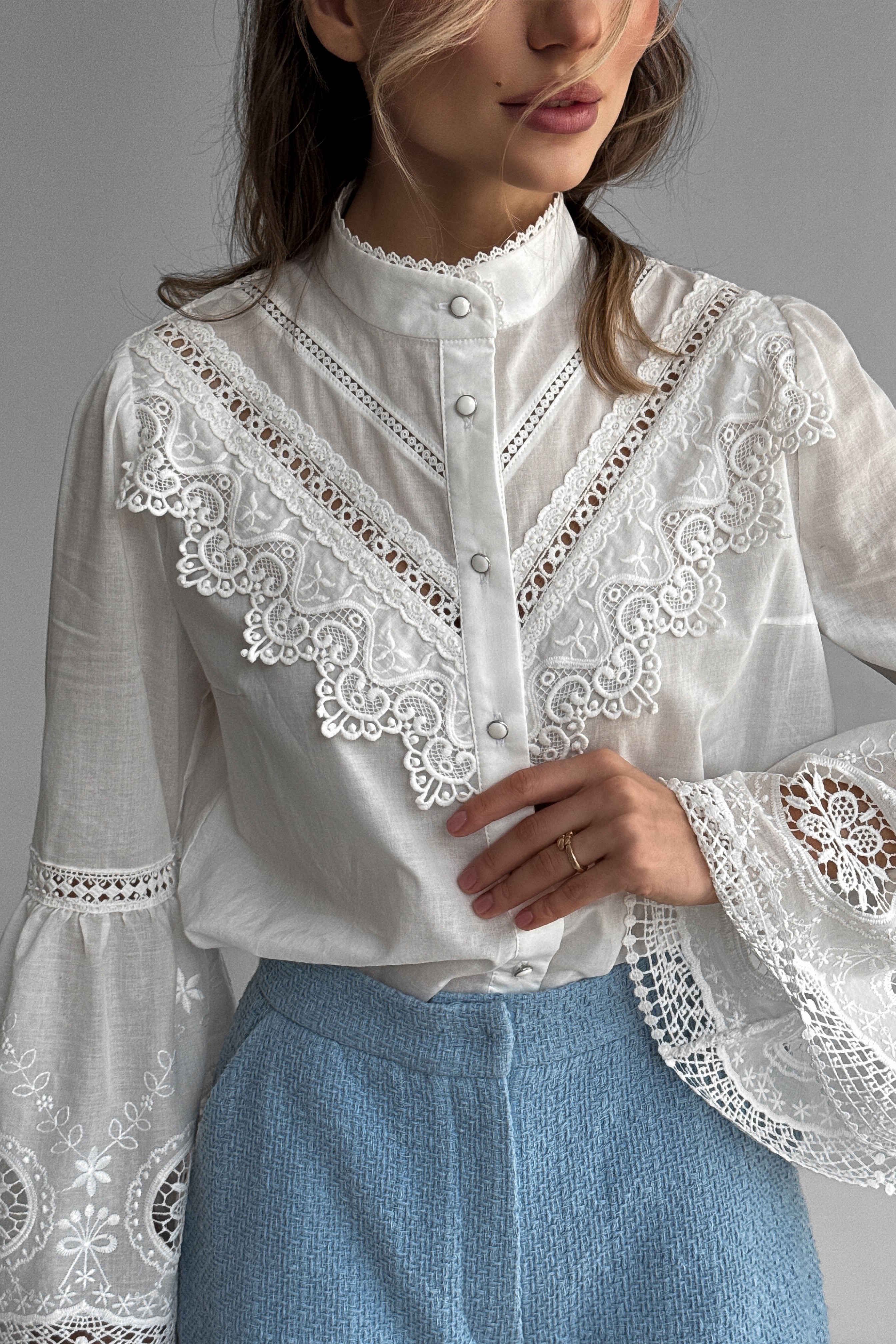 Хлопковая белая блуза с расклешенными рукавами, с вышивкой и кружевом