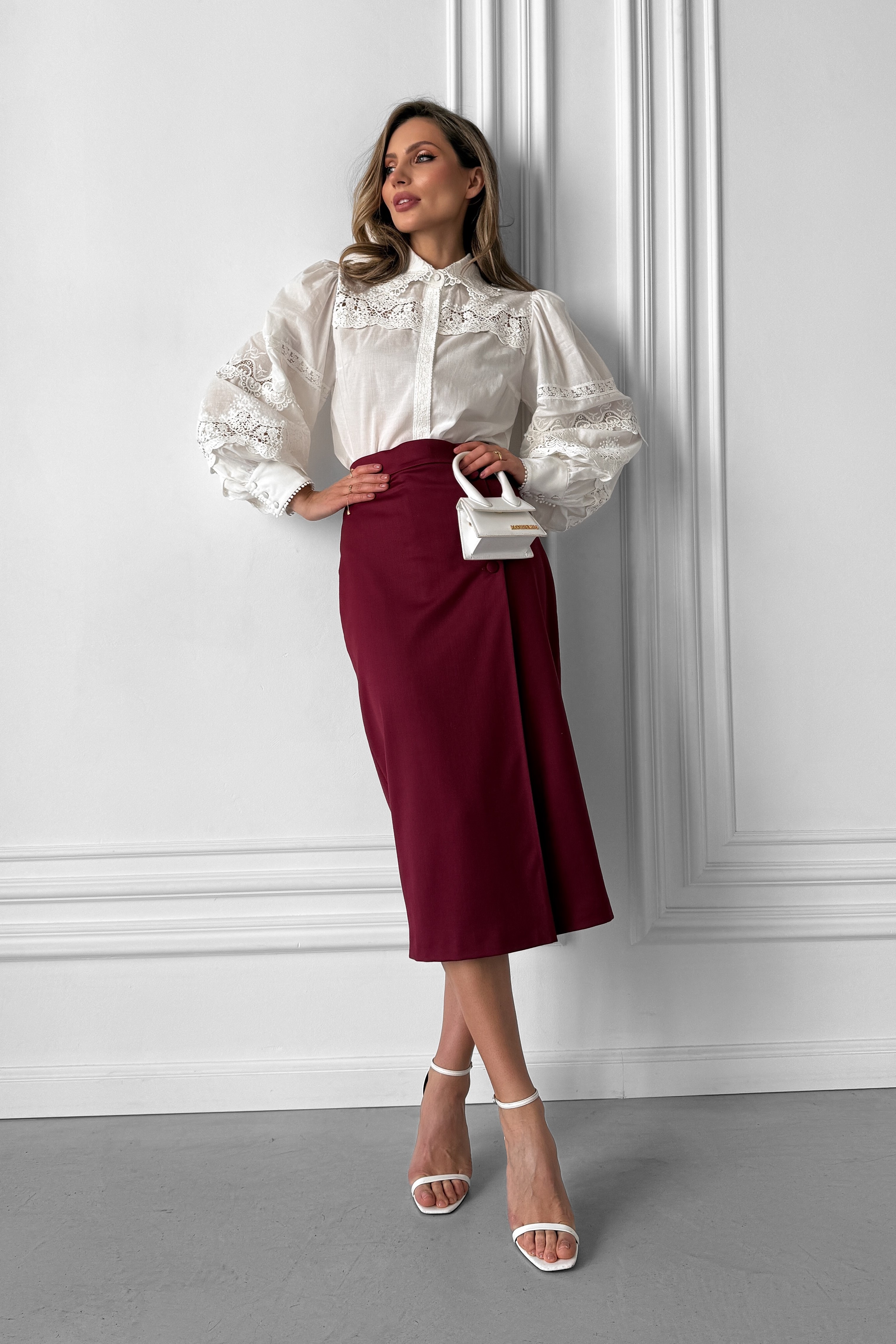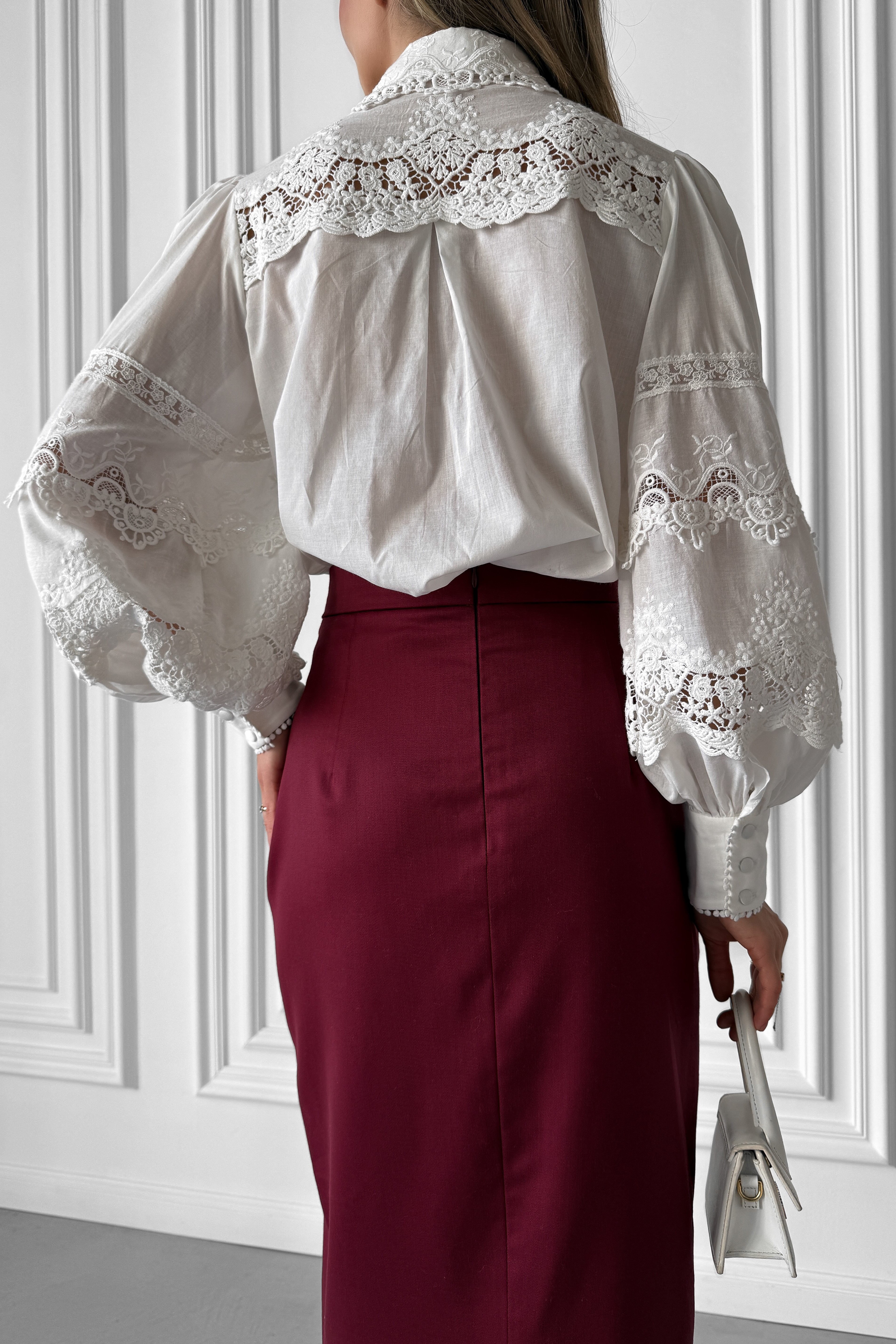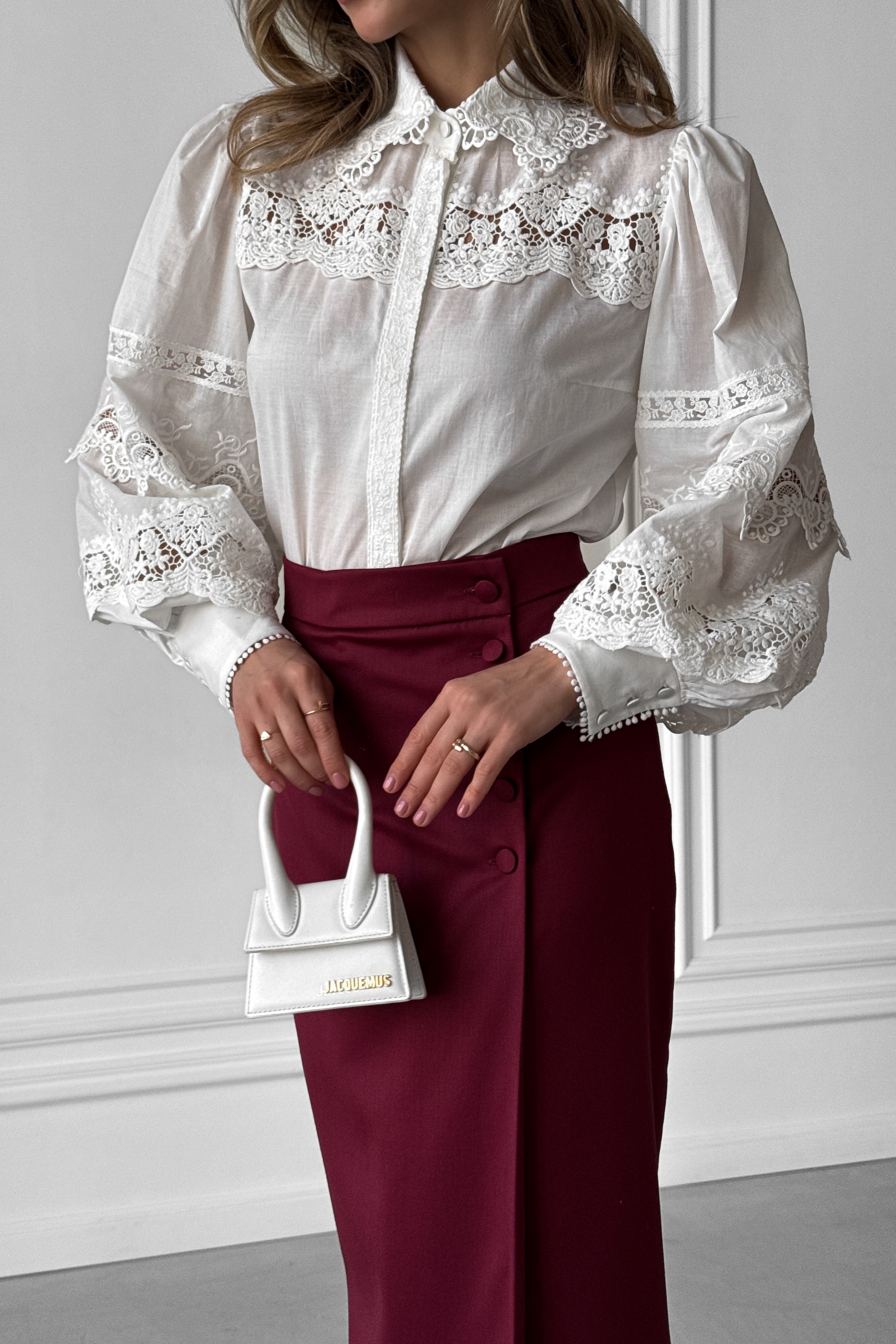 Хлопковая белая блуза с вышивкой, объемными рукавами и потайной застежкой