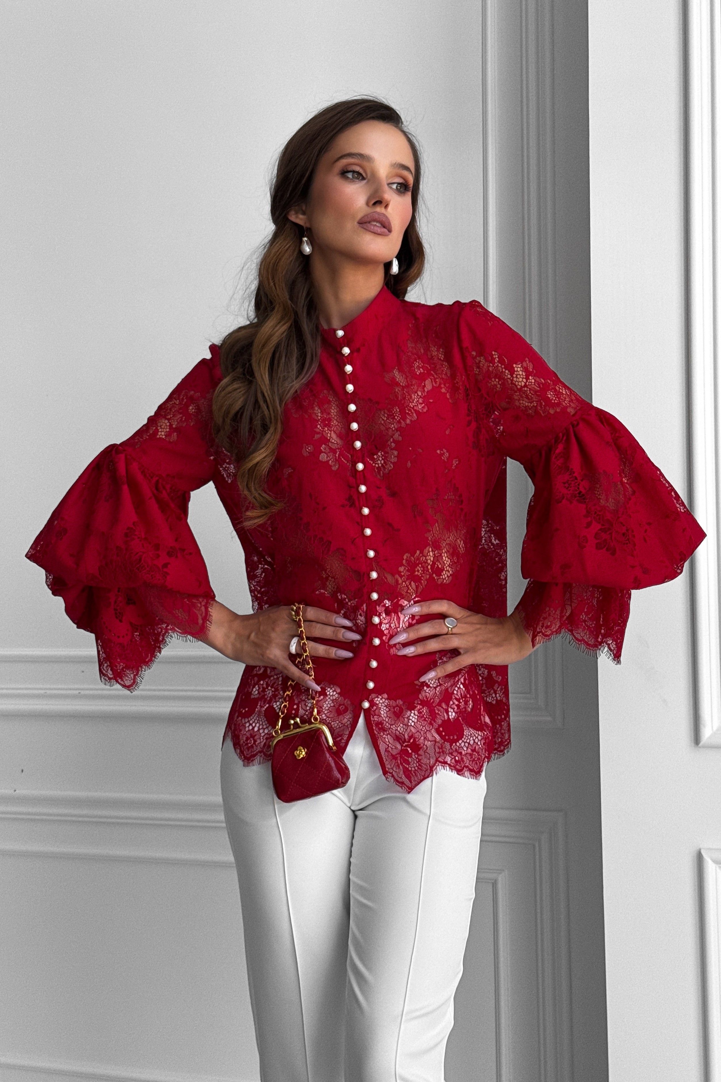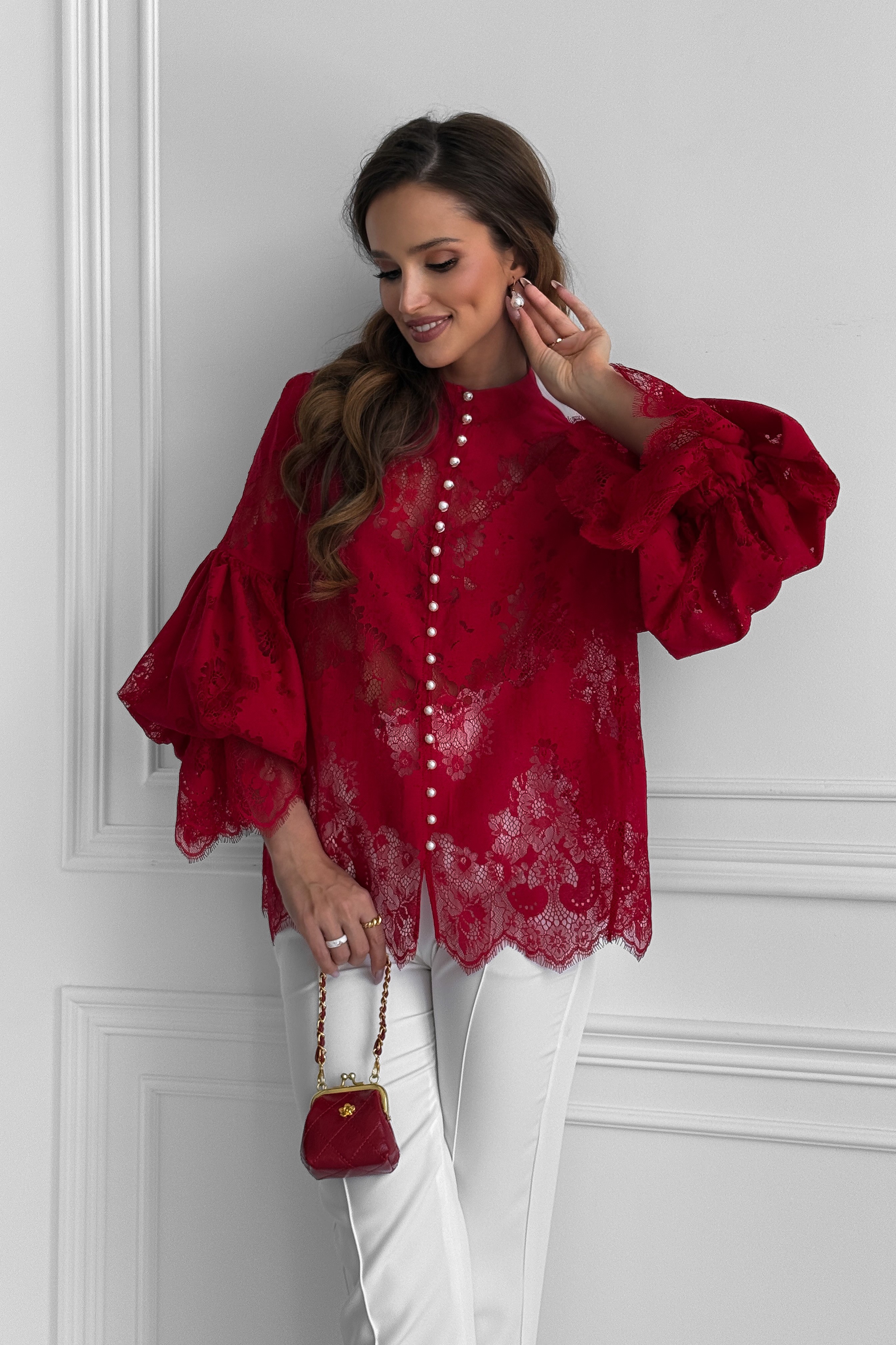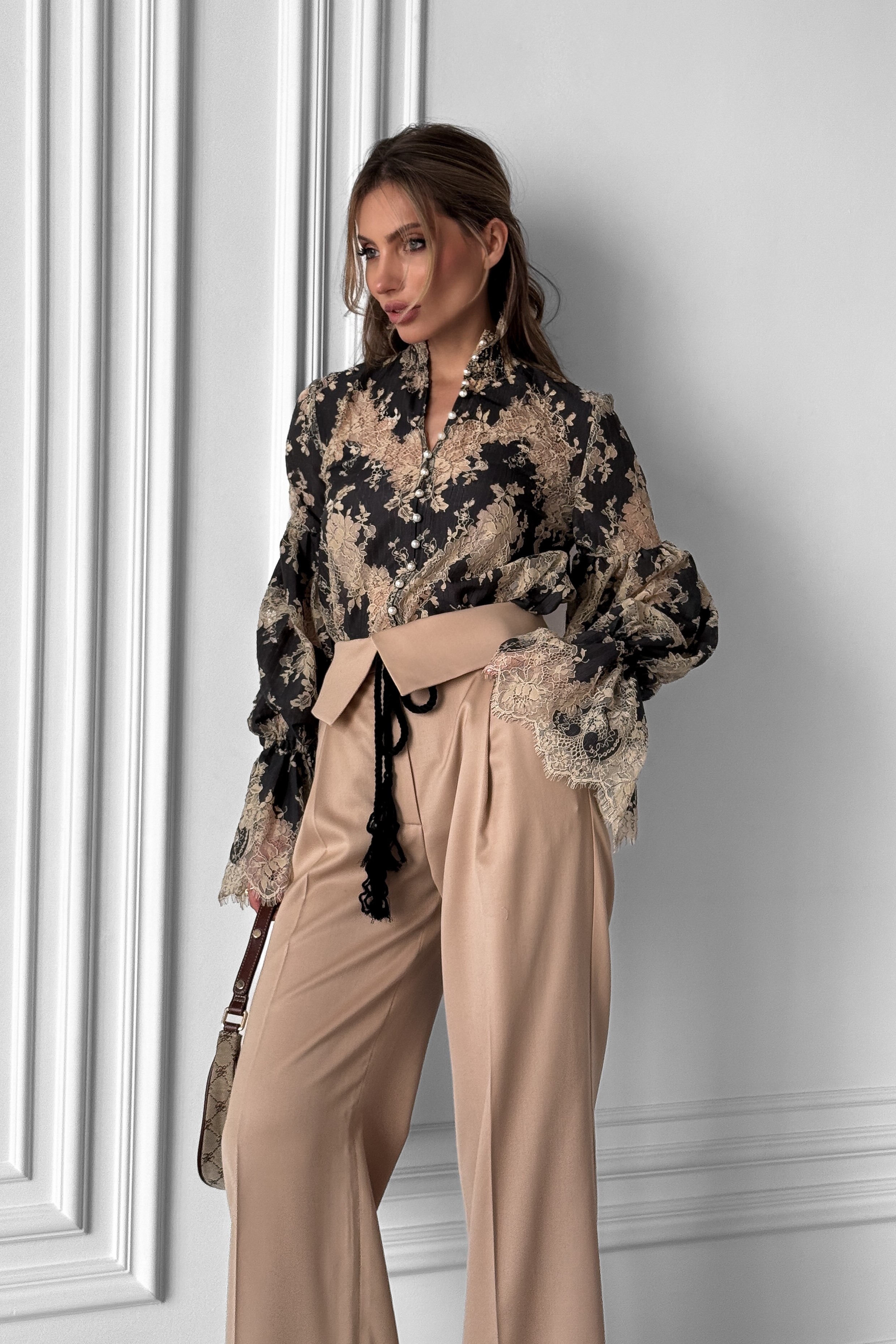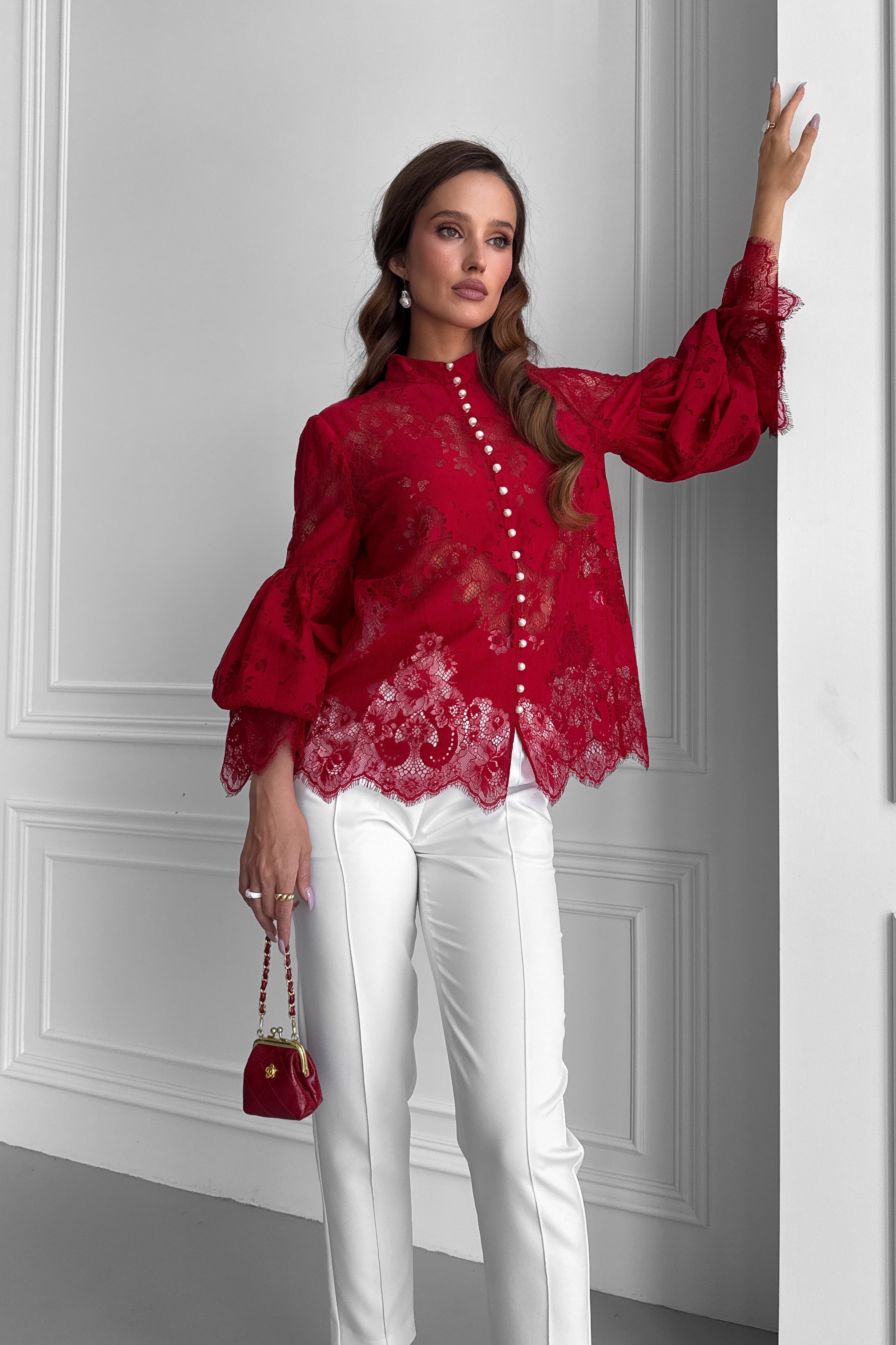 Кружевная блуза зигзаг с пышными рукавами, с жемчугом, с воротником стойкой