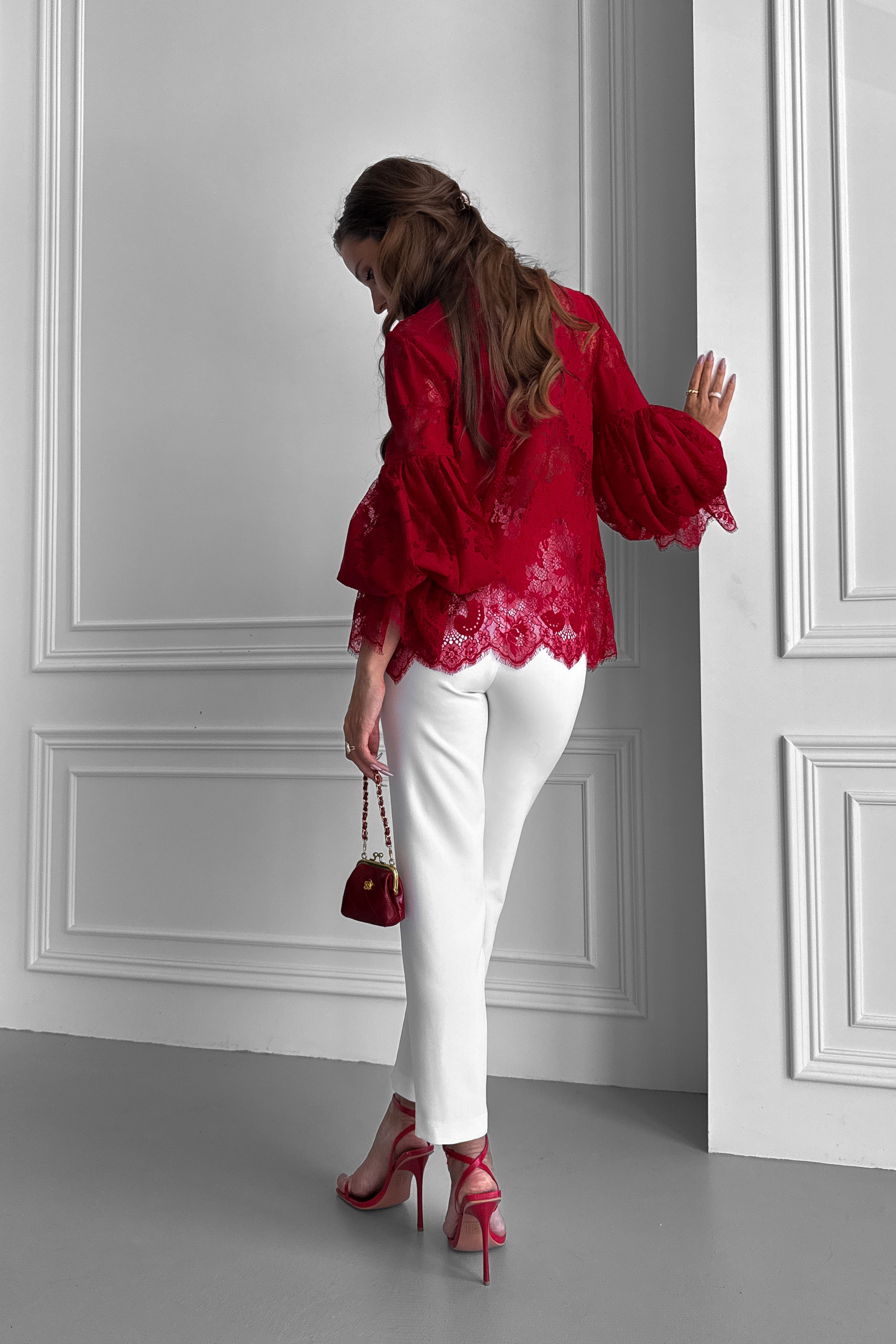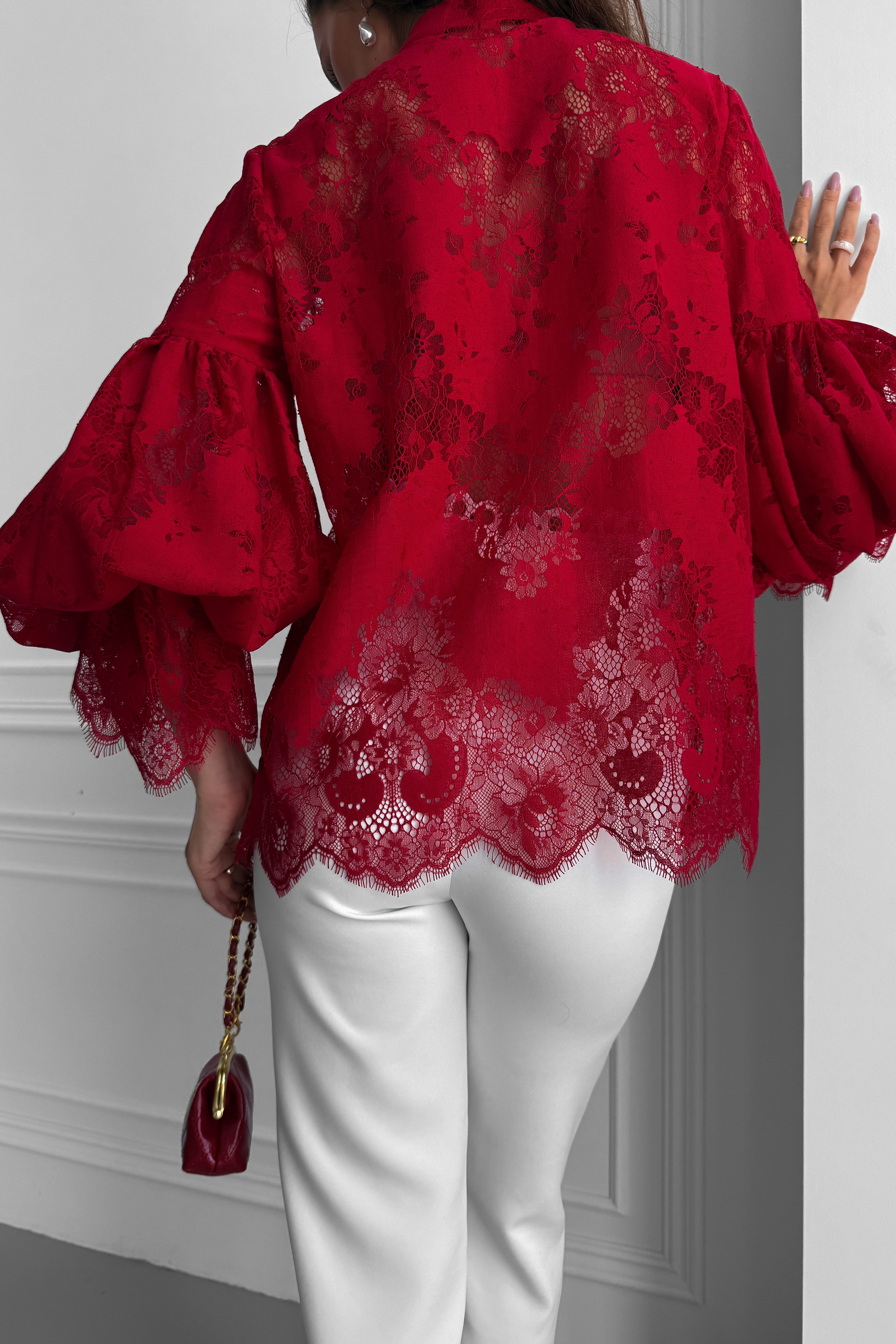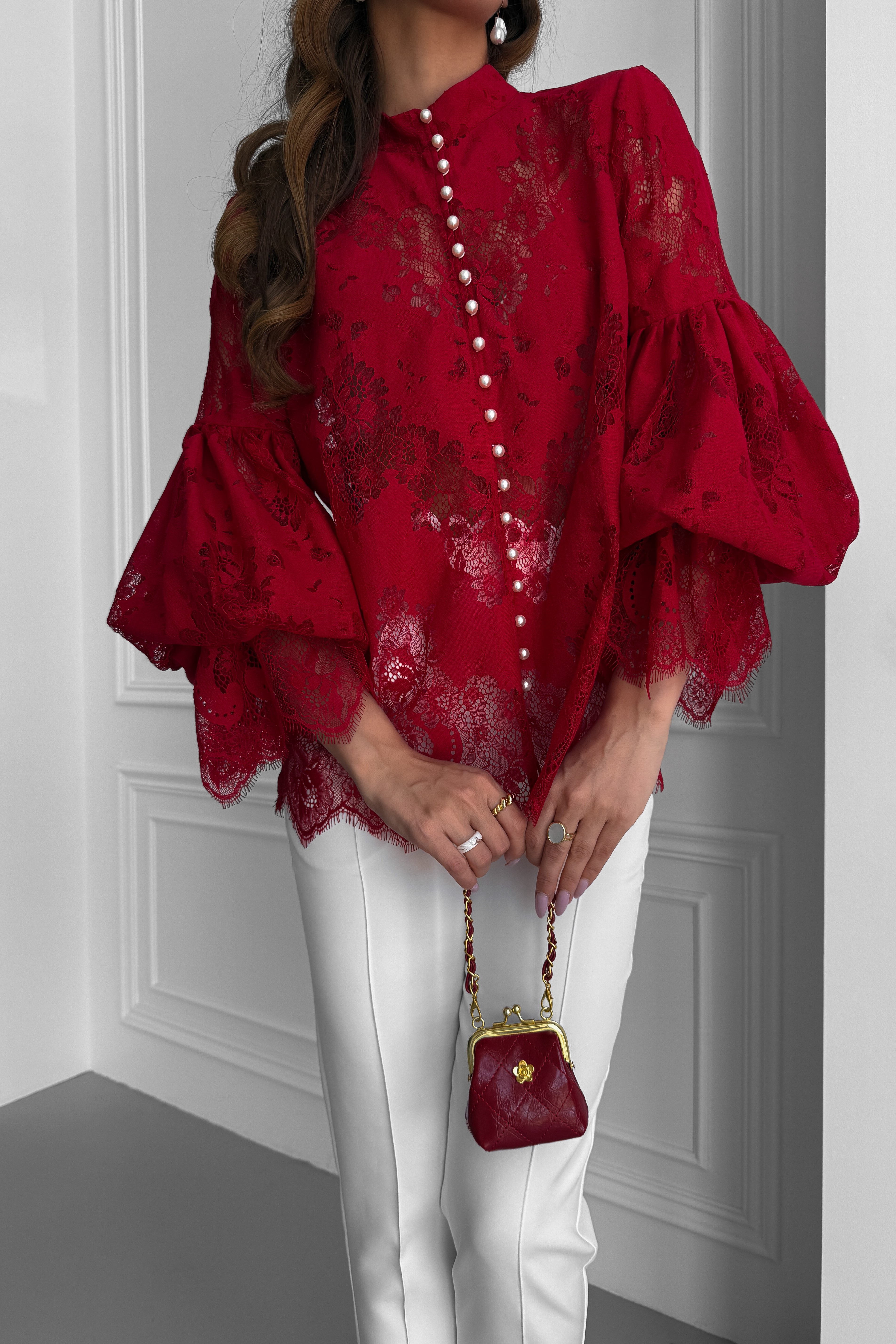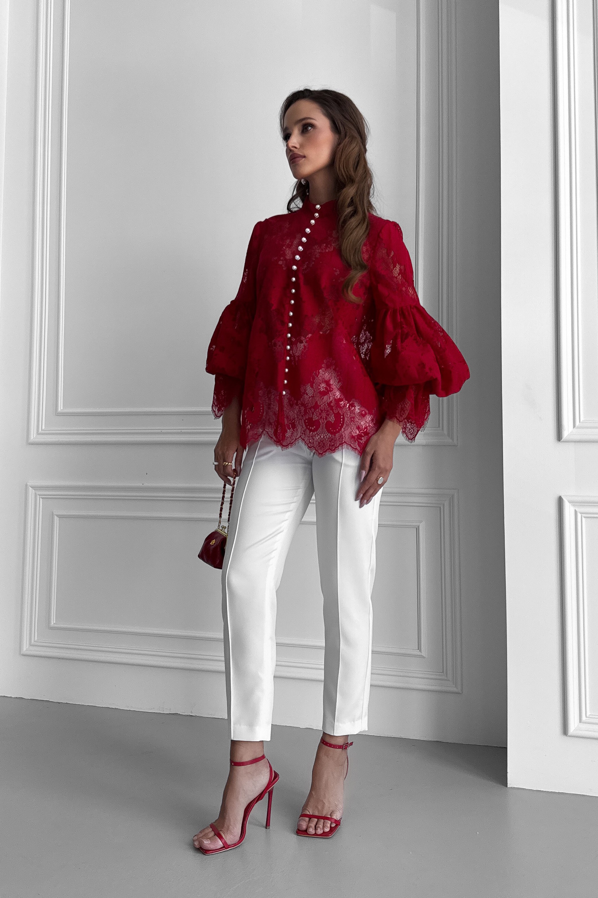 Кружевная блуза зигзаг с пышными рукавами, с жемчугом, с воротником стойкой
