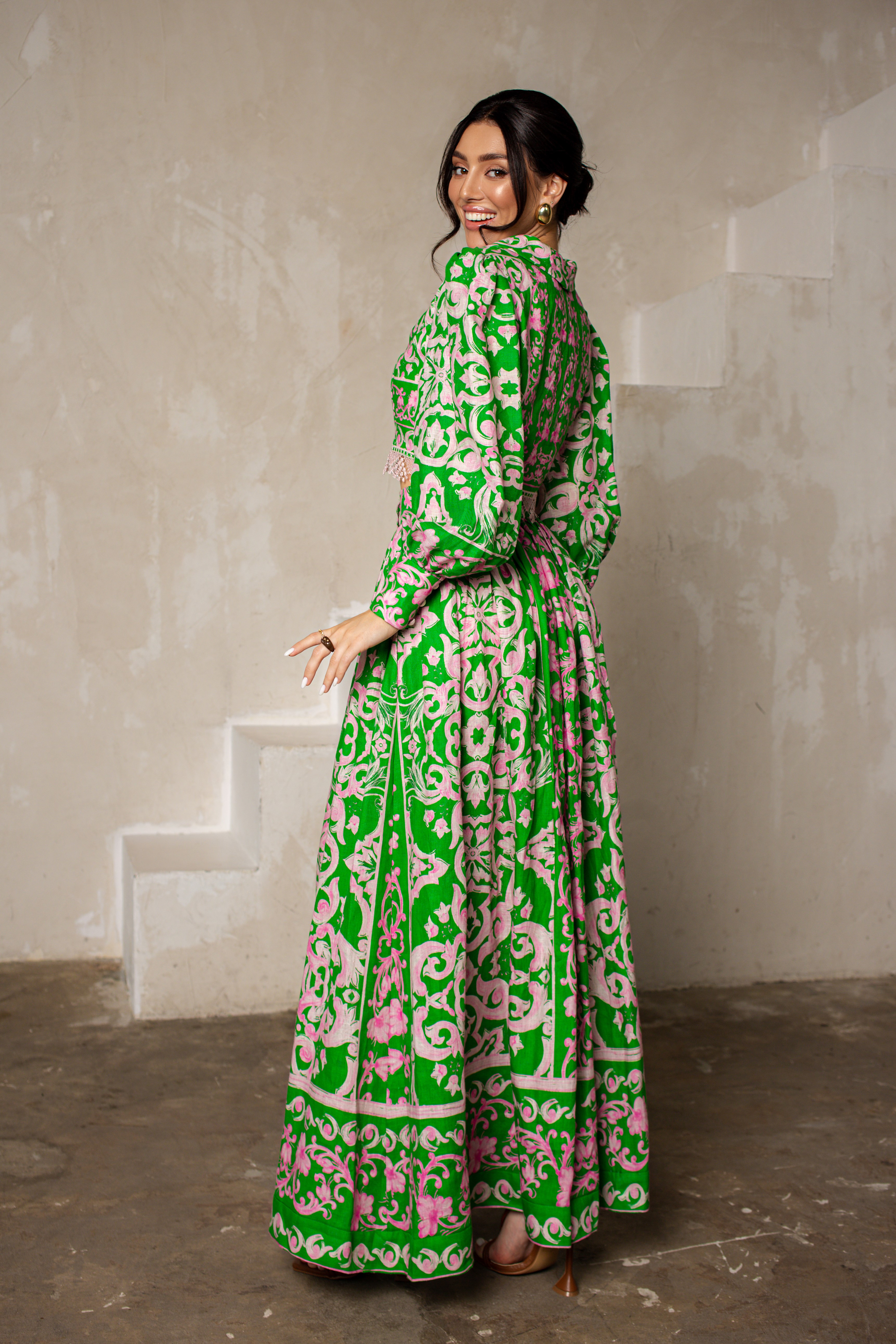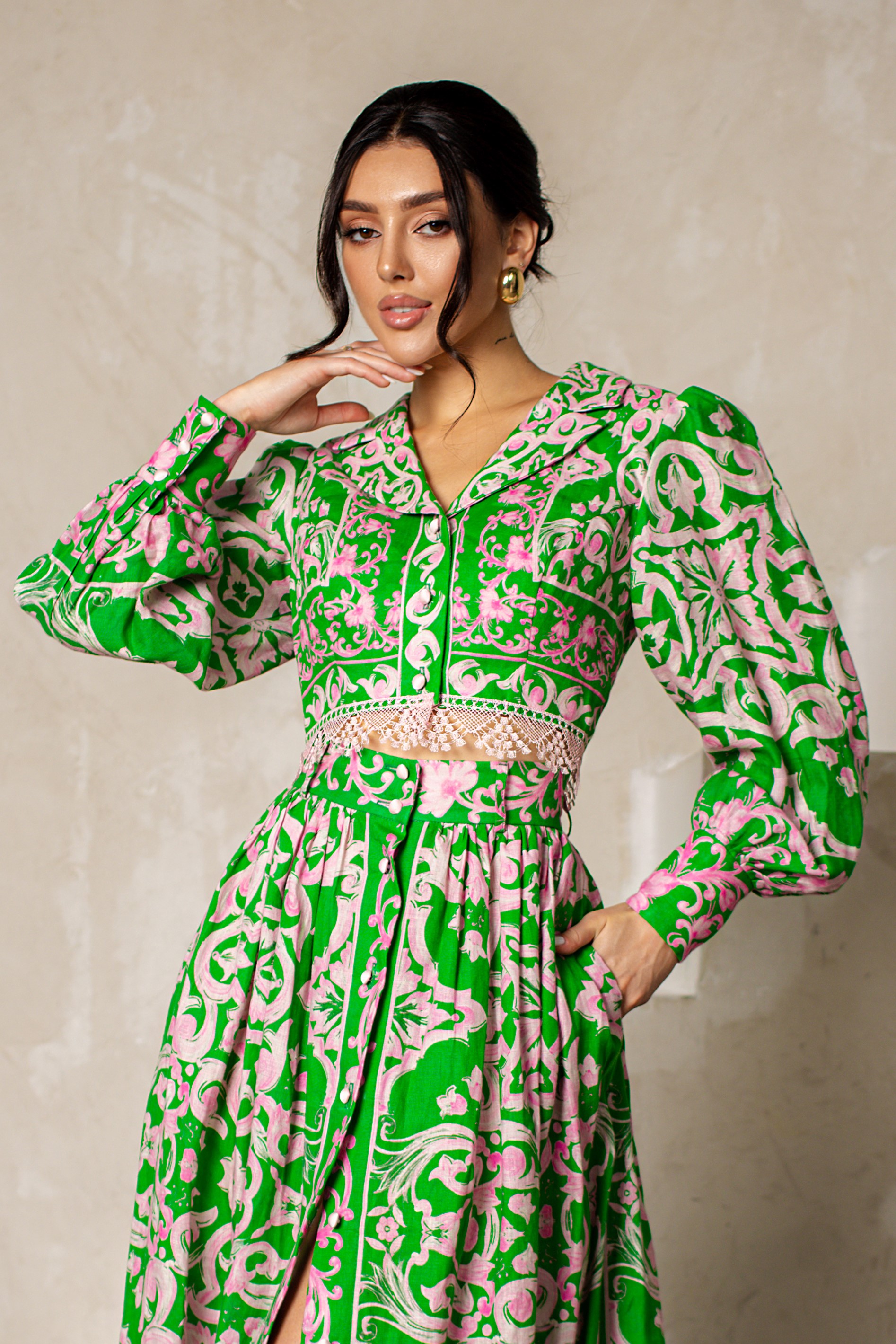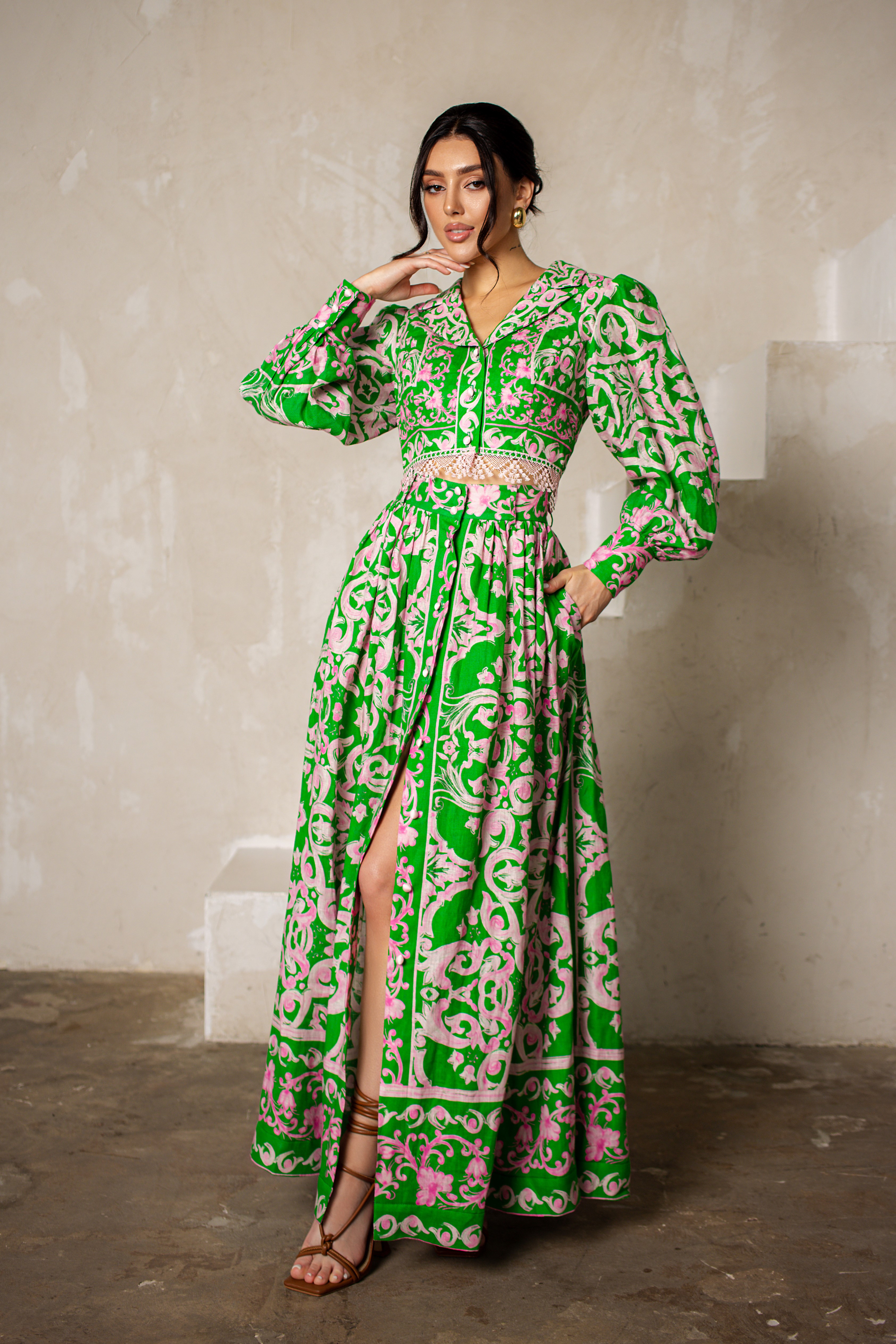 Костюм двойка: топ и длинная юбка, из итальянского льна с принтом