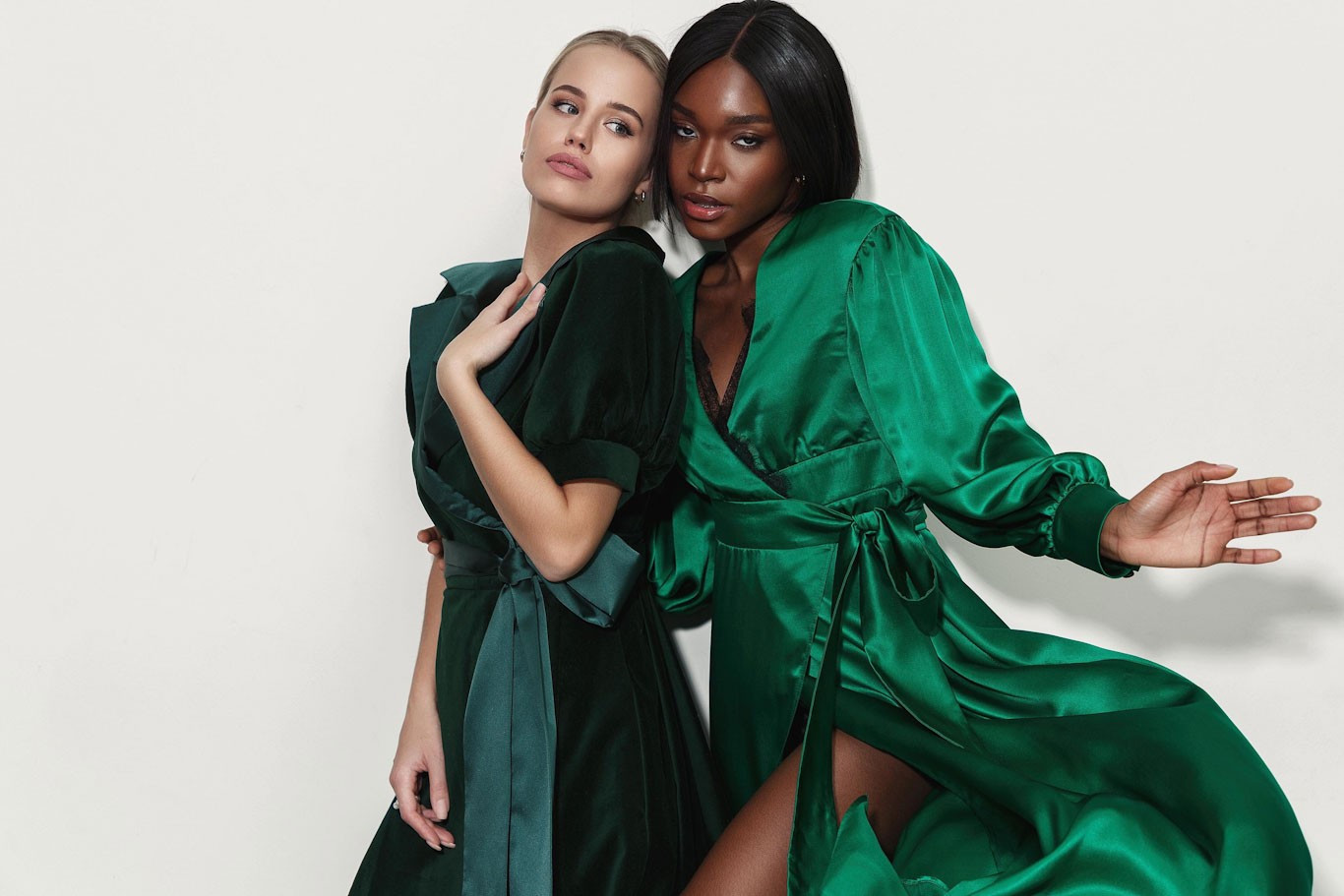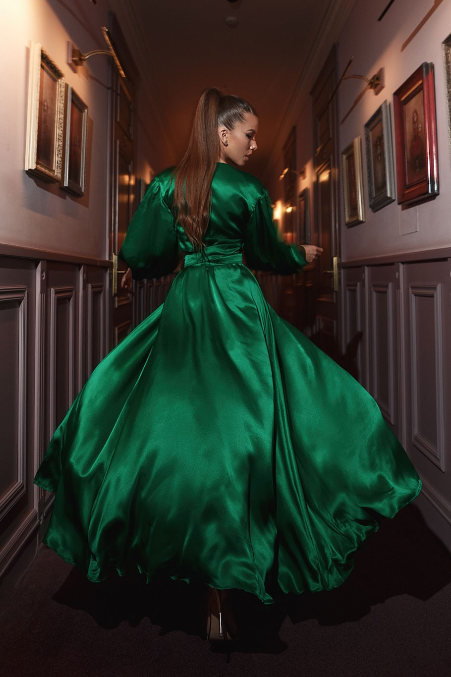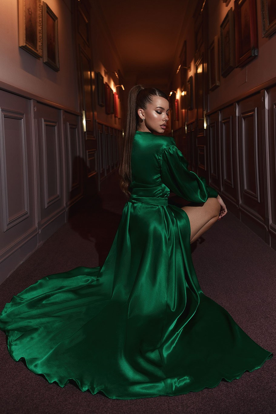 Роскошное летящее и женственное шелковое платье на запах, со спущенными плечами и длинными рукавами с манжетами, прекрасно подойдет к праздничному мероприятию, в любое время года. Великолепный крой подчеркивая все достоинства женской фигуры. Нежное кружево в зоне декольте добавляет изысканности всему образу.