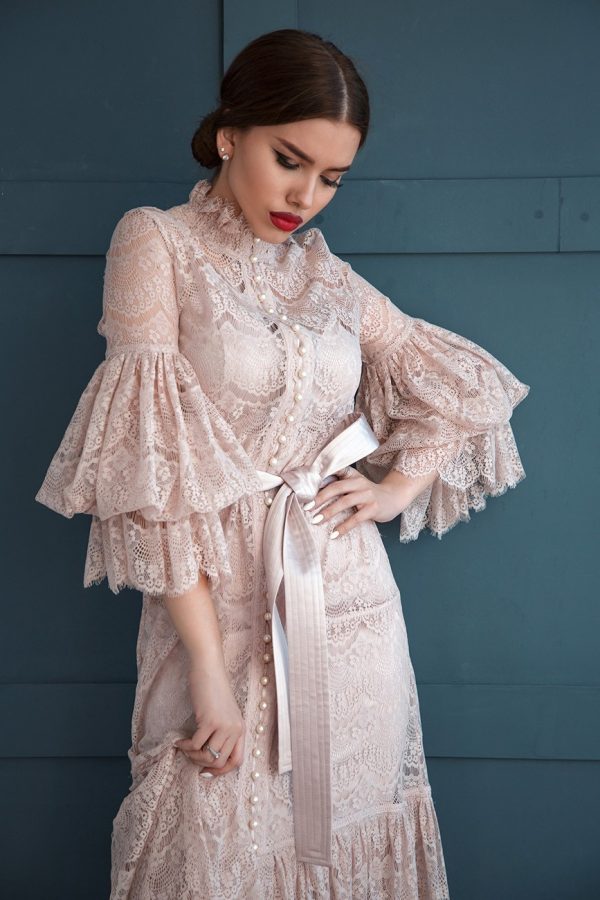 Кружевное платье шантильи миди с бархатным воротником и поясом