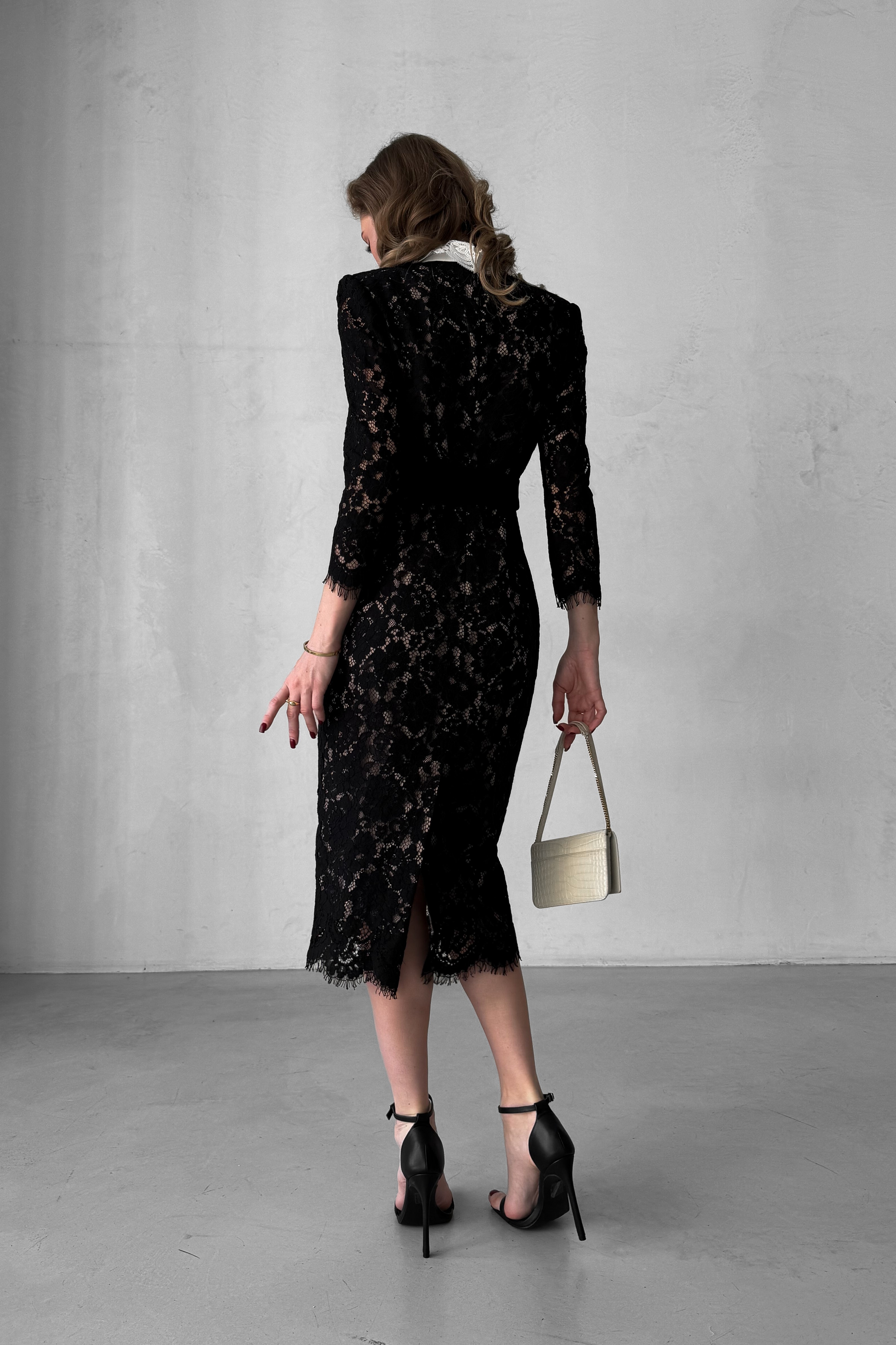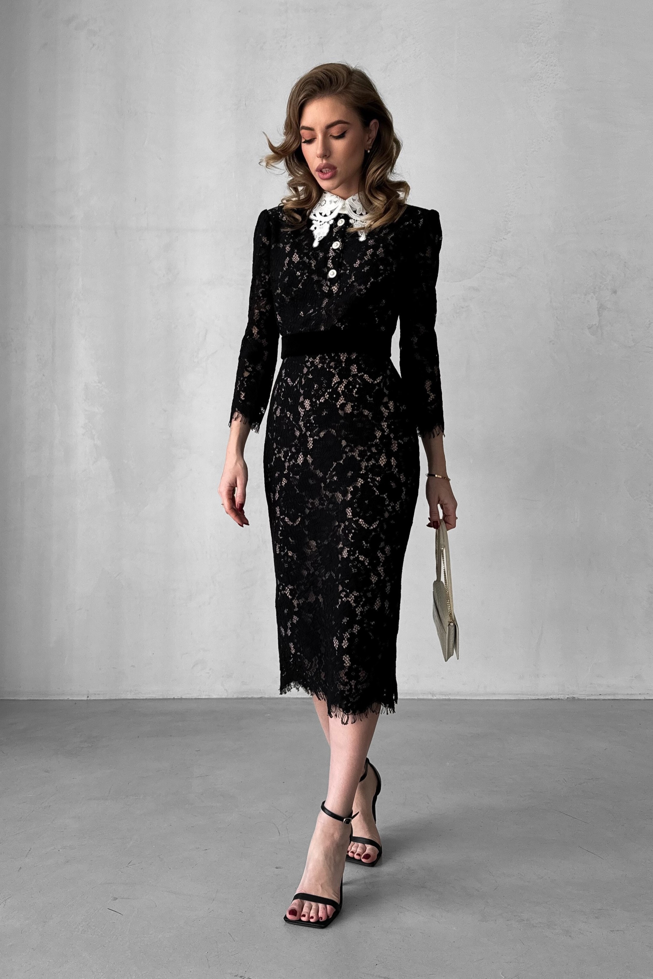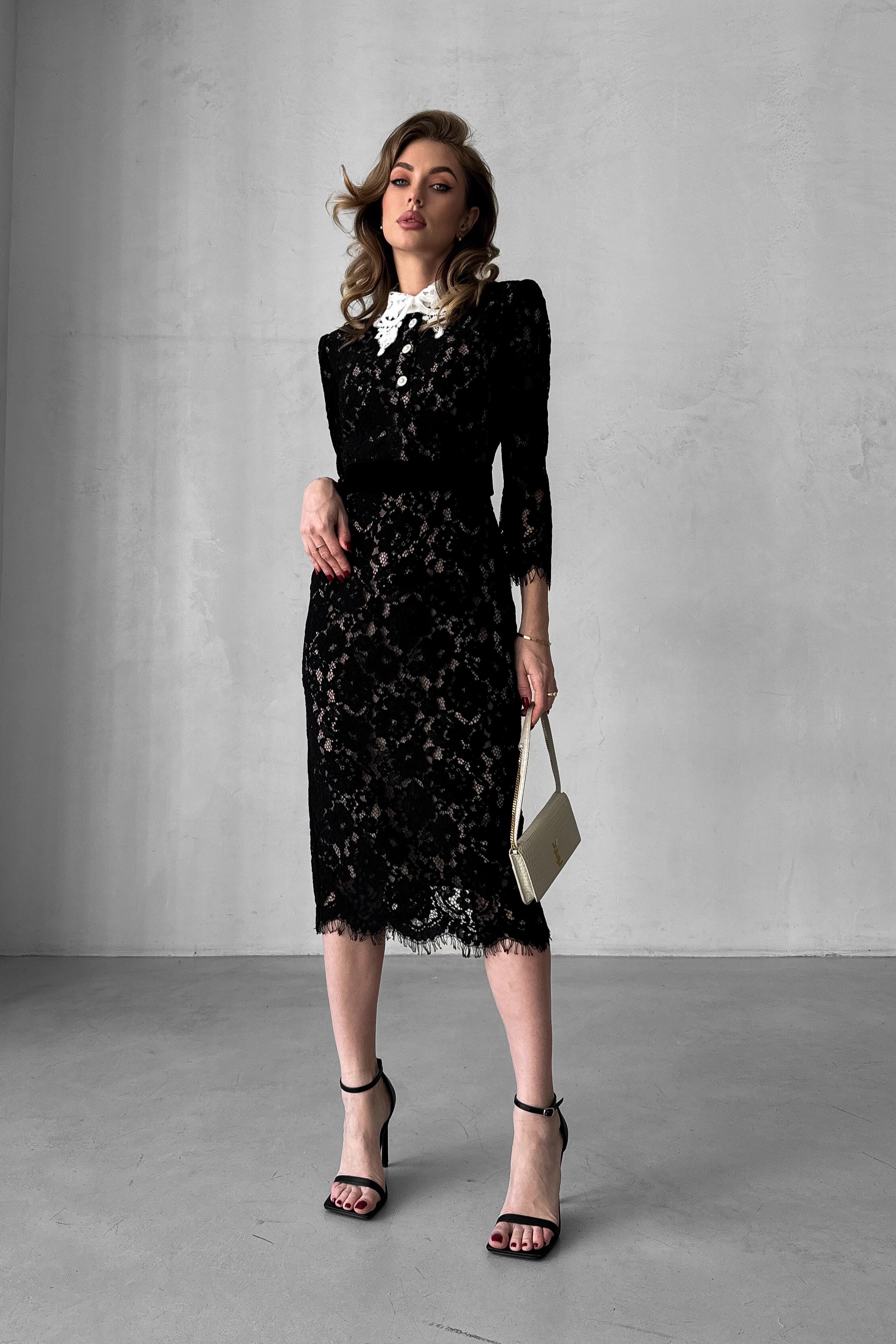 Кружевное силуэтное платье миди с белым воротником, с бархатным поясом, Sarah Berlin