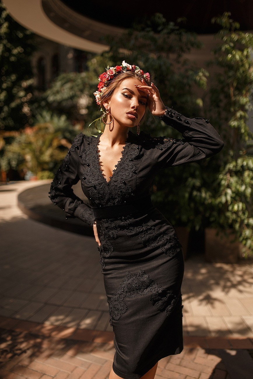 Прекрасное силуэтное платье с длинными рукавами с кружевом и с жемчугом. Роскошное, сексуальное и в то же время строгое и изысканное платье длиной миди прекрасно впишется в ваш гардероб и украсит любой вечер свой обладательницы. Данная модель также представлена в нашем каталоге без жемчуга (код модели 193)