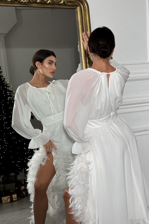 Шикарное платье на тонких бретелях, с перьями, из кружева, расшитого камнями.