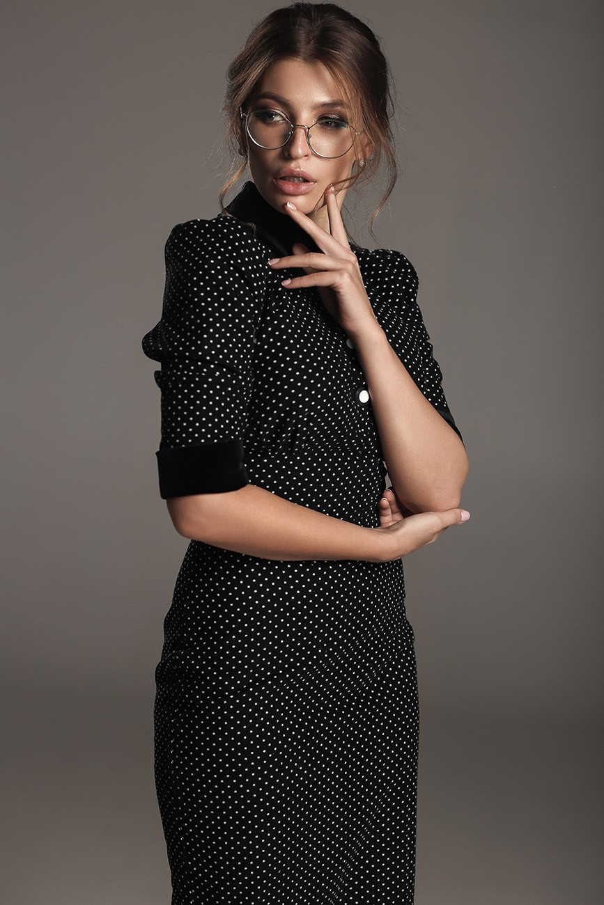 Элегантное силуэтное платье с бархатным воротником и манжетами и с высокой талией прекрасно садится по фигуре и выгодно подчеркивает все достоинства женской фигуры.