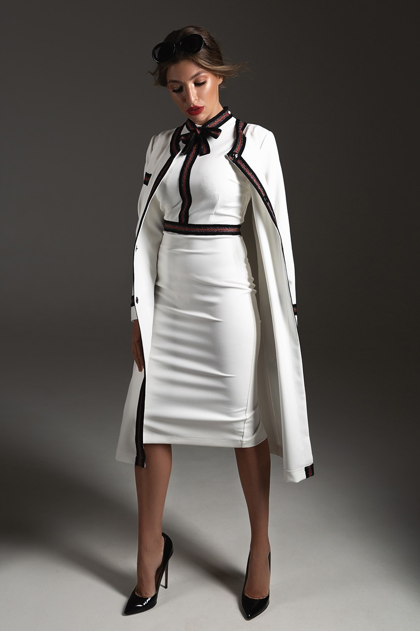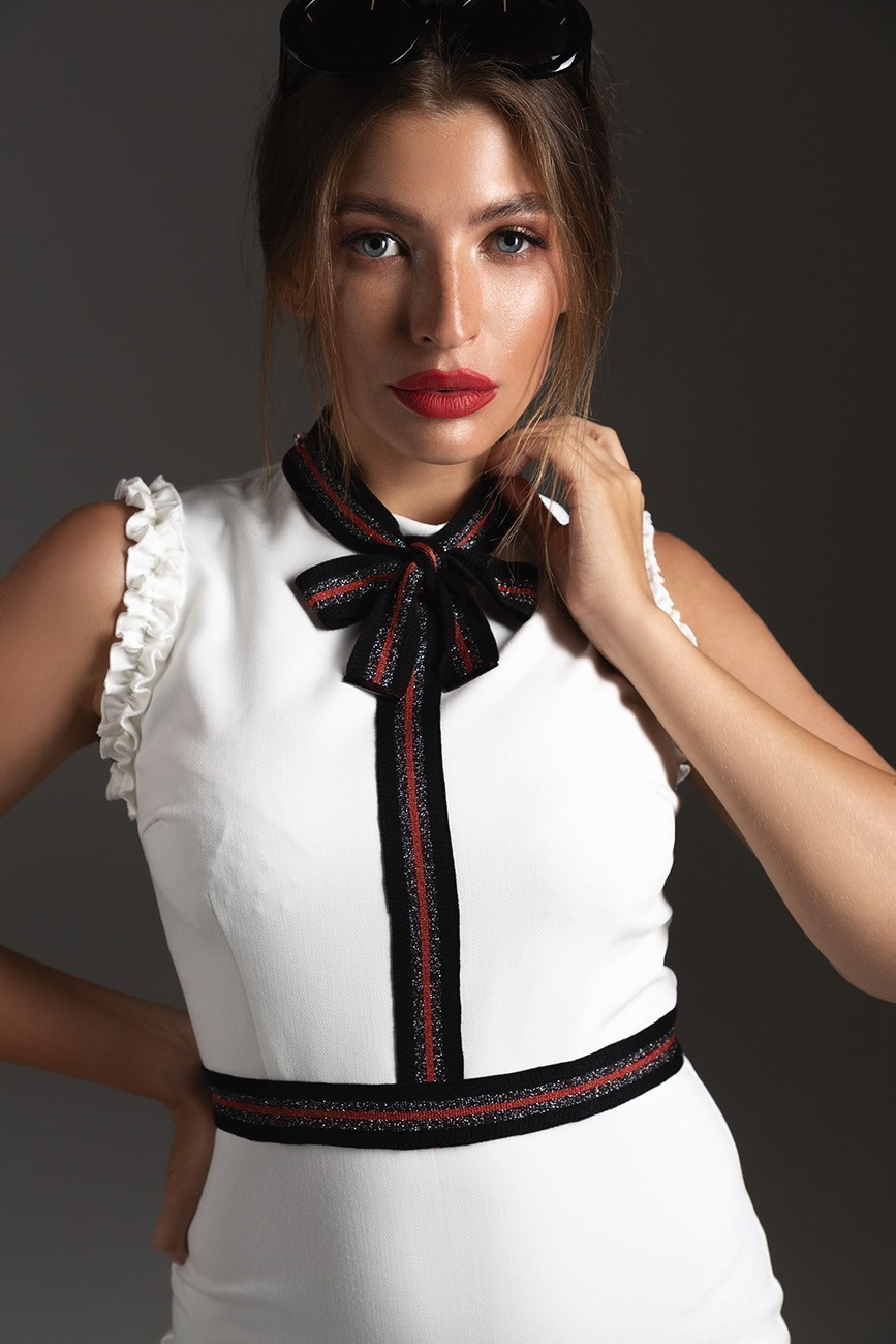 Элегантное силуэтное платье без рукава с рюшами, с воротником стойкой и бантом с контрастной отделкой прекрасно подойдет для делового ужина или для рабочих будней. Великолепный крой идеально подчеркивает женскую фигуру.
