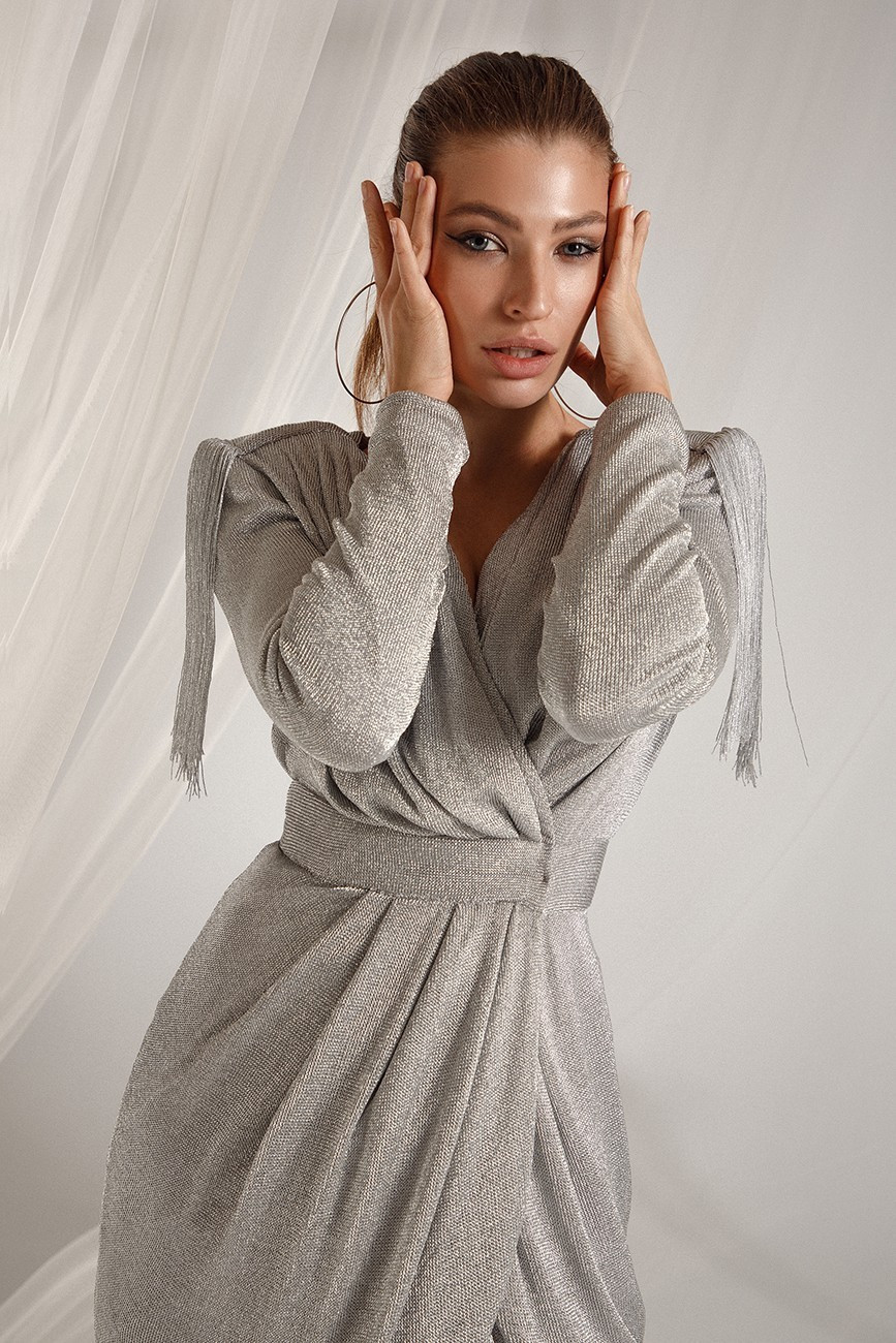 Стильное женственное платье с мерцанием на запах с драпировкой.