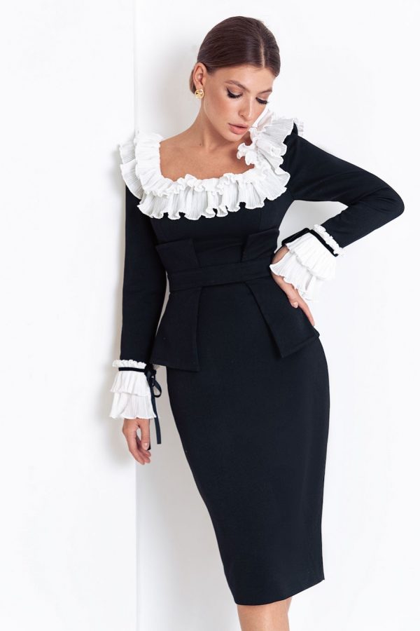 Форма: с Vобразным вырезом, на запах, с длинными рукавами, с фигурной юбкой, ниже колен.