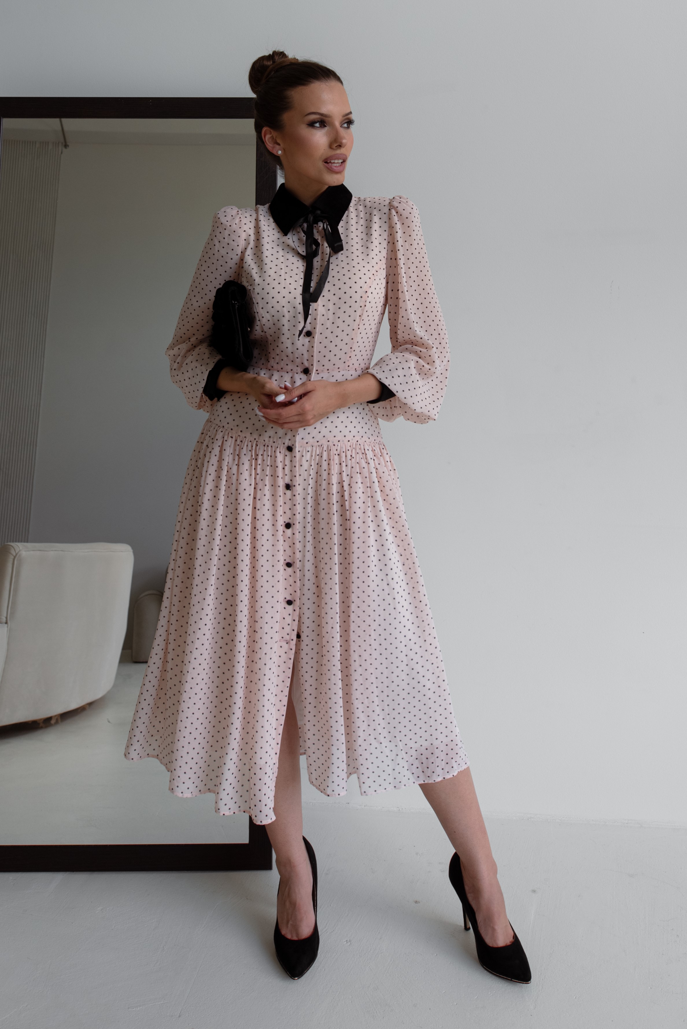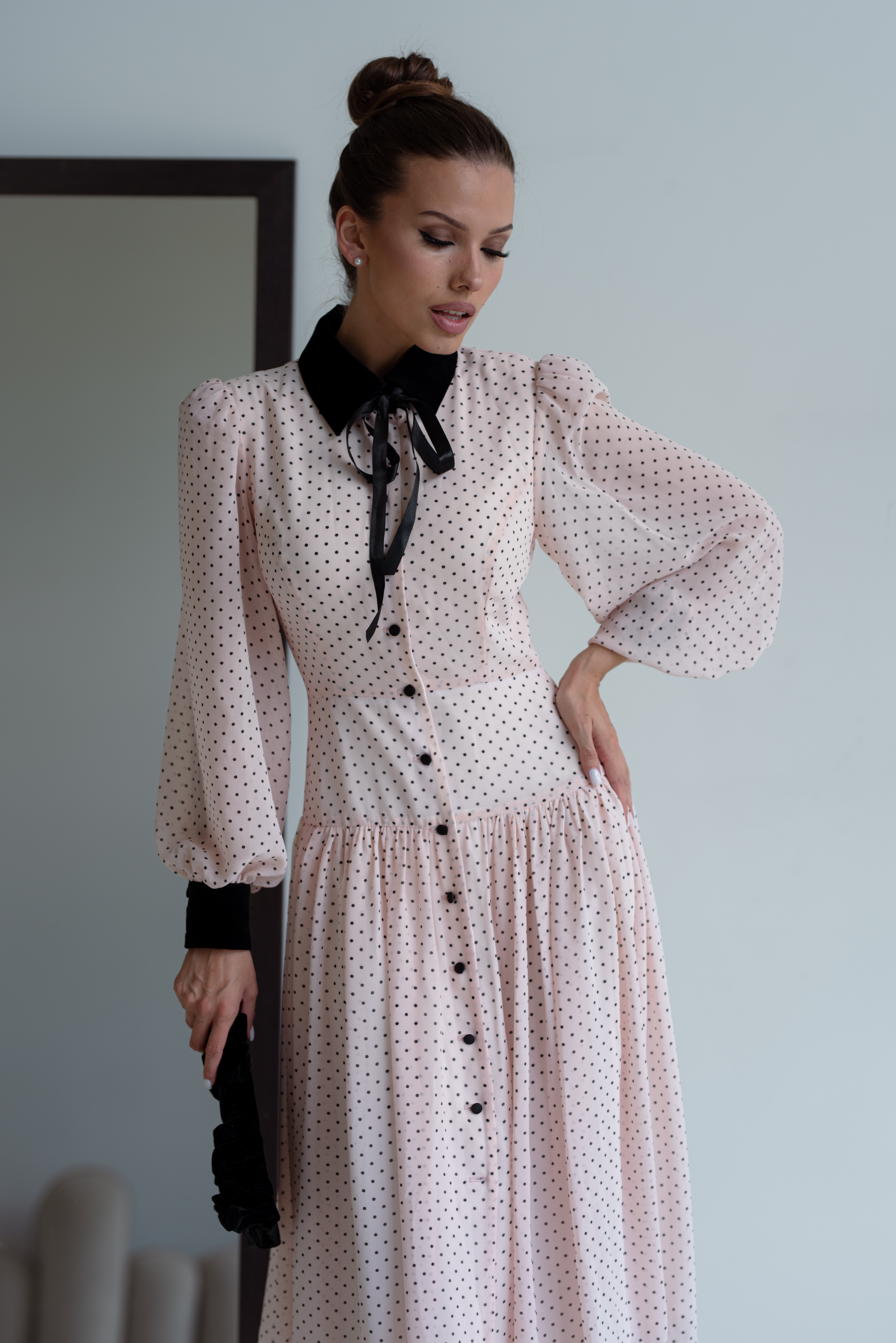 Шифоновое платье в горошек, с бархатным воротником и манжетами