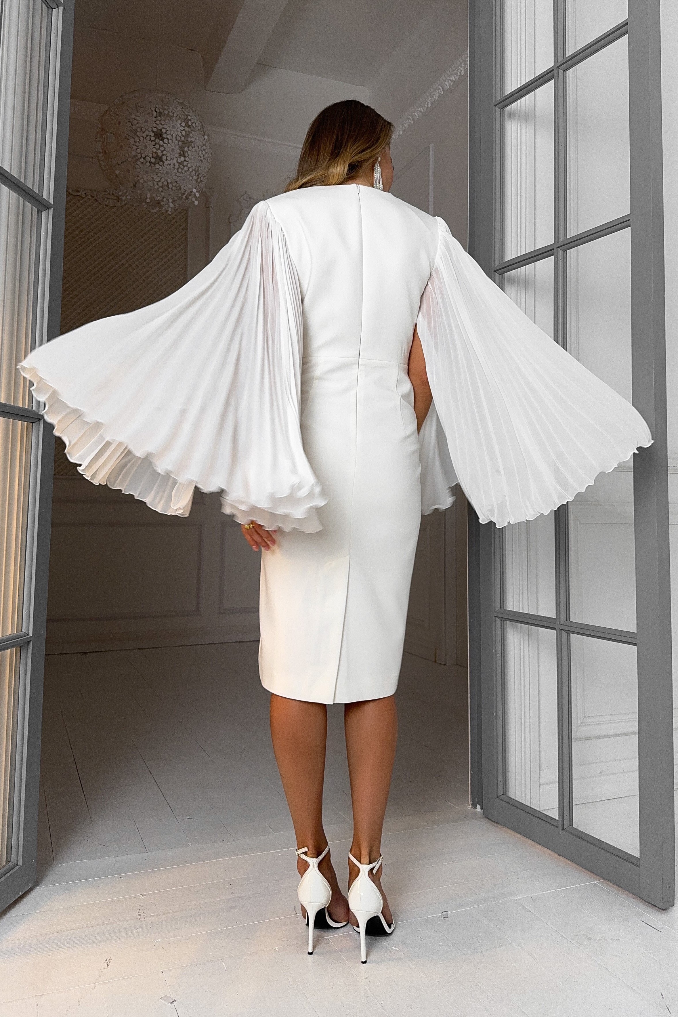 Силуэтное платье миди с плиссированными рукавами.