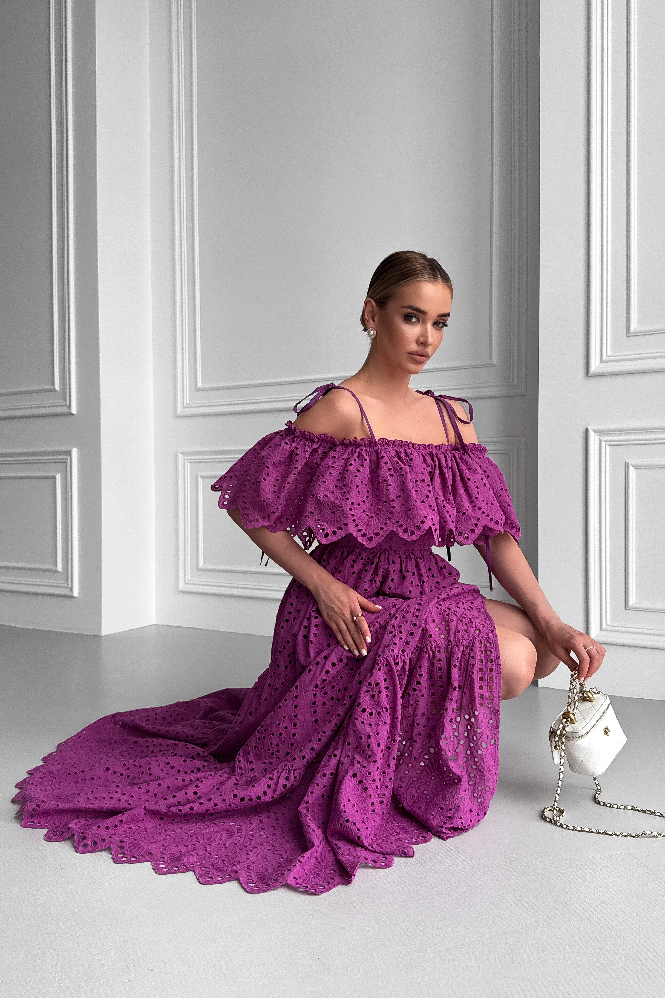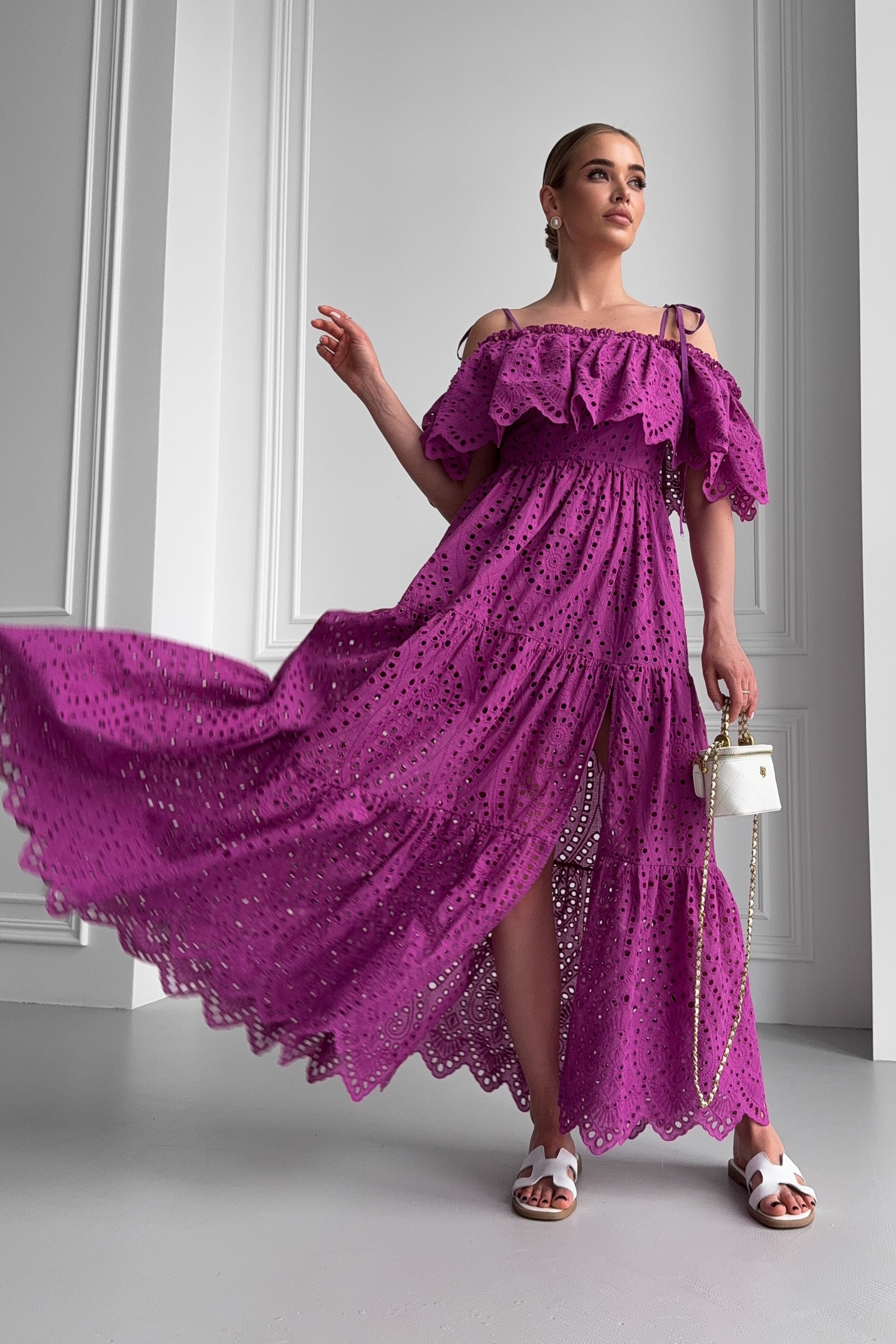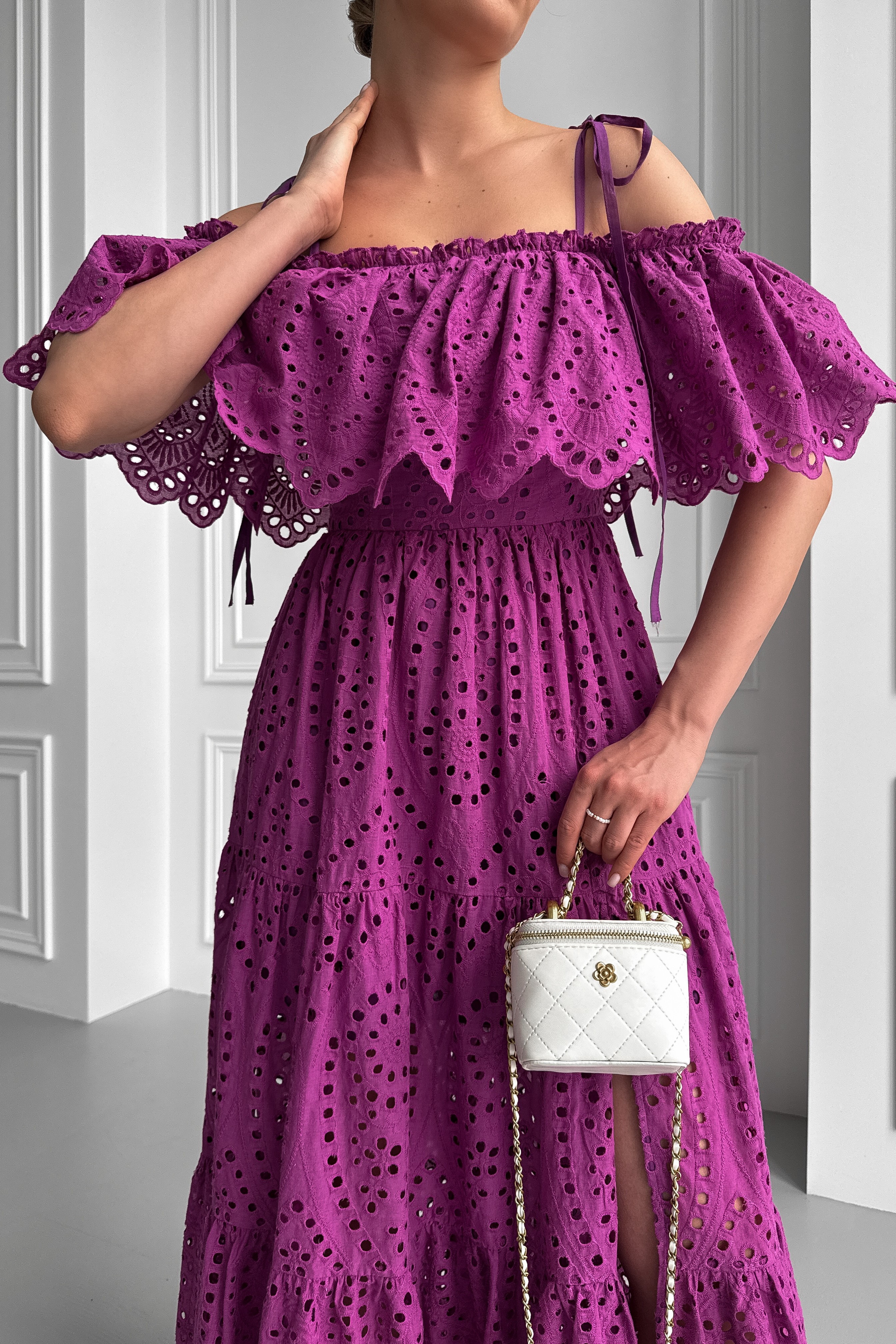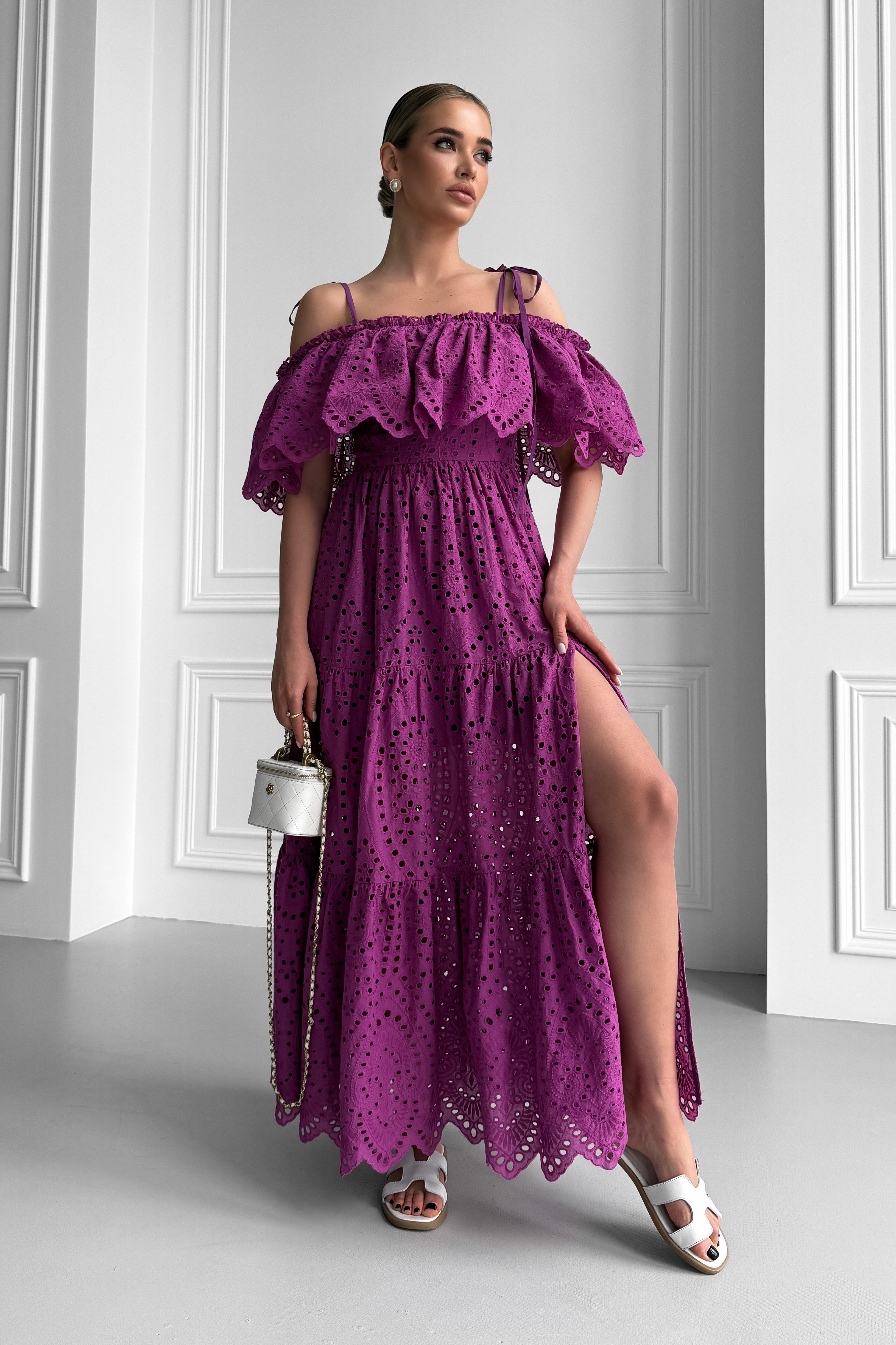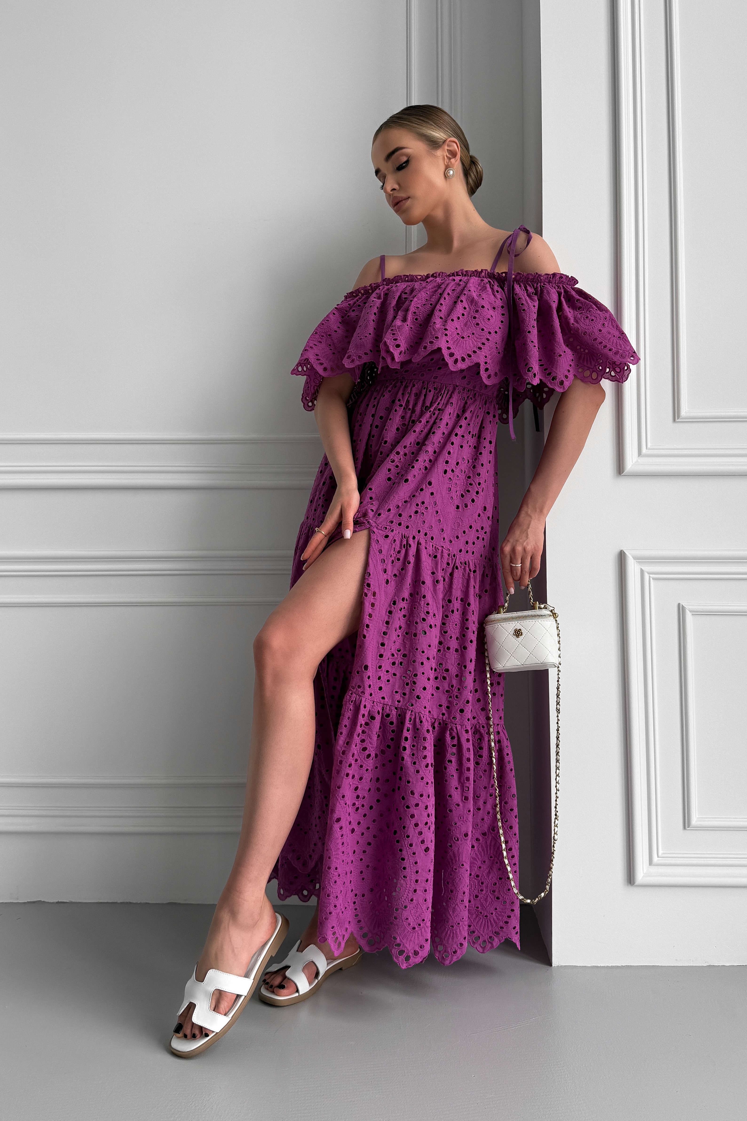 Длинный хлопковый сарафан из прошвы с открытыми плечами, с разрезом на ноге