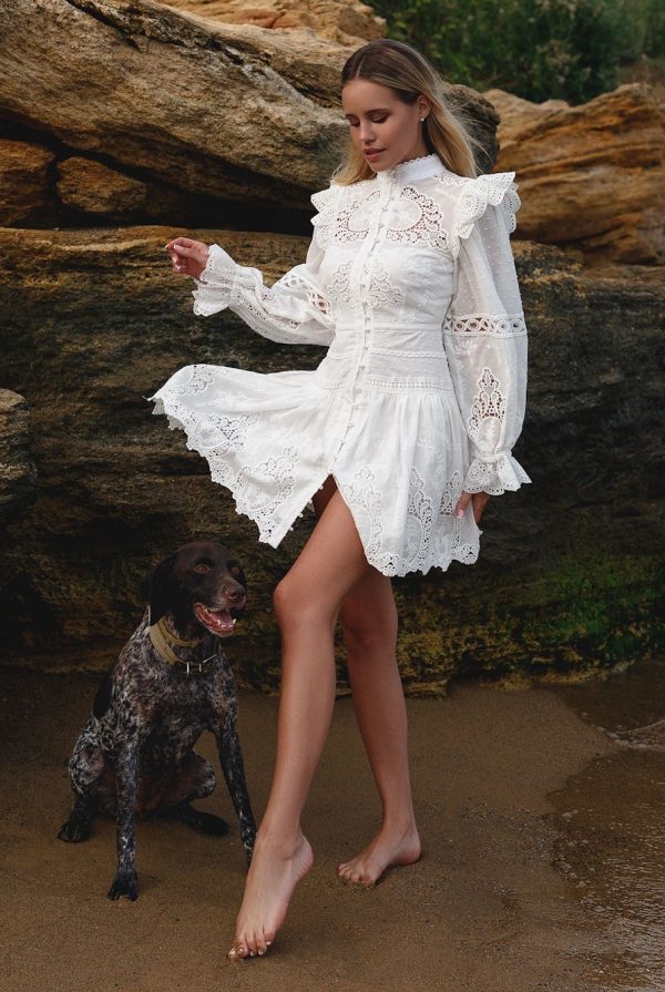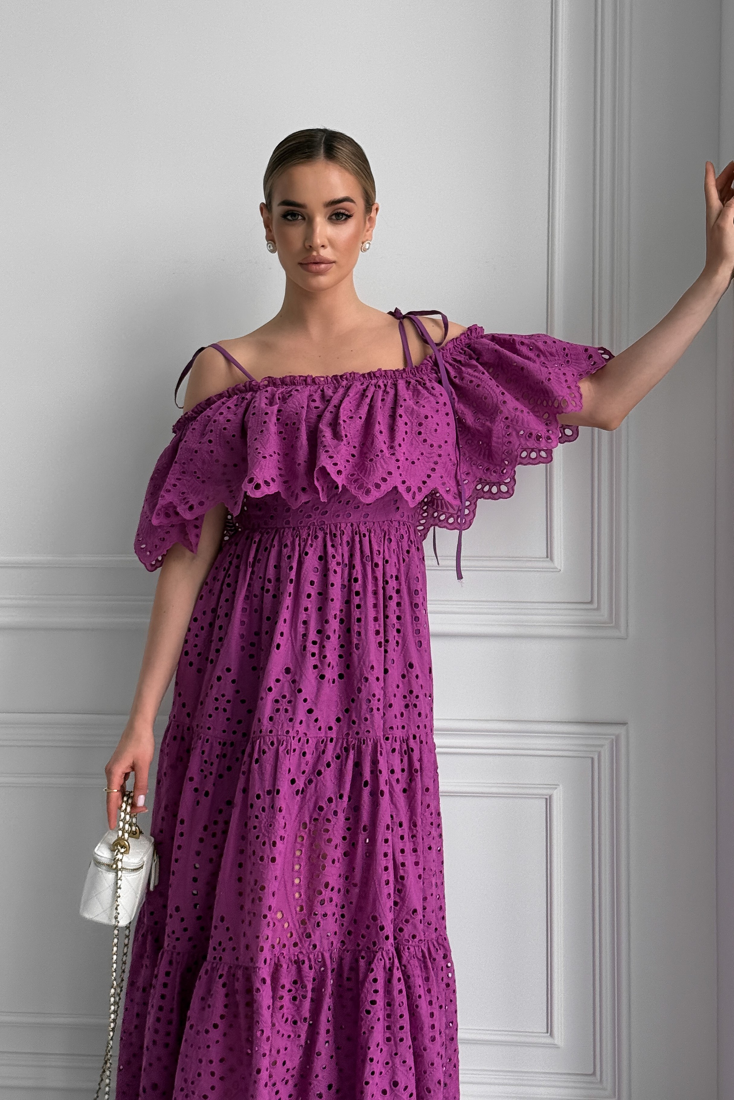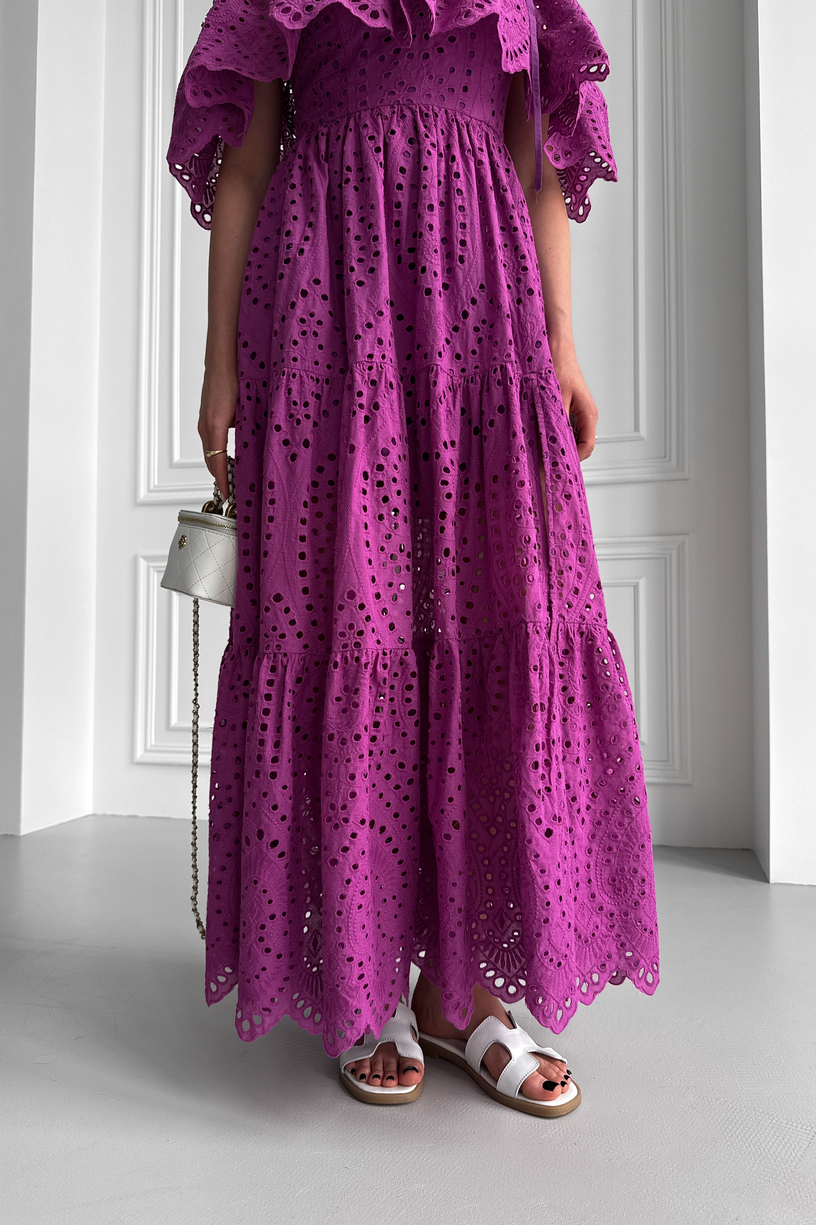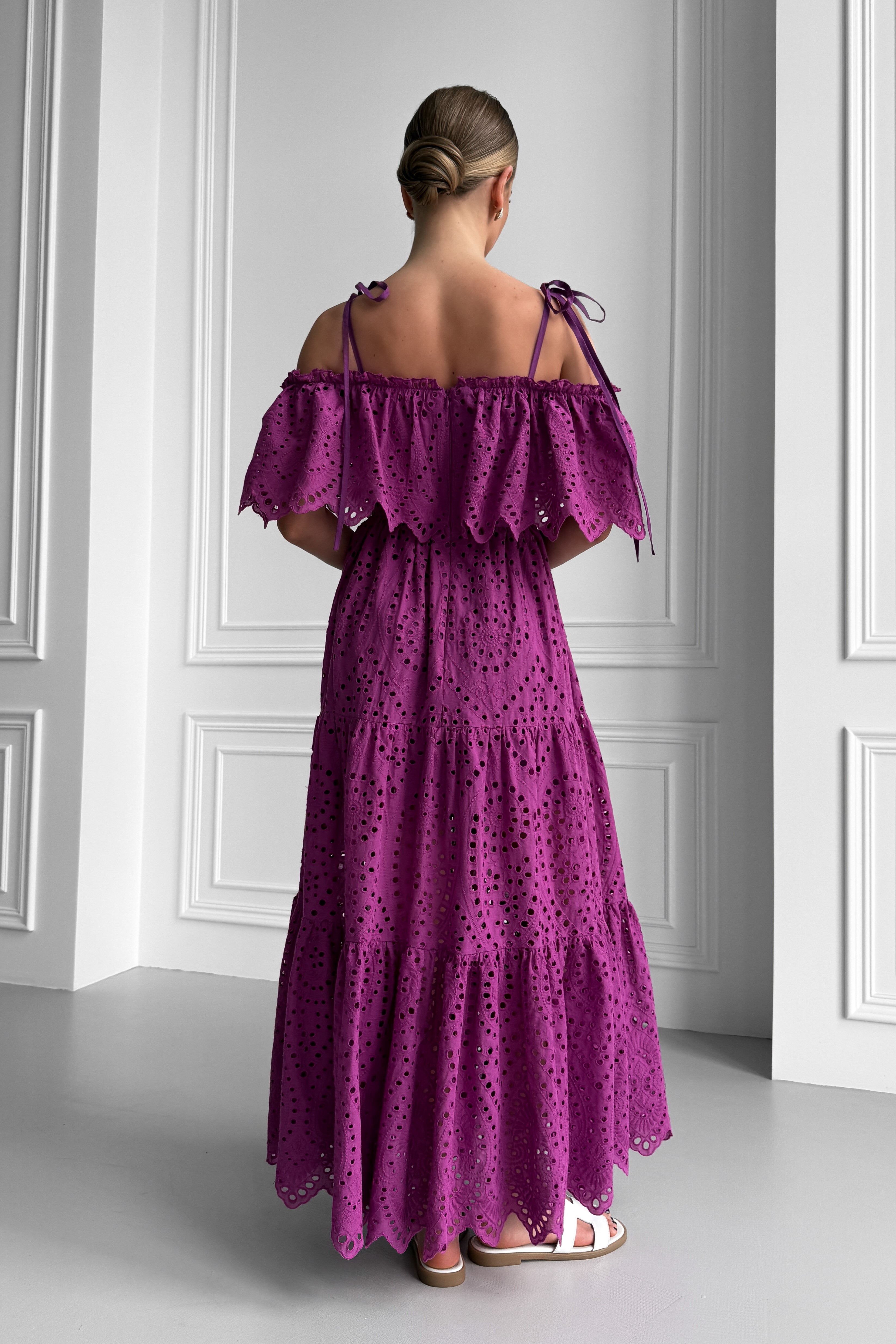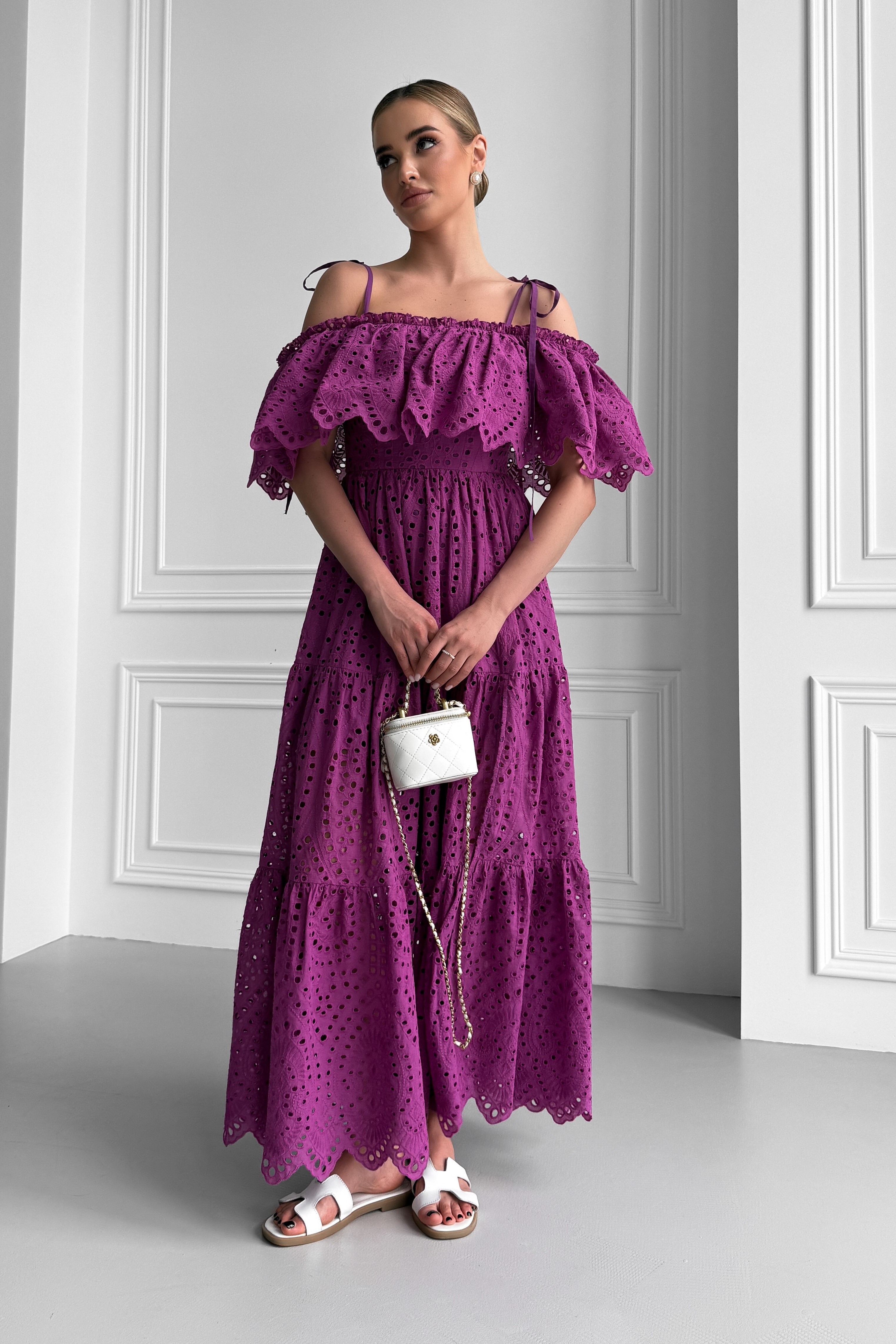 Длинный хлопковый сарафан из прошвы с открытыми плечами, с разрезом на ноге