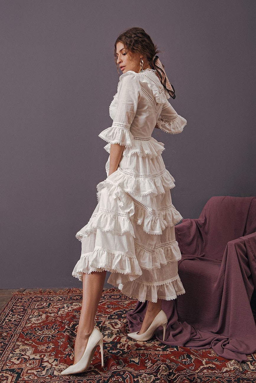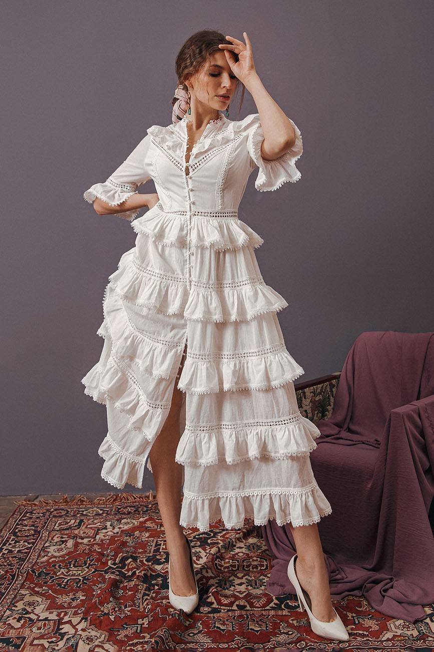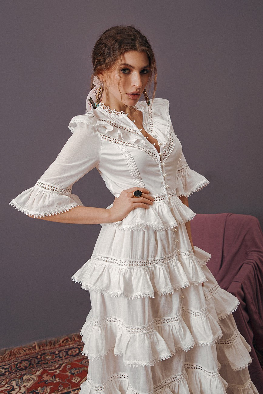 Элегантное хлопковое платье с оборками, с отделкой из кружева, длиной до щиколотки.