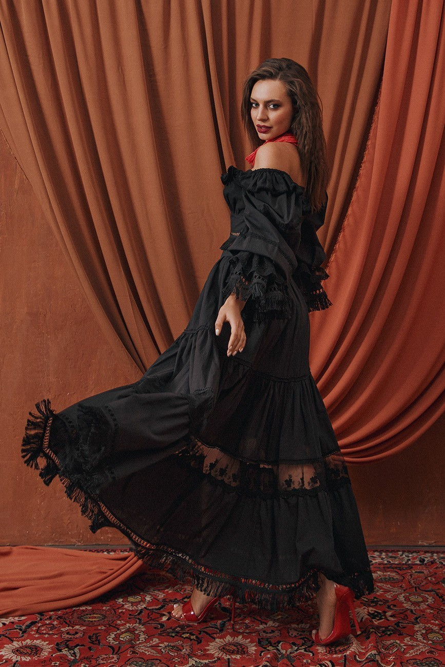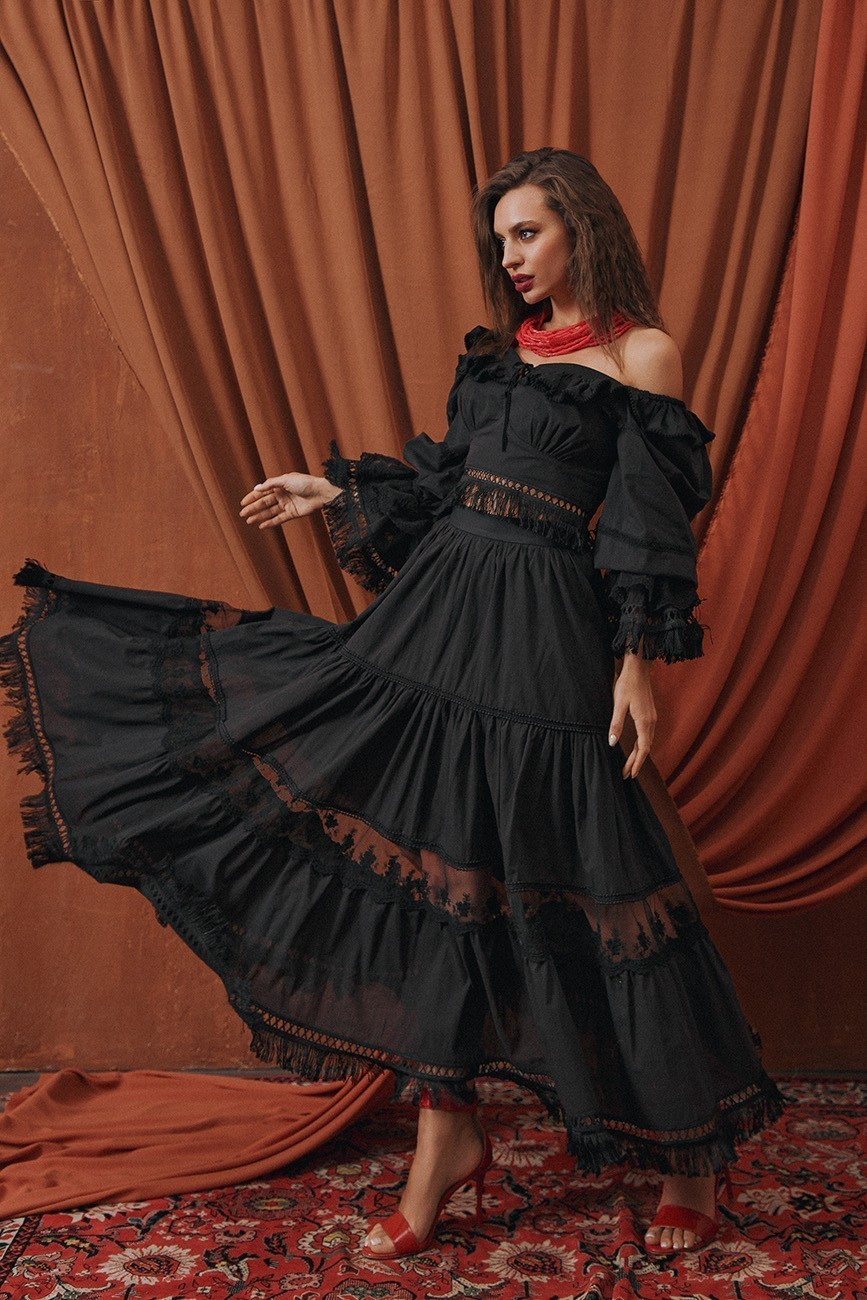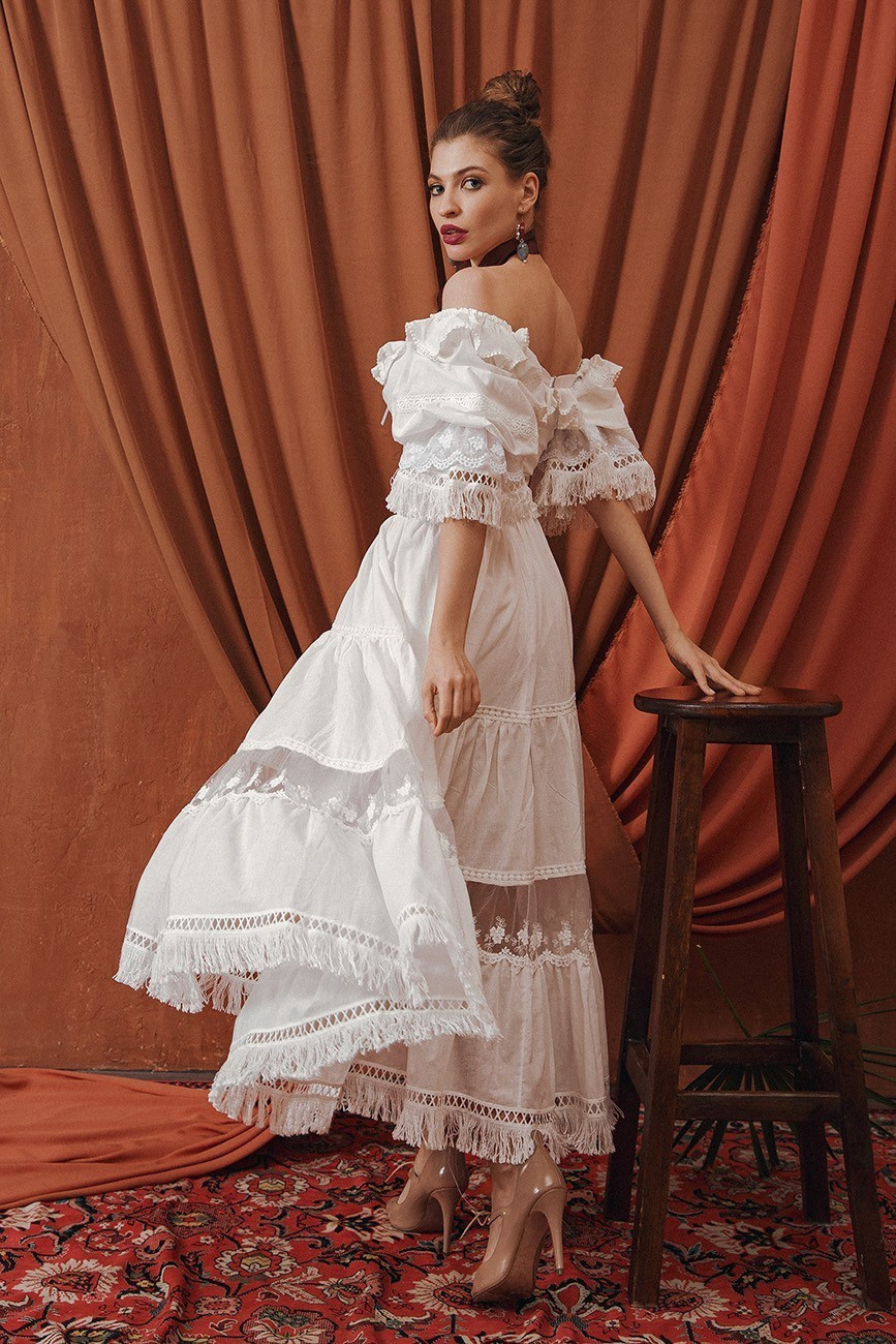 Стильный элегантный хлопковый комплект: топ с открытыми плечами с длинными рукавами на резинке, рукава можно поднять на плечи, и пышная юбка в пол с бахромой.