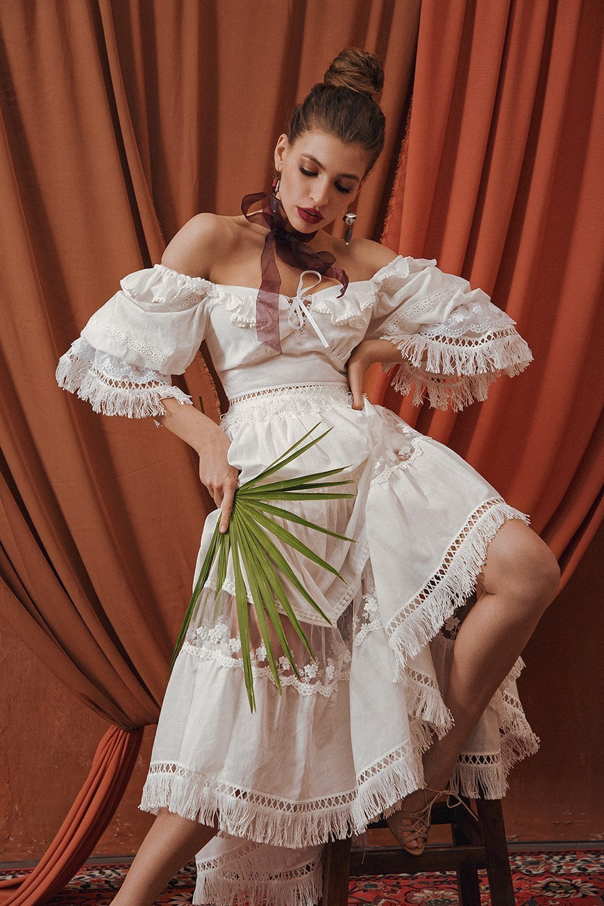 Женственный хлопковый костюм топ с пышной юбкой с бахромой.