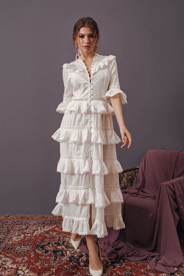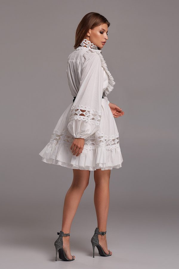 - С горловиной лодочка, с цельнокроеными широкими рукавами, с манжетами, с пышной юбкой