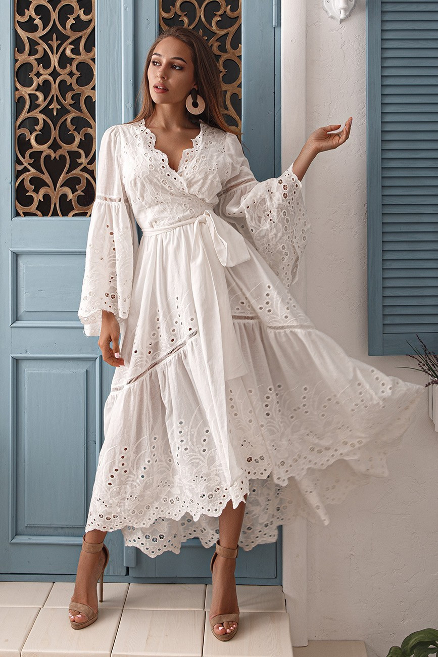 Хлопковое платье на запах с вышивкой и с кружевом.