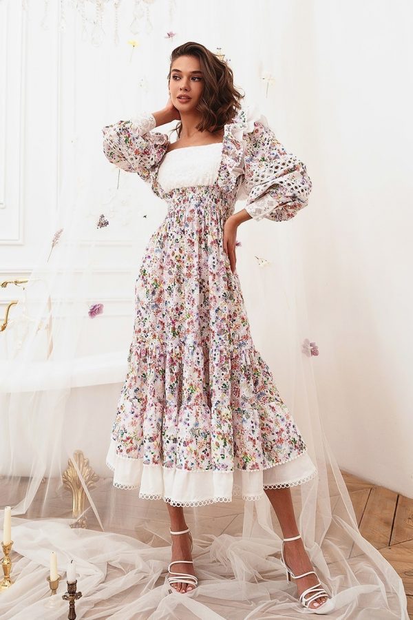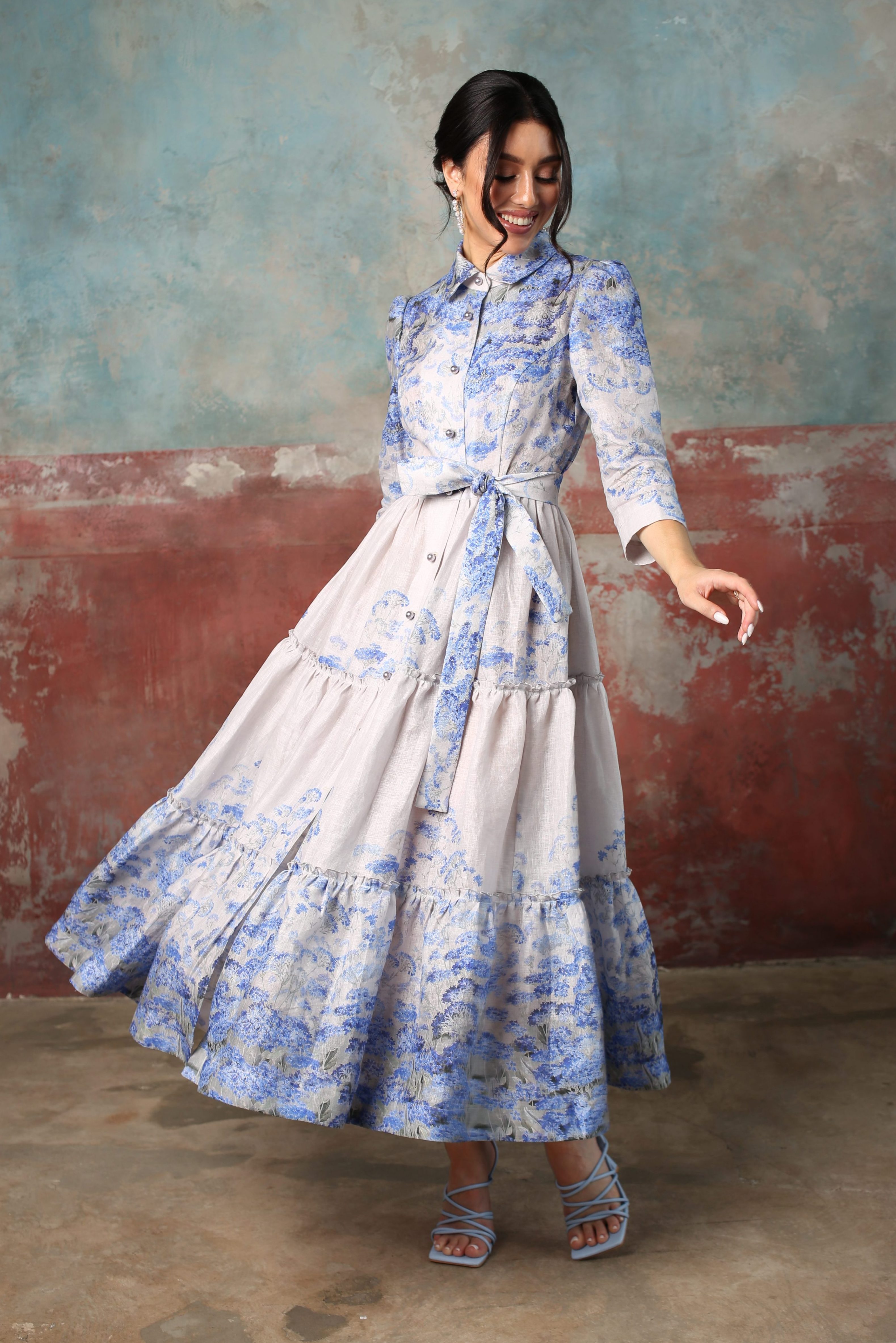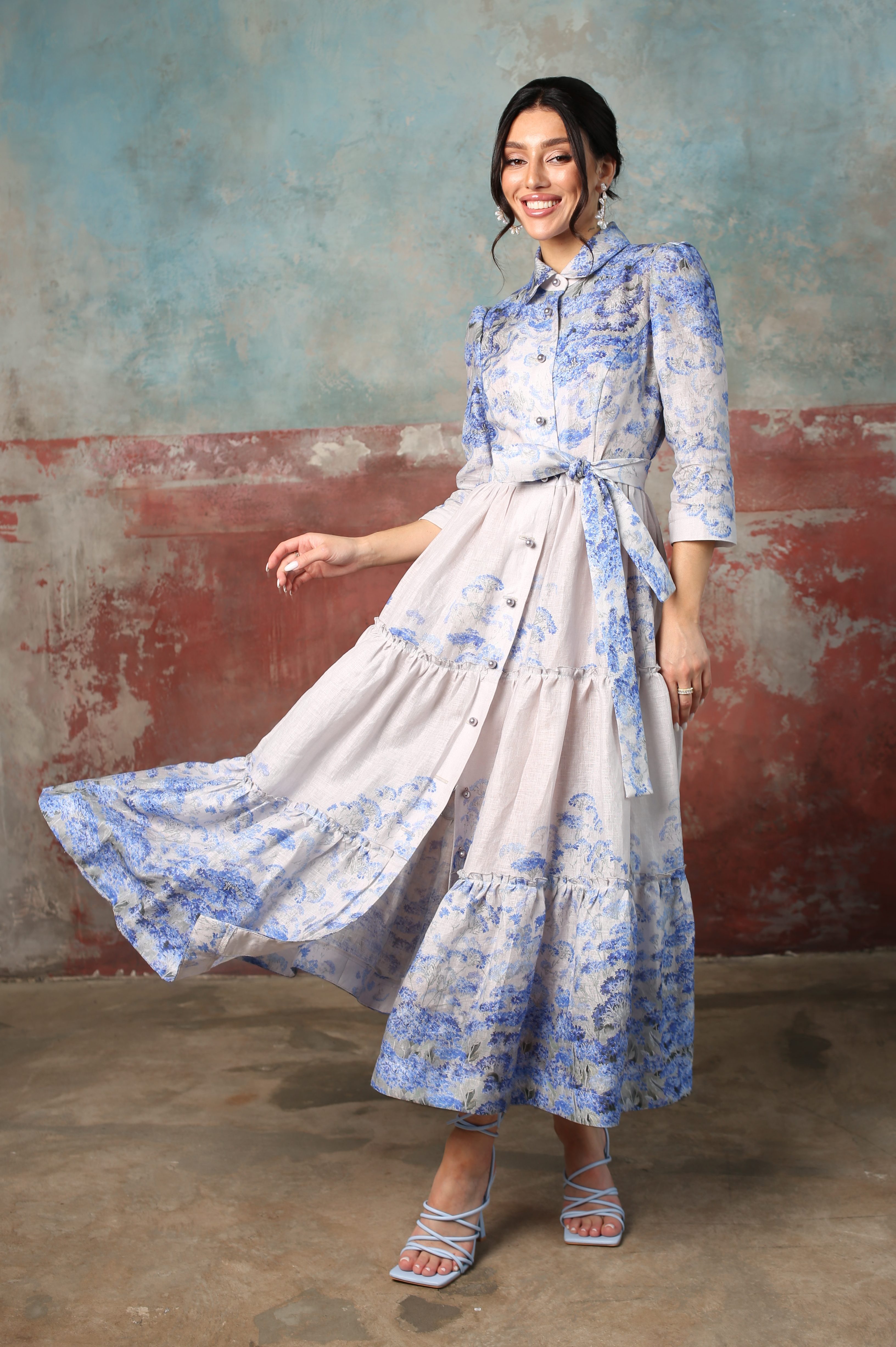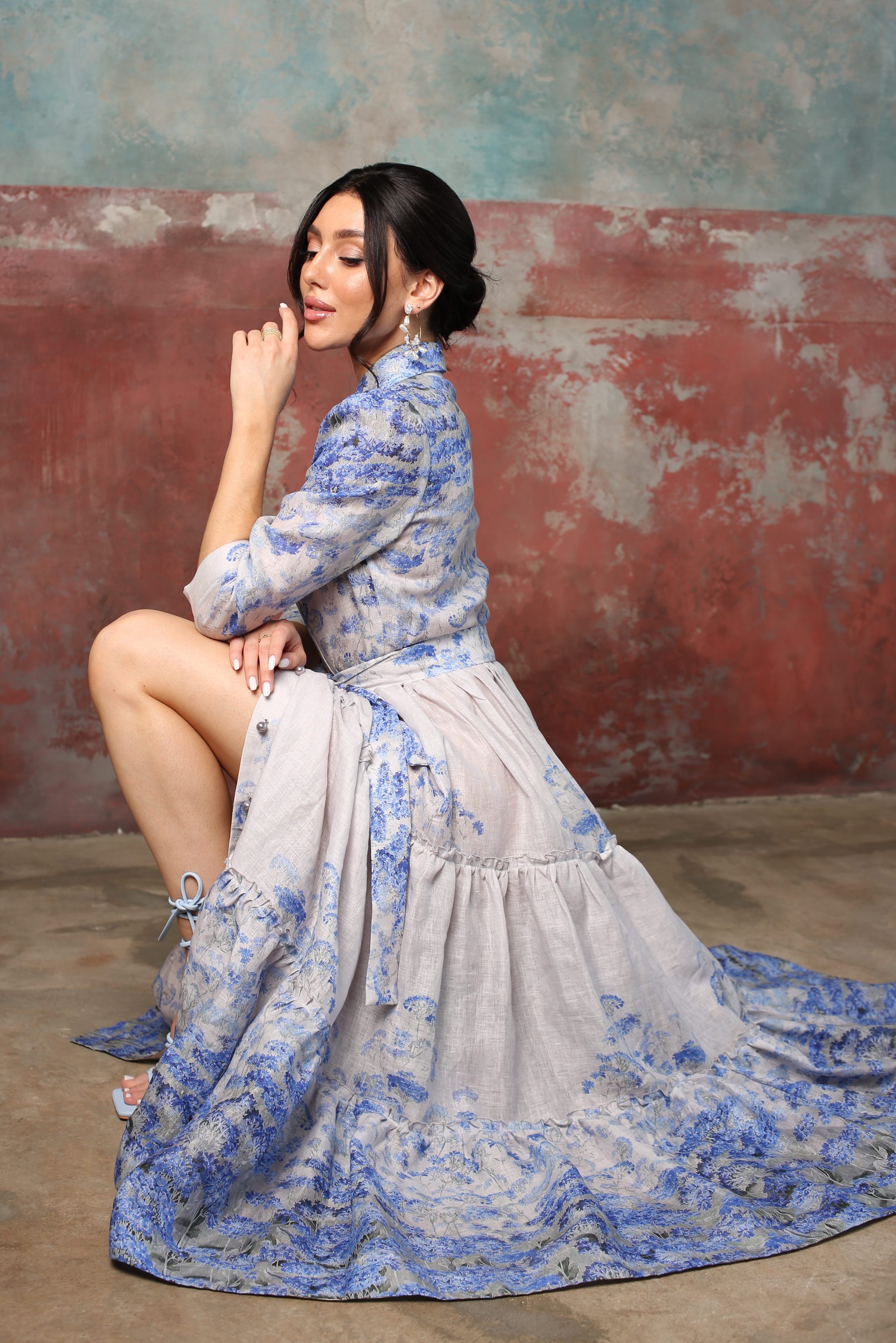 Платье с воротником и застежкой спереди, из итальянского льна с принтом