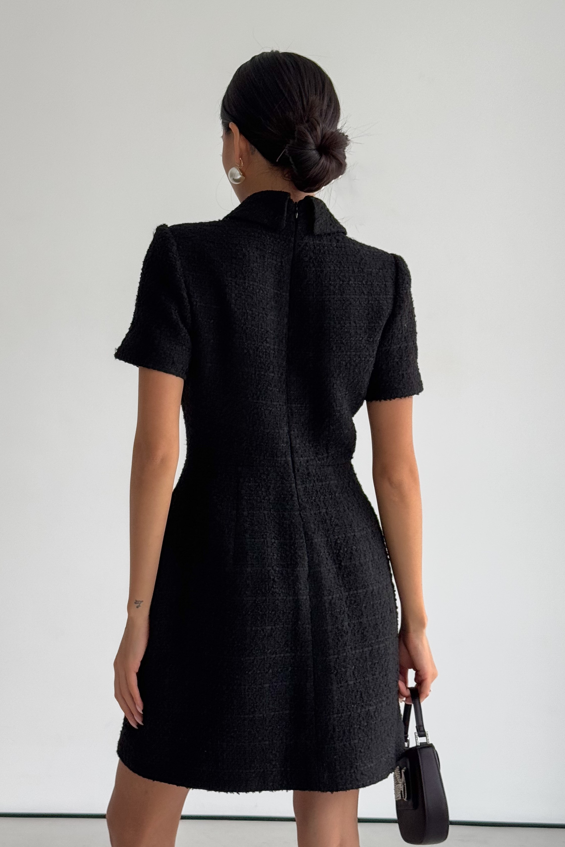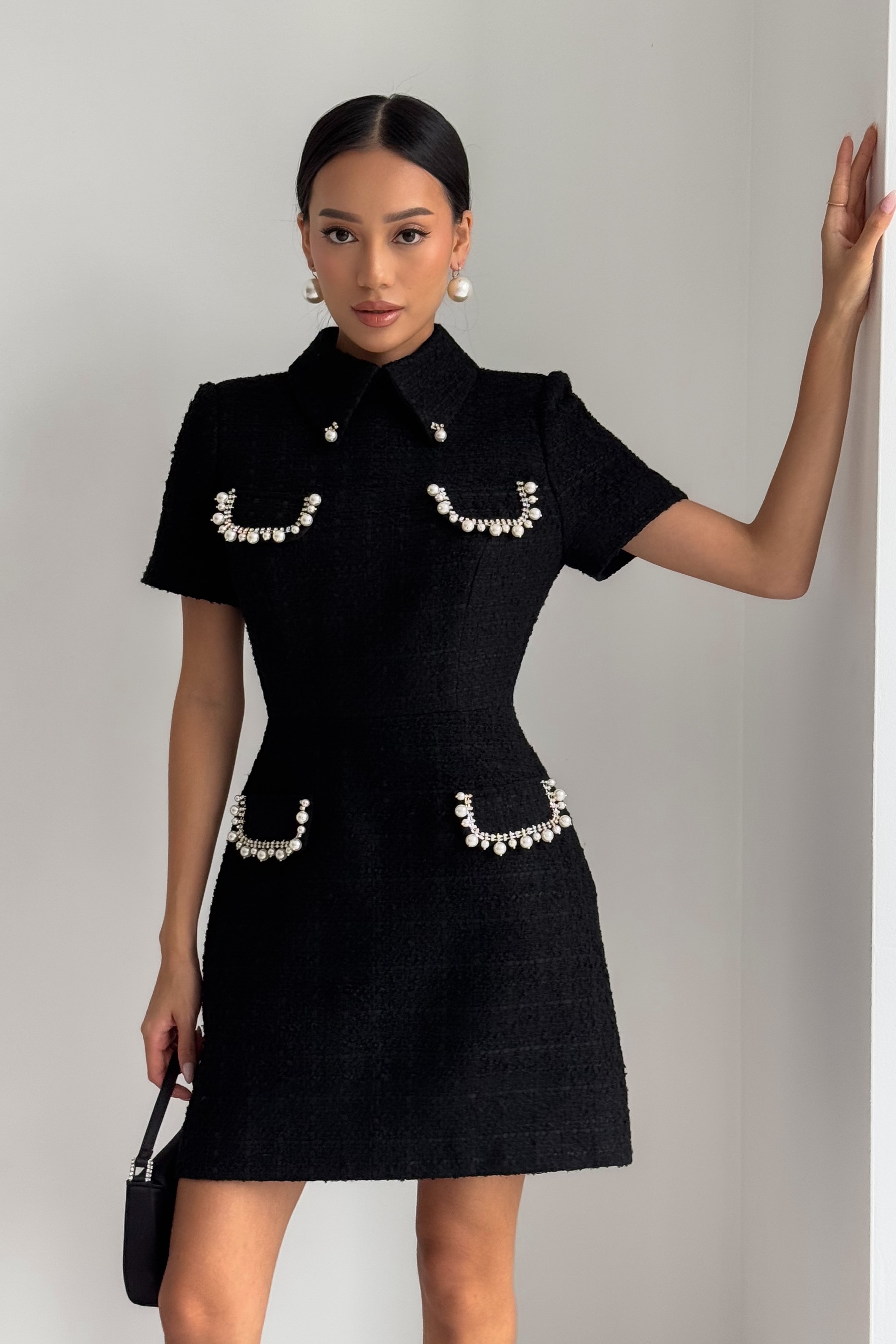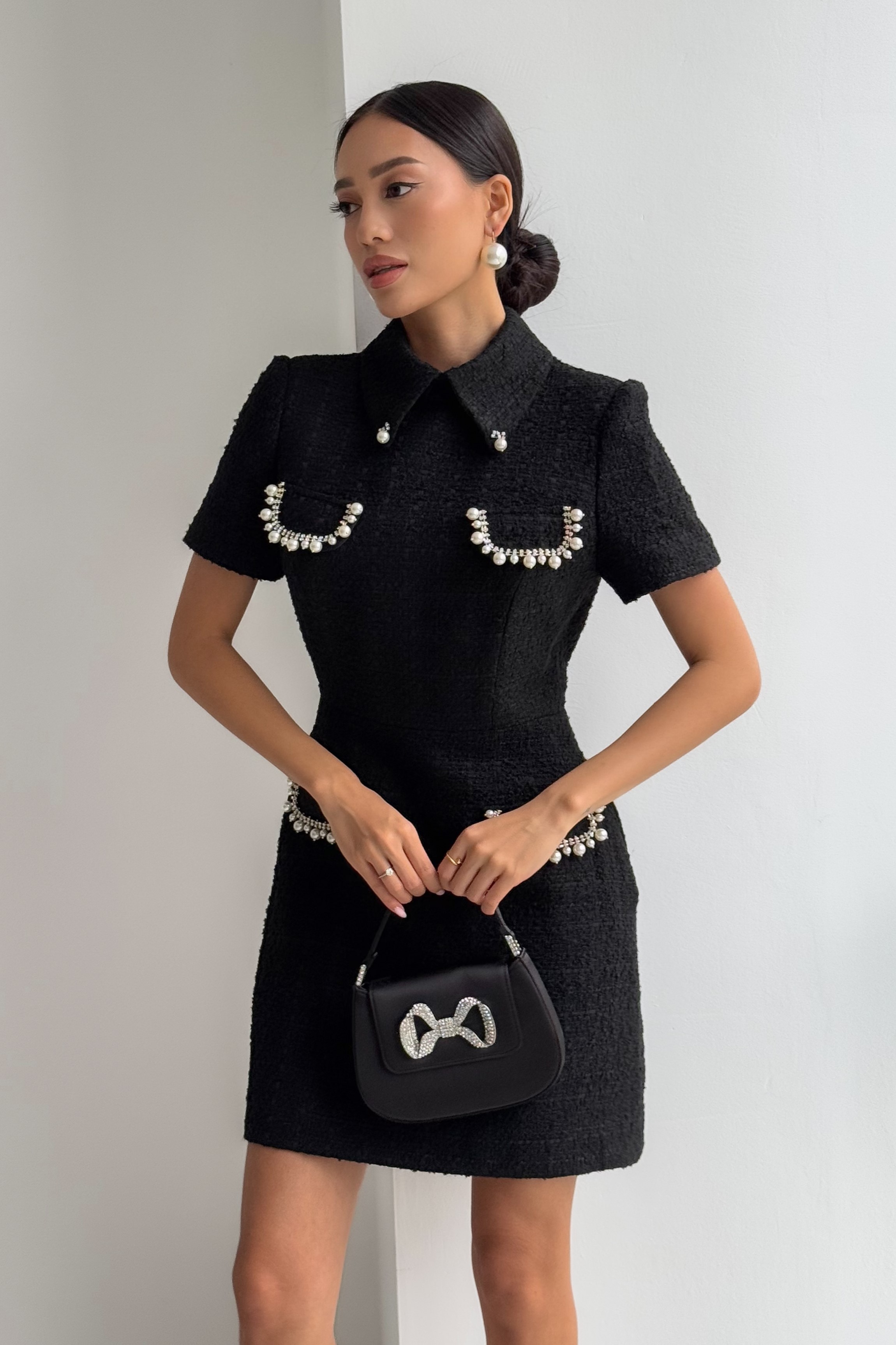 Твидовое короткое платье с клапанами, расшитое жемчугом с камнями.