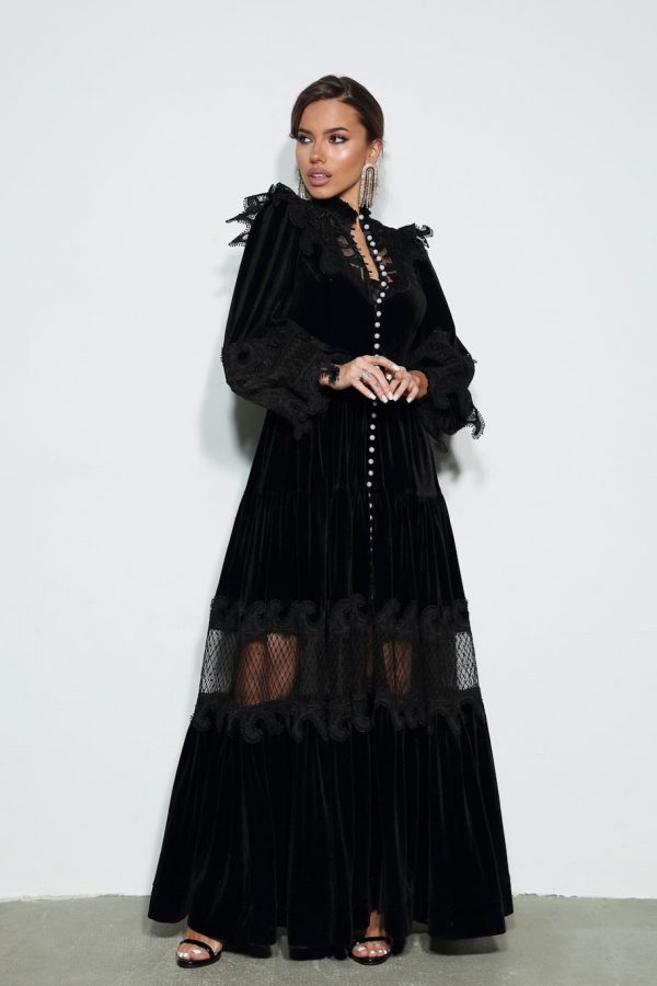 Вечернее платье из бархата в пол с перышками.