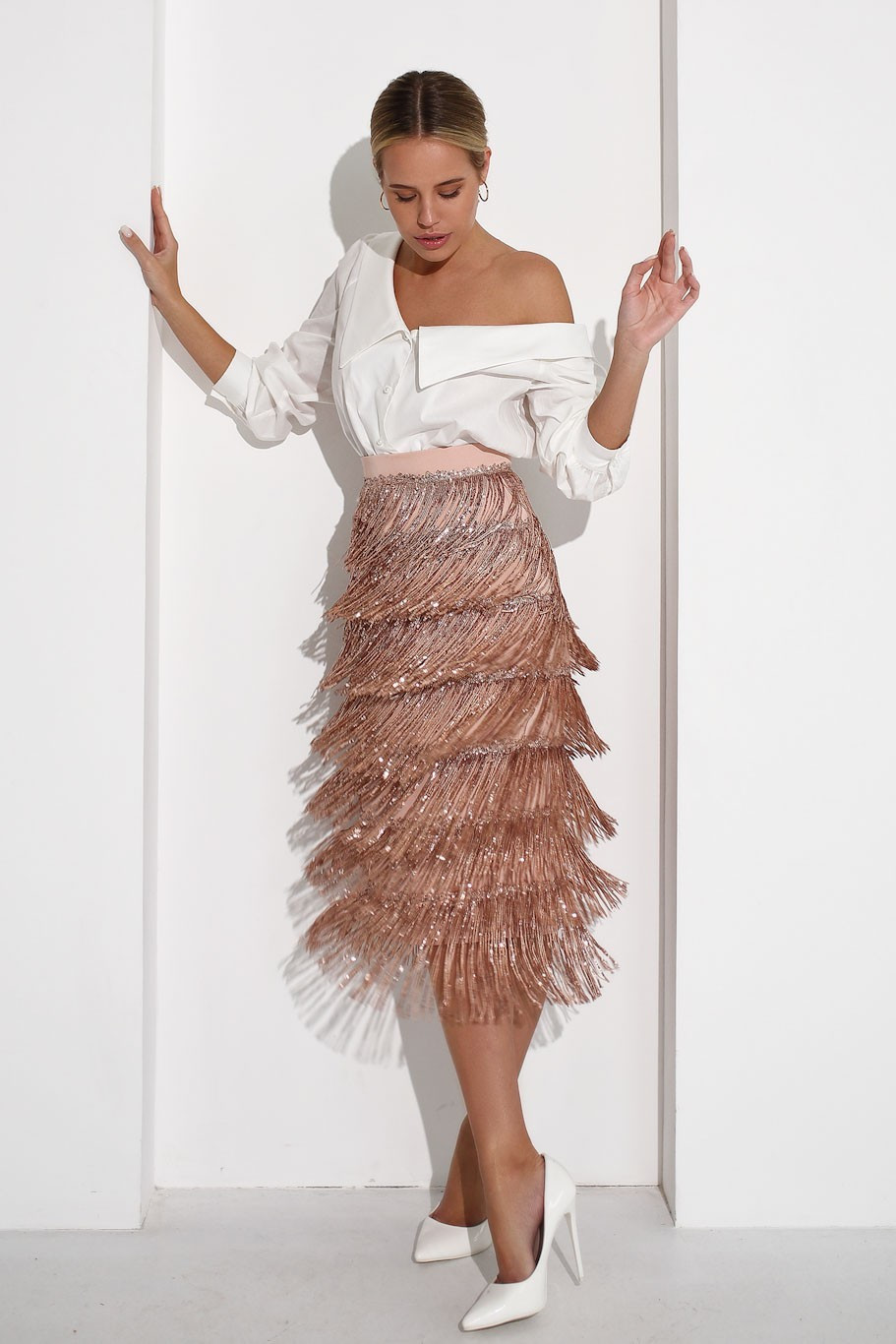Великолепная юбка карандаш с высокой талией, расшитая бахромой из пайеток. Идеальный образ для праздничного мероприятия дополнит блуза из хлопка или шелка из нашей коллекции.
