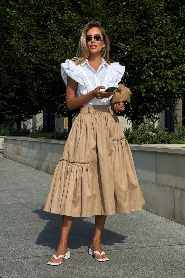 Прекрасно смотрится с кроп топами с перьями или с широкими стильными блузами свободного кроя.
