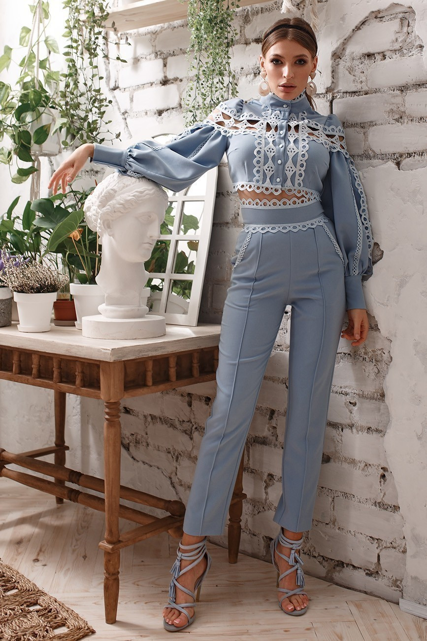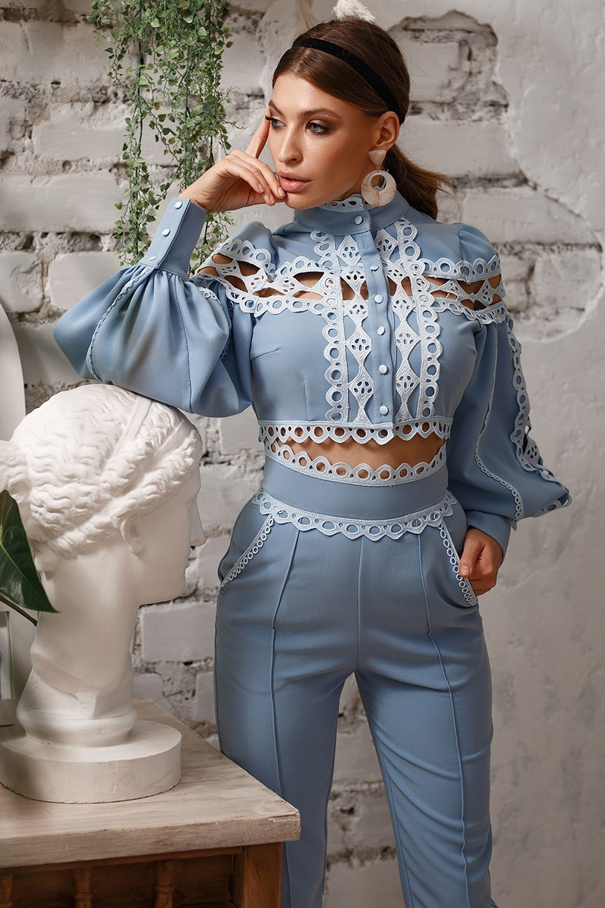 Брючный костюм с кружевом, состоящий из укороченного топа с пышными рукавами и узких брючек с высокой талией.