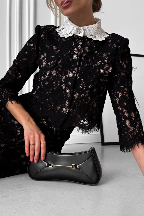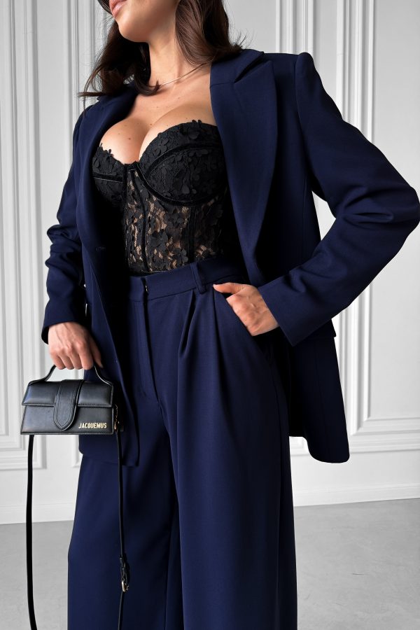 16 500 грн SKU: 1092Брючний костюм двійка: піджак з мереживною спиною та брюки клеш із перлами Піджак прилеглого силуету, з коміром шаль, з баскою, з мереживною спинкою, з застібкою спереду на два гудзики Штани клеш, з високою посадкою, із застібкою спереду на блискавку, з розрізами внизу, з перлами по бокових швах Склад тканини:… -