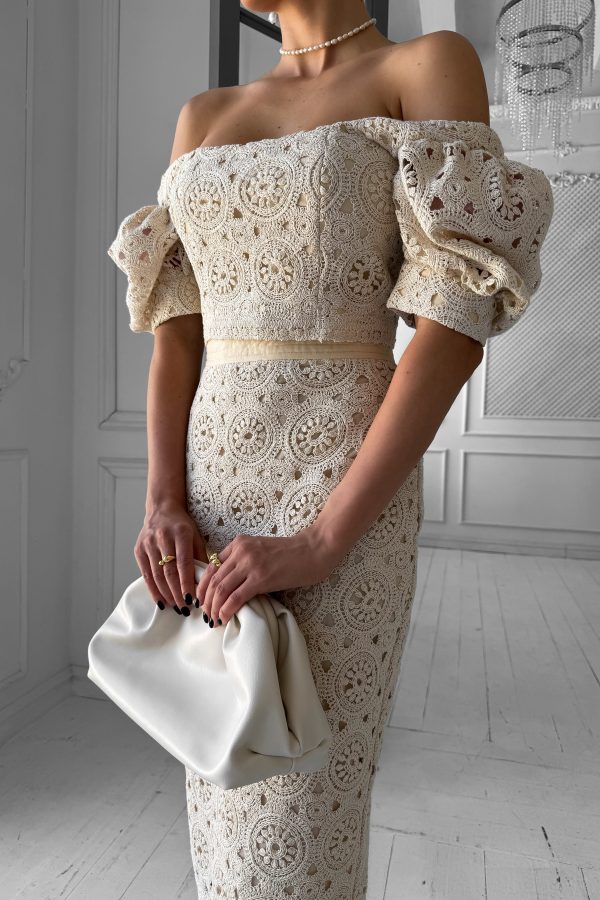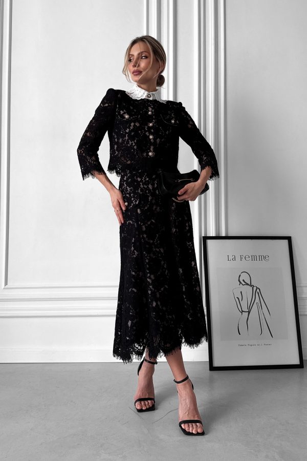 15 500 грн SKU: 1086Мереживний костюм міді: топ з білим коміром і спідниця. Топ прямого силуету, спідниця прилеглого силуету Топ із коміром, з рукавами 3/4, до талії, із застібкою спереду на гудзики Спідниця рік, з рівним поясом, з потайною застібкою ззаду Склад мережива: 70% віскоза, 30% поліестер Склад підкладки: 100% бавовна Колір мережива:… -