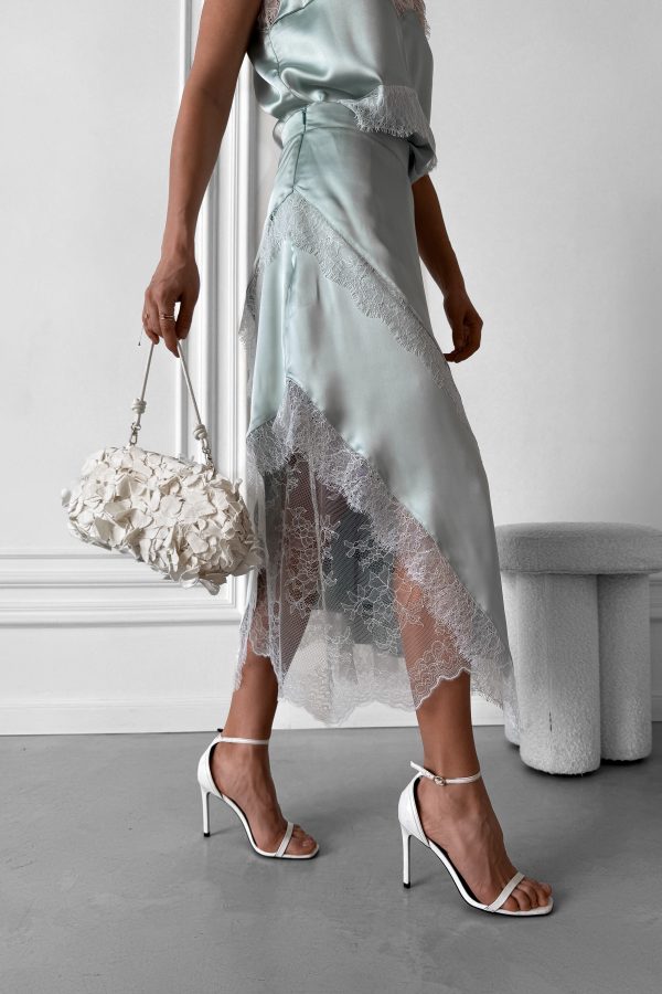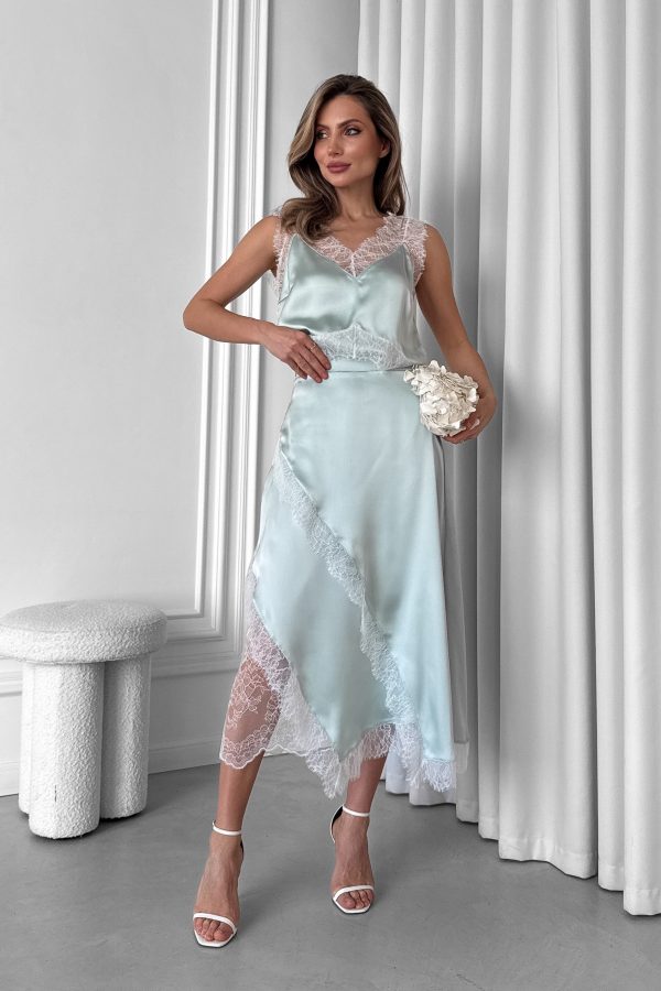 10 500 грн SKU: 1087Шовковий фісташковий комплект міді з мереживом: топ майка та асиметрична спідниця Топ прямого силуету, спідниця клеш Топ майка без рукавів, без застібки, з мереживом Спідниця трапеція, асиметрична, з потайною застібкою збоку, з мереживними вставками Склад тканини: 100% поліестер Склад підкладки: 100% віскоза Колір тканини: фісташковий Колір мережива: теплий білий… -
