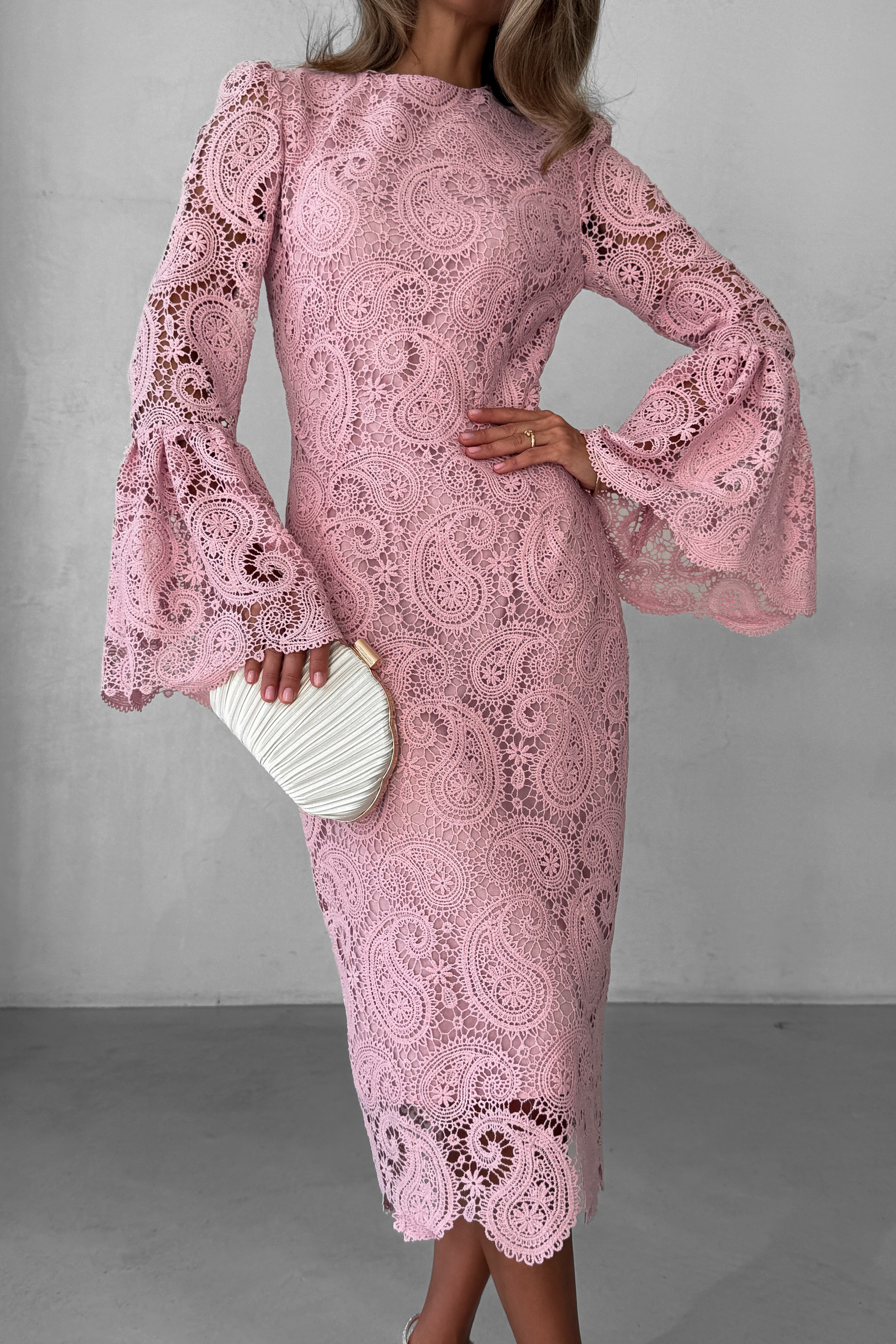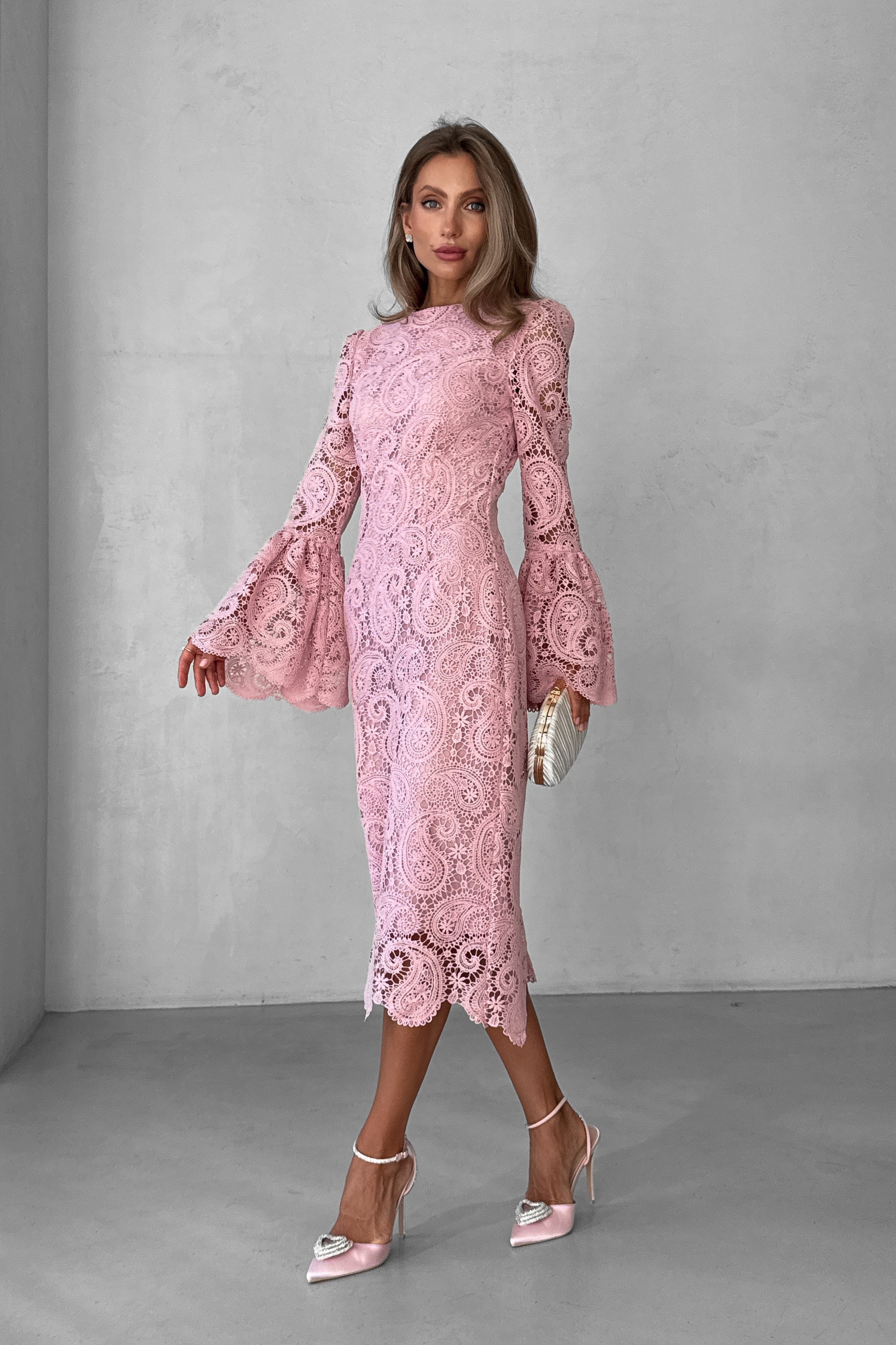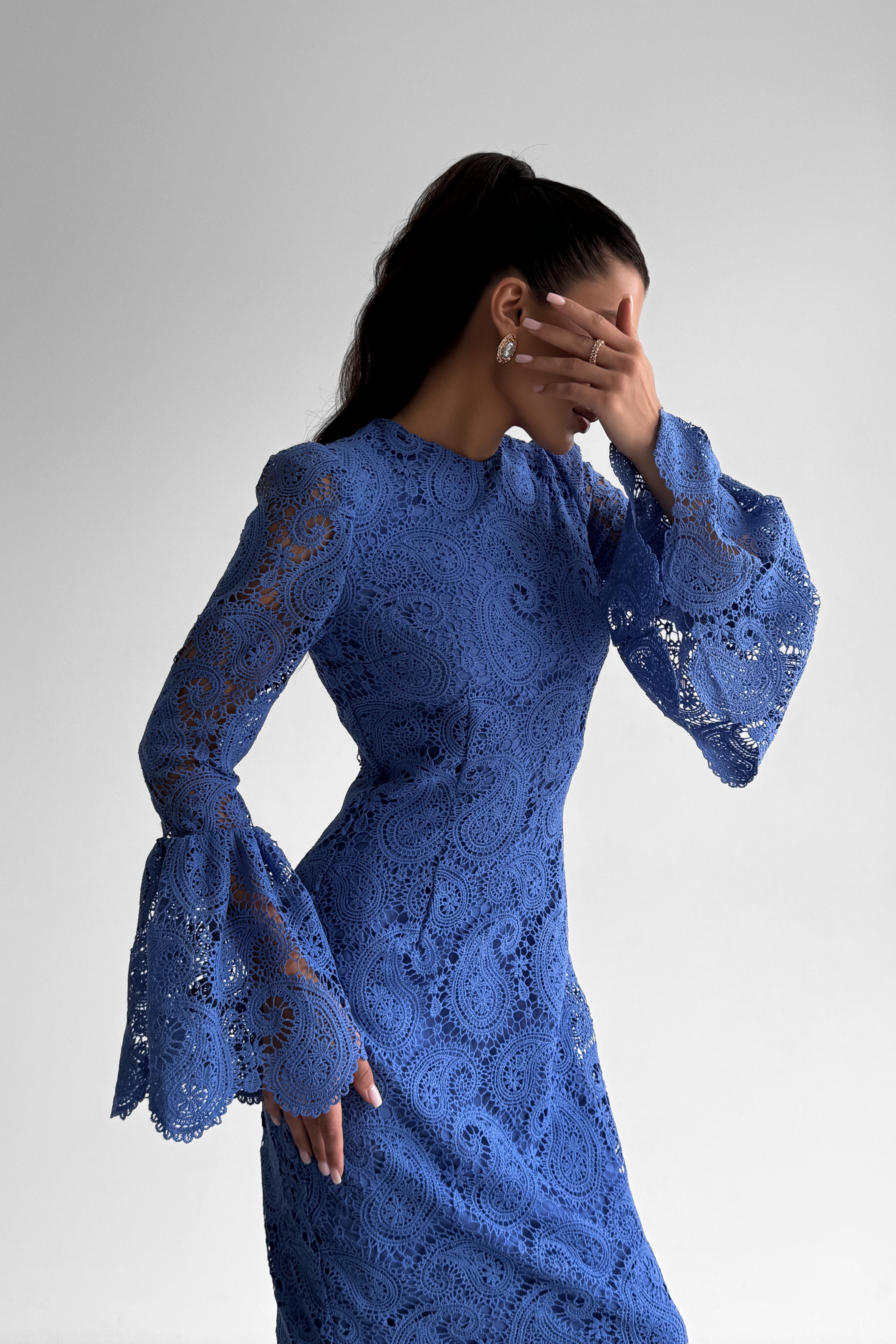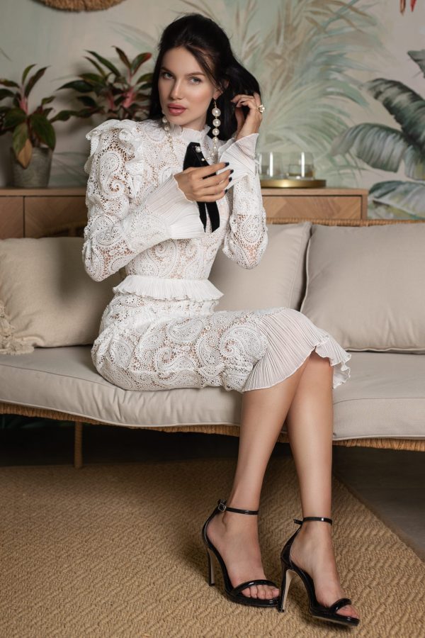 - Під шию, з довгими рукавами з об’ємними оборками внизу, з потайною застібкою на спинці