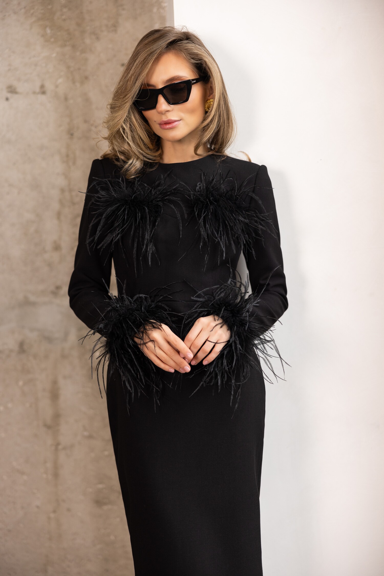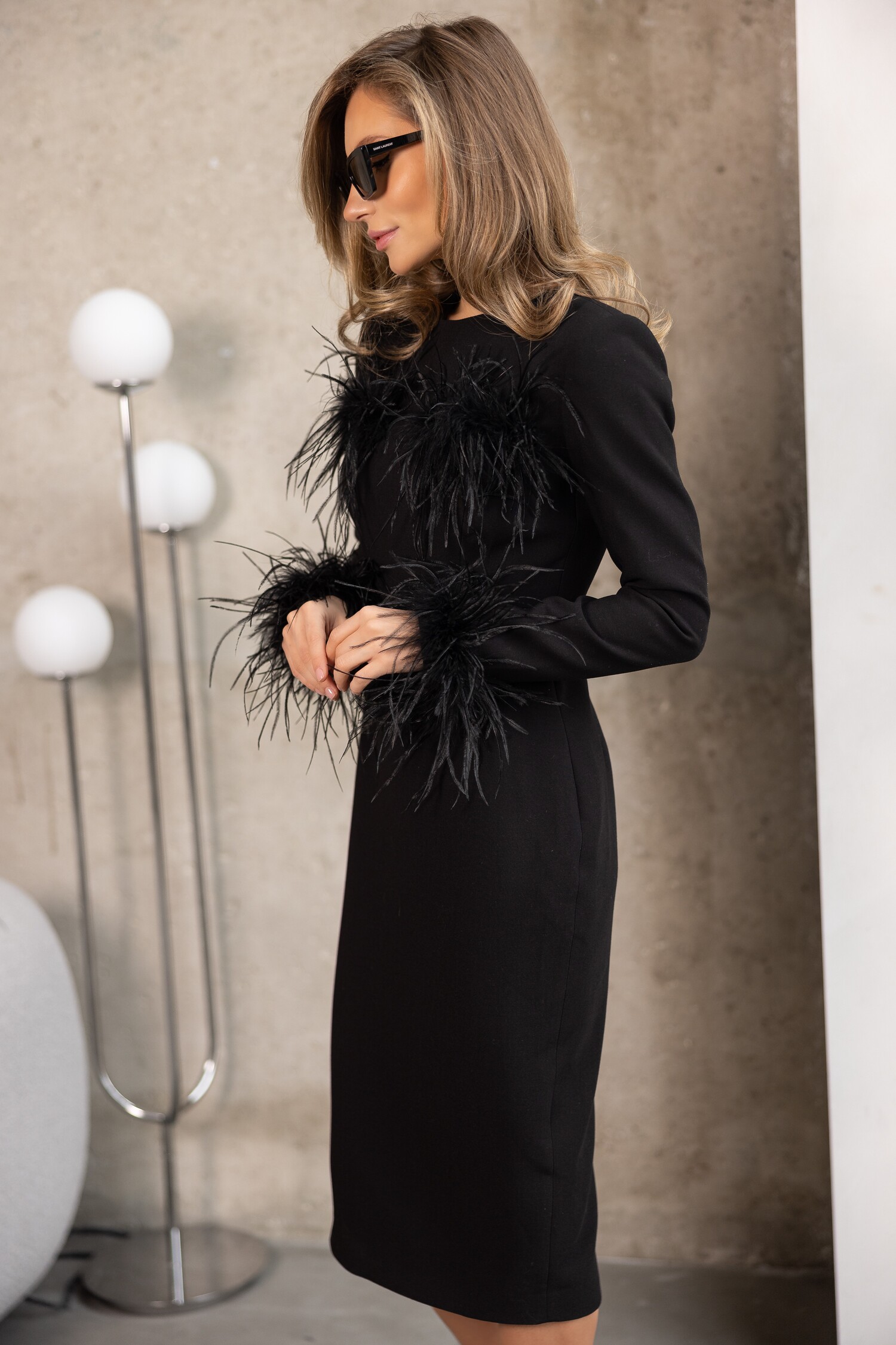 Силуетна сукня міді зі знімним пір’ям на грудях