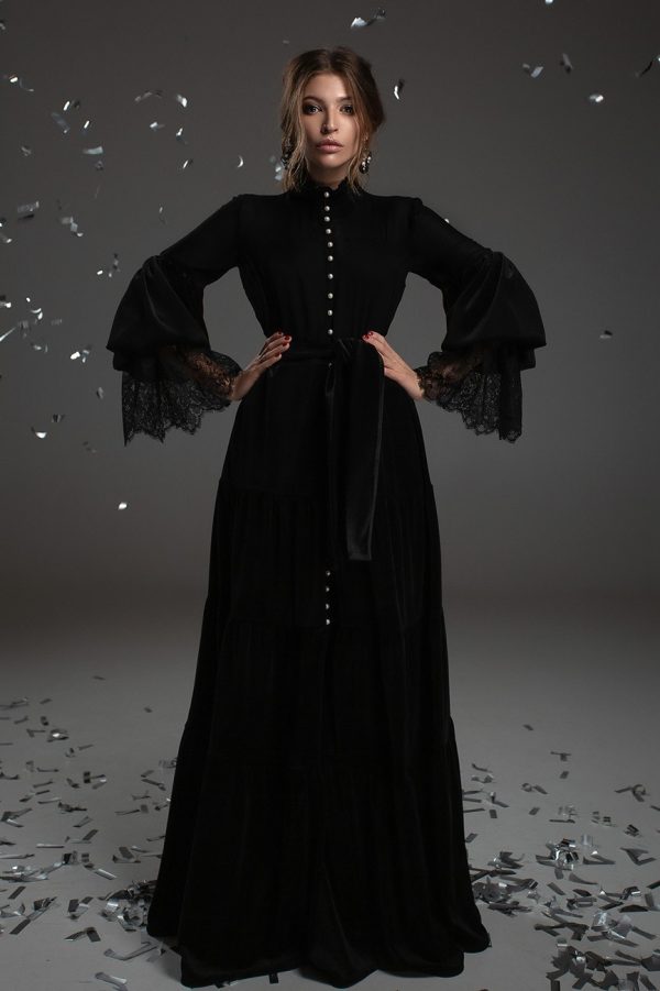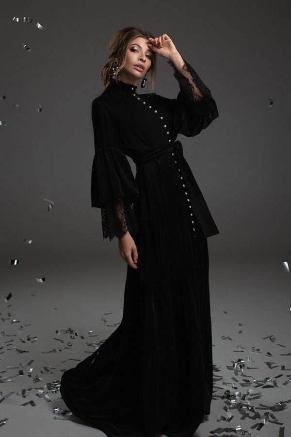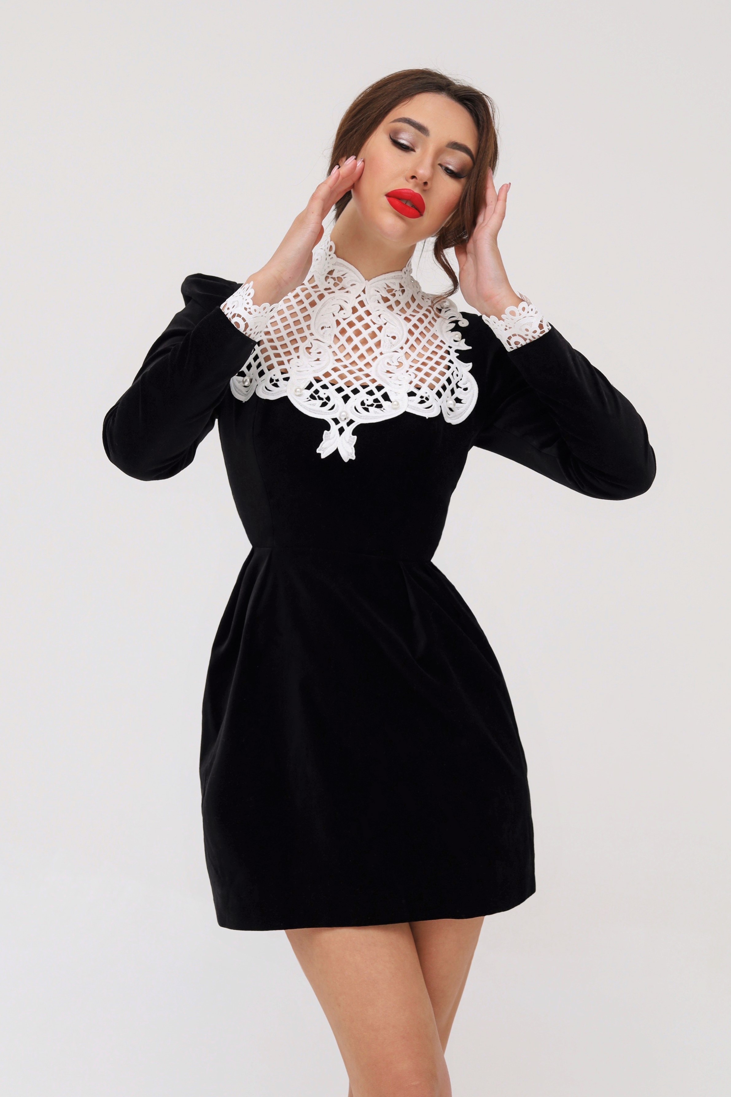 Оксамитова сукня тюльпан з мереживною кокеткою, що знімається.