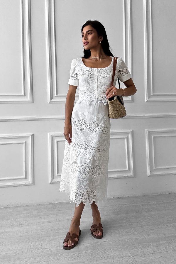 Бавовняна спідниця трапеція з вишивкою Білі Лілії, з розрізом на нозі